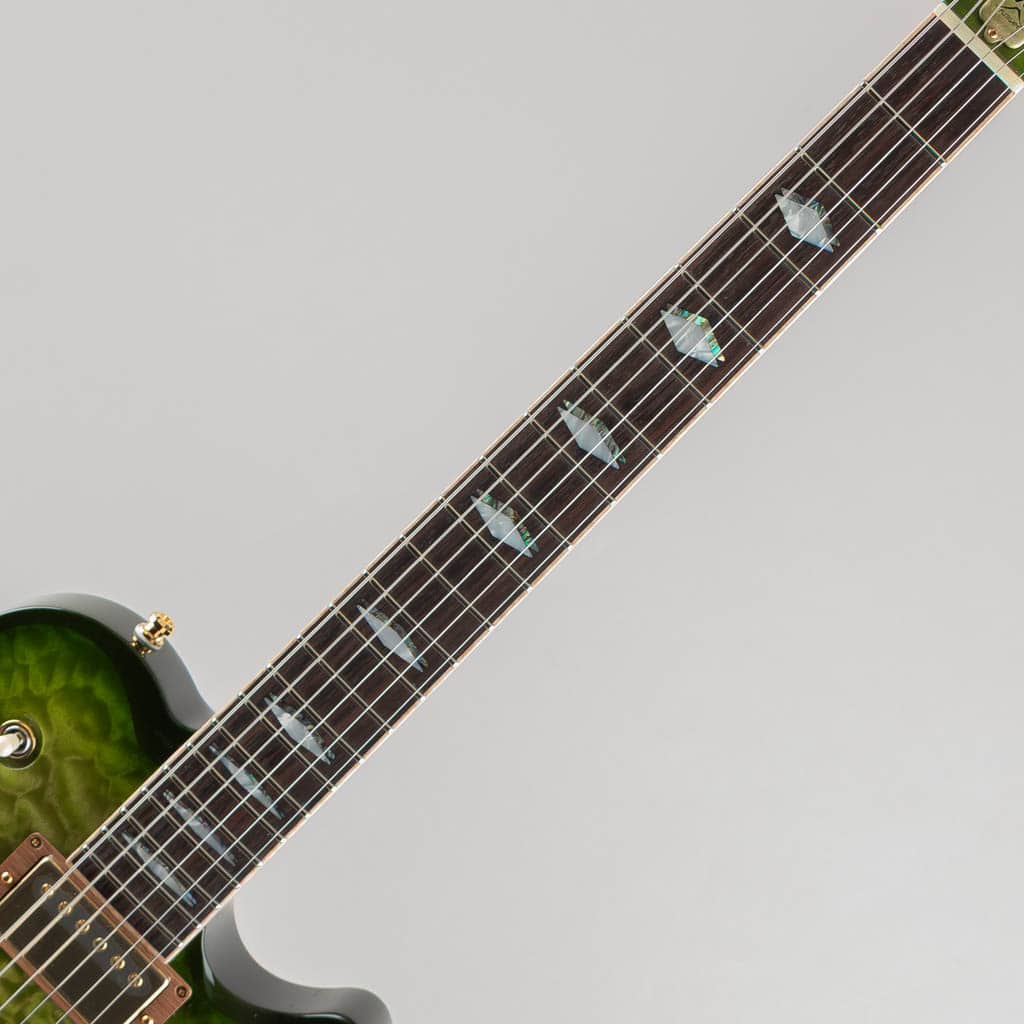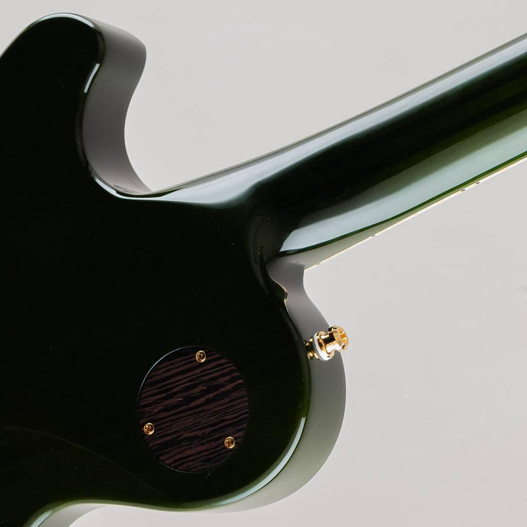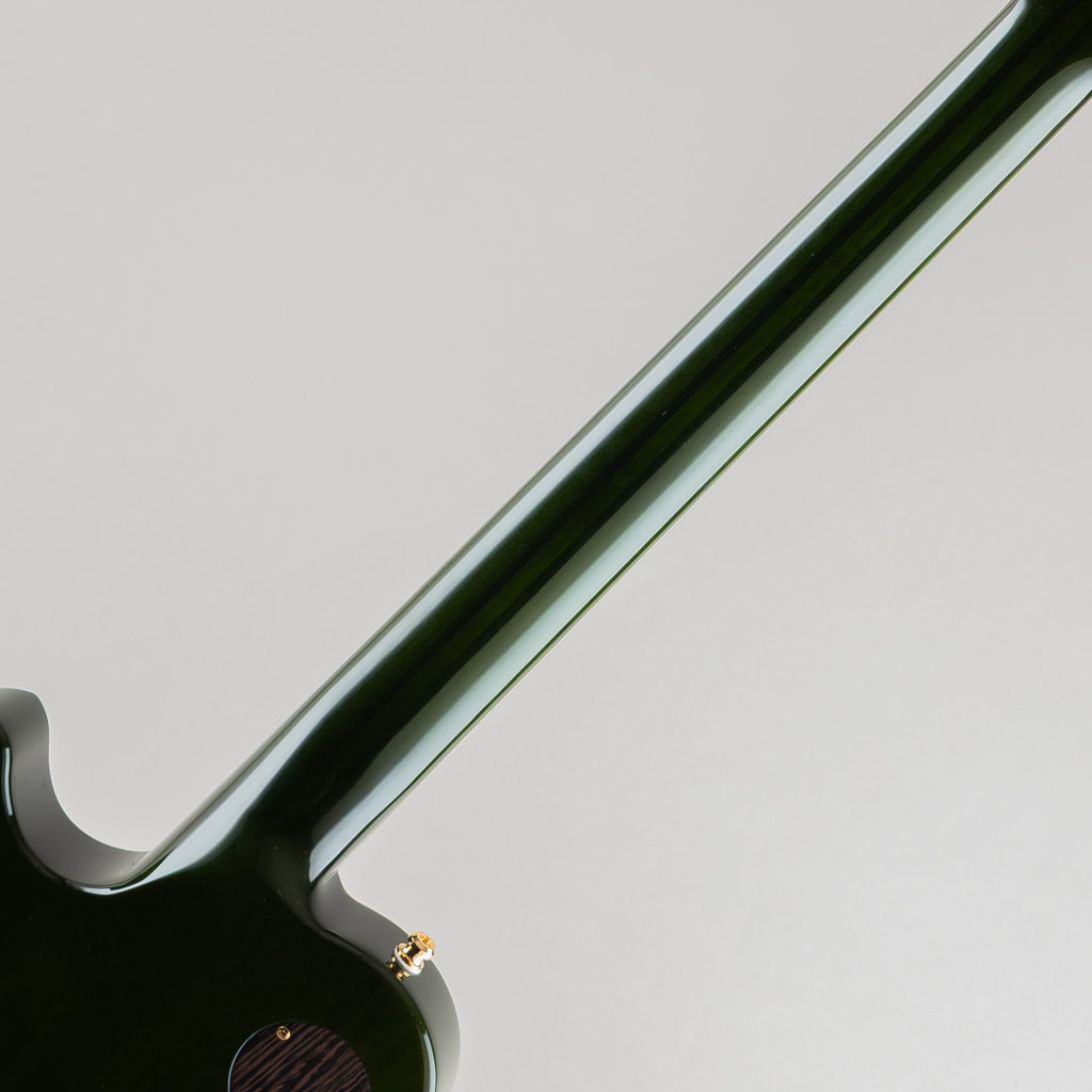 セットネックモデルのフラグシップであるExpert FLAME(EFL)をベースに細部にまでこだわったMVFL200QM。カラーは国産ならではの意を込めて緑茶バーストと名付けました。見るものを魅了する鮮やかな5Aグレードのキルトメイプルとホンジュラスマホガニーボディ。ボディトップは通常の貼り合わせとは異なり、バック材を中抜きしトップ材を落とし込む入れ子構造を採用。過去Virtuosoシリーズにのみ行われた技法を特別にリクエストいたしました。設置面積が広く、よりタイトにより鳴りを活かした職人の技術が垣間見えます。ネックは剛性も考慮したマホガニー&パープルハートの5ピースネックにローズウッド指板。サイドバインディングにはこちらも杢の美しい5Aグレードのフレイムメイプルを使用。今回の木材は全て現地で選定し数多くある銘木からハンドセレクトさせていただきました。
