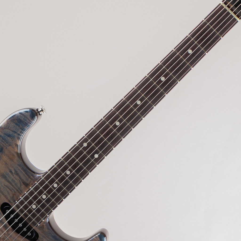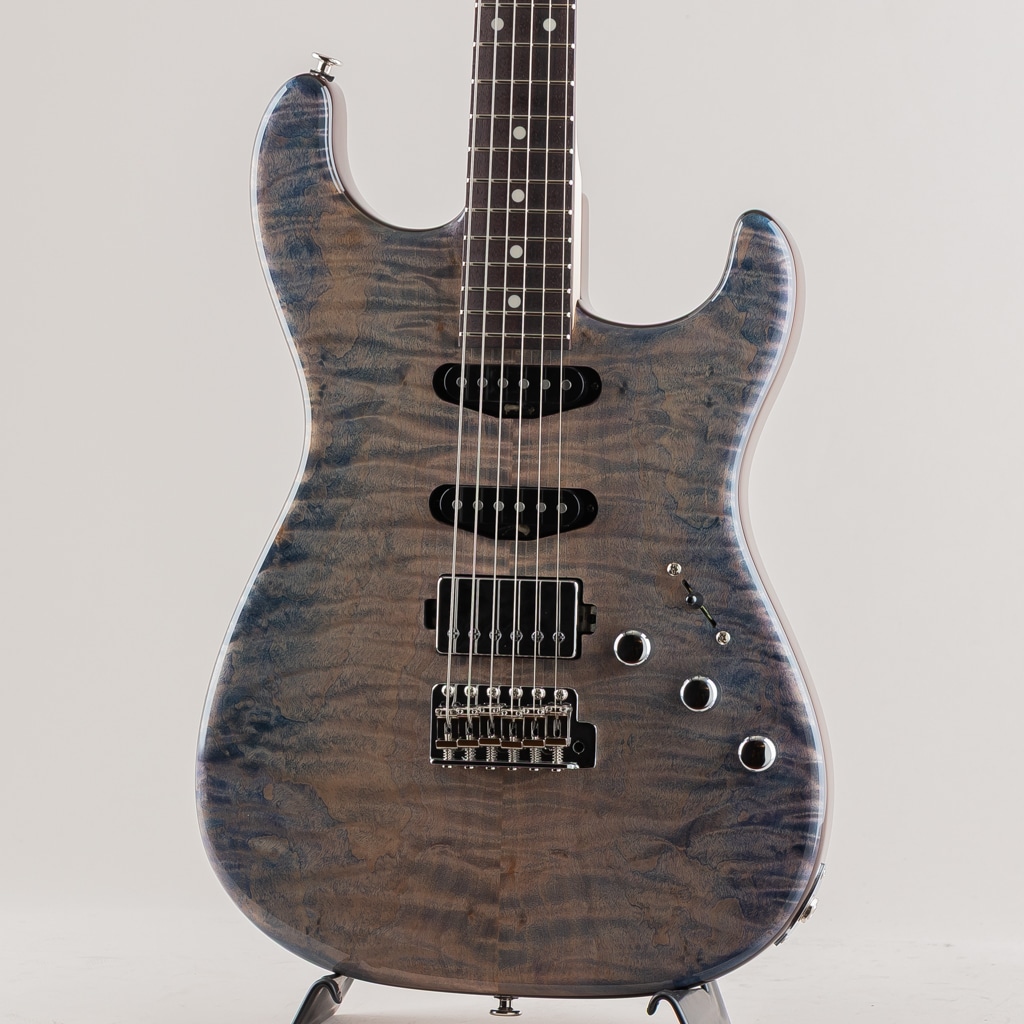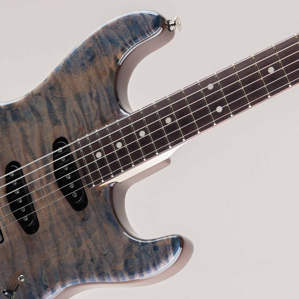 今回入荷しました1本は目の詰まった杢の美しいフレイムトチトップ、ブルーとパープルの鮮やかなグラデーションフィニッシュを採用した弊店オーダーモデル。ピックアップにはmomoseオリジナルVS-1とBEANOを搭載したSSHレイアウトのダイレクトマウント仕様。様々な音楽ジャンルに対応する歯切れの良さとPAFを彷彿とさせる枯れたヴィンテージトーンを出力します。飛鳥工場秘蔵の貴重な木材を余すことなく使用した極上の1本。この機会に是非ご検討くださいませ。