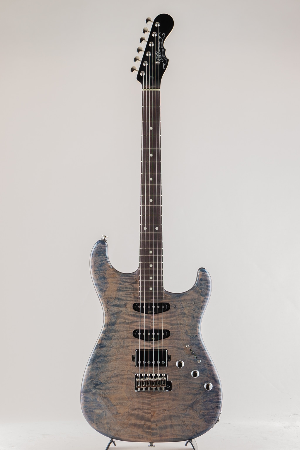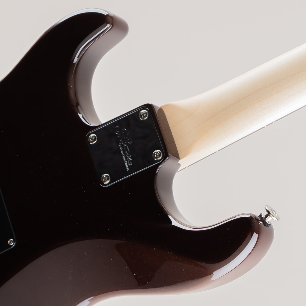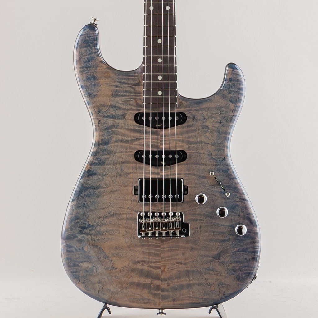 今回入荷しました1本は目の詰まった杢の美しいフレイムトチトップ、ブルーとパープルの鮮やかなグラデーションフィニッシュを採用した弊店オーダーモデル。ピックアップにはmomoseオリジナルVS-1とBEANOを搭載したSSHレイアウトのダイレクトマウント仕様。様々な音楽ジャンルに対応する歯切れの良さとPAFを彷彿とさせる枯れたヴィンテージトーンを出力します。飛鳥工場秘蔵の貴重な木材を余すことなく使用した極上の1本。この機会に是非ご検討くださいませ。