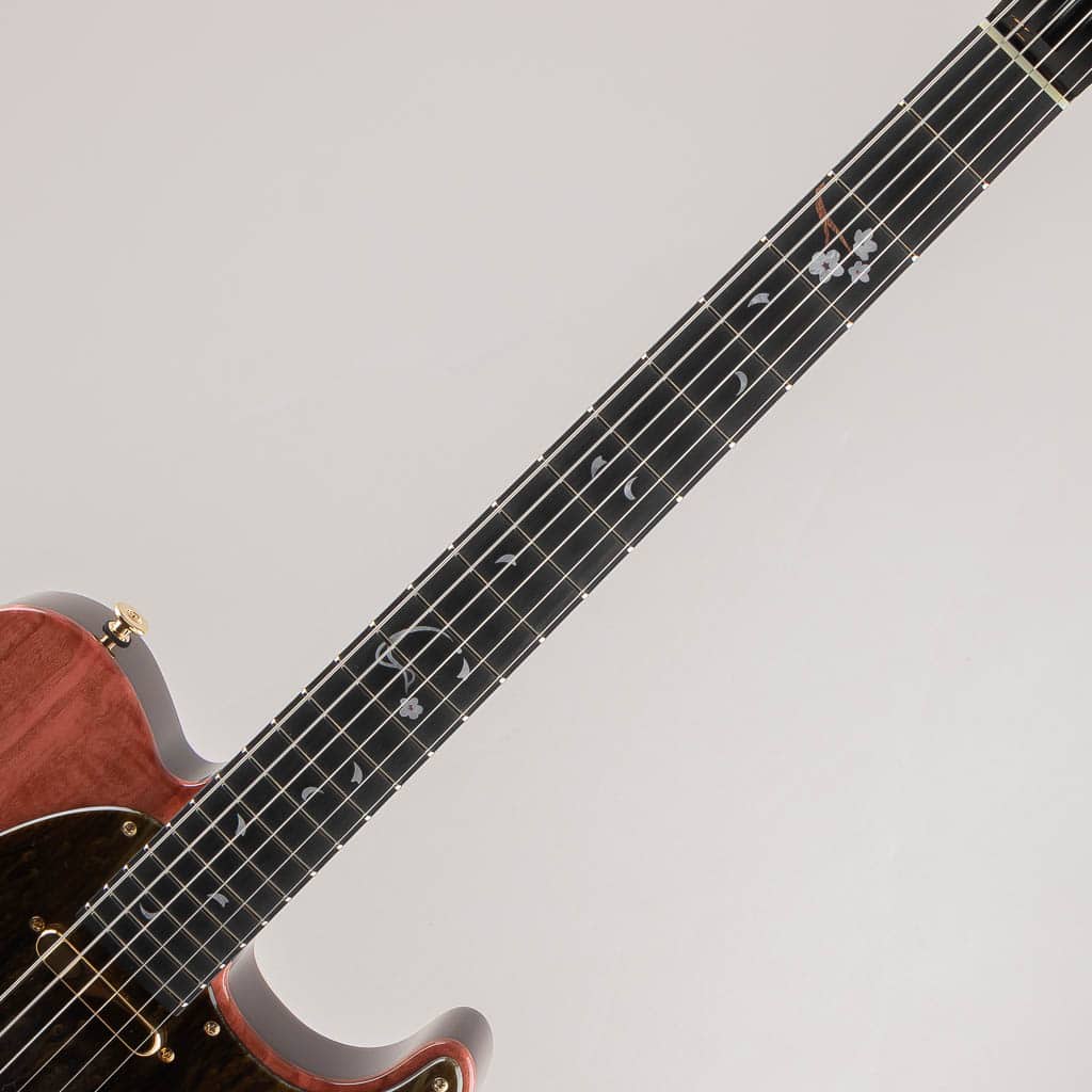 高級感のある色味のエボニー指板に舞い散るサクラをイメージしたインレイが施され、サクラ材ならではの赤みと杢目をいかしたグラデーション、ヘッドロゴにも散りばめられた桜の花びらなど特別感溢れる仕上がりとなっております。