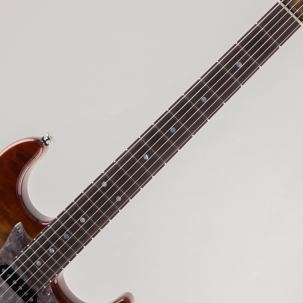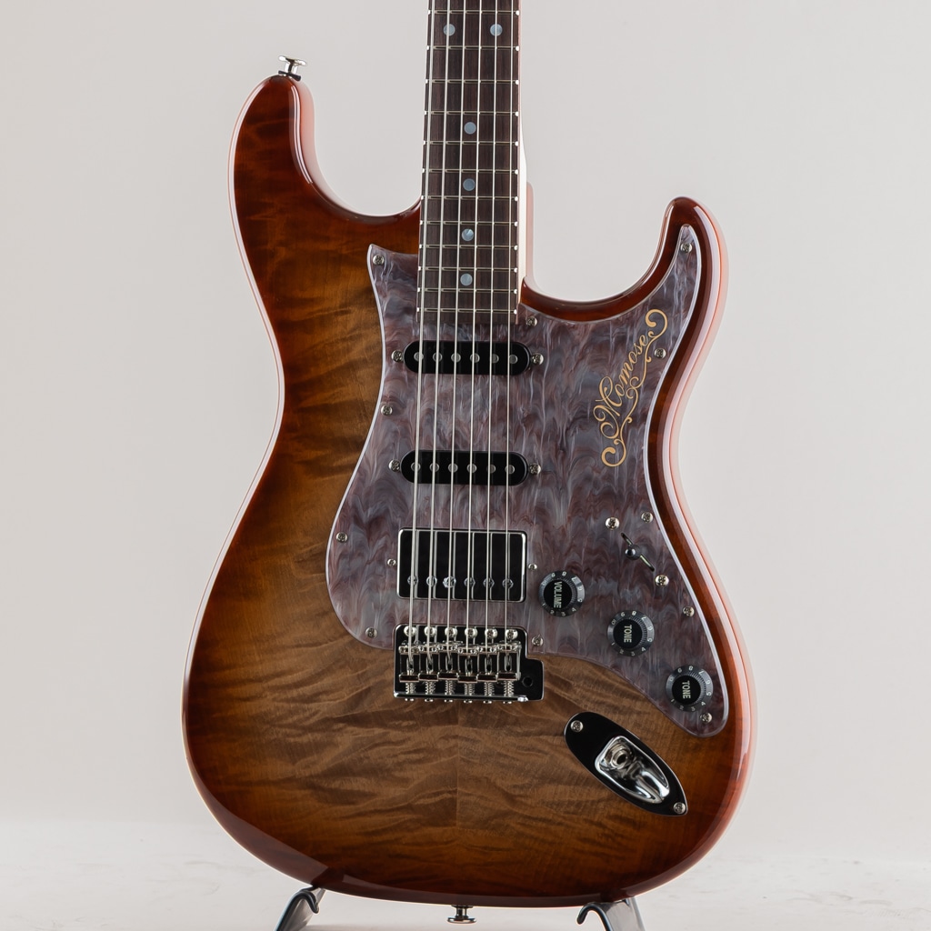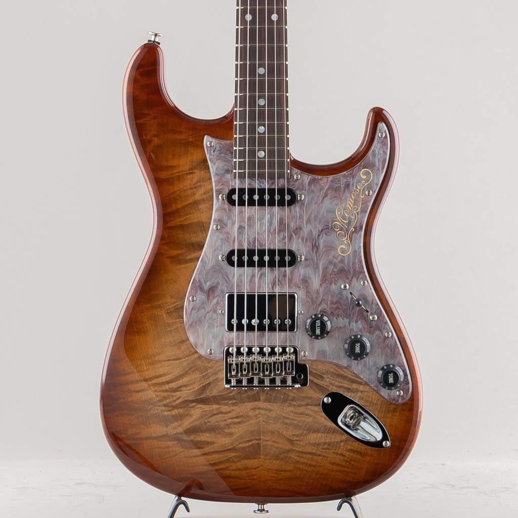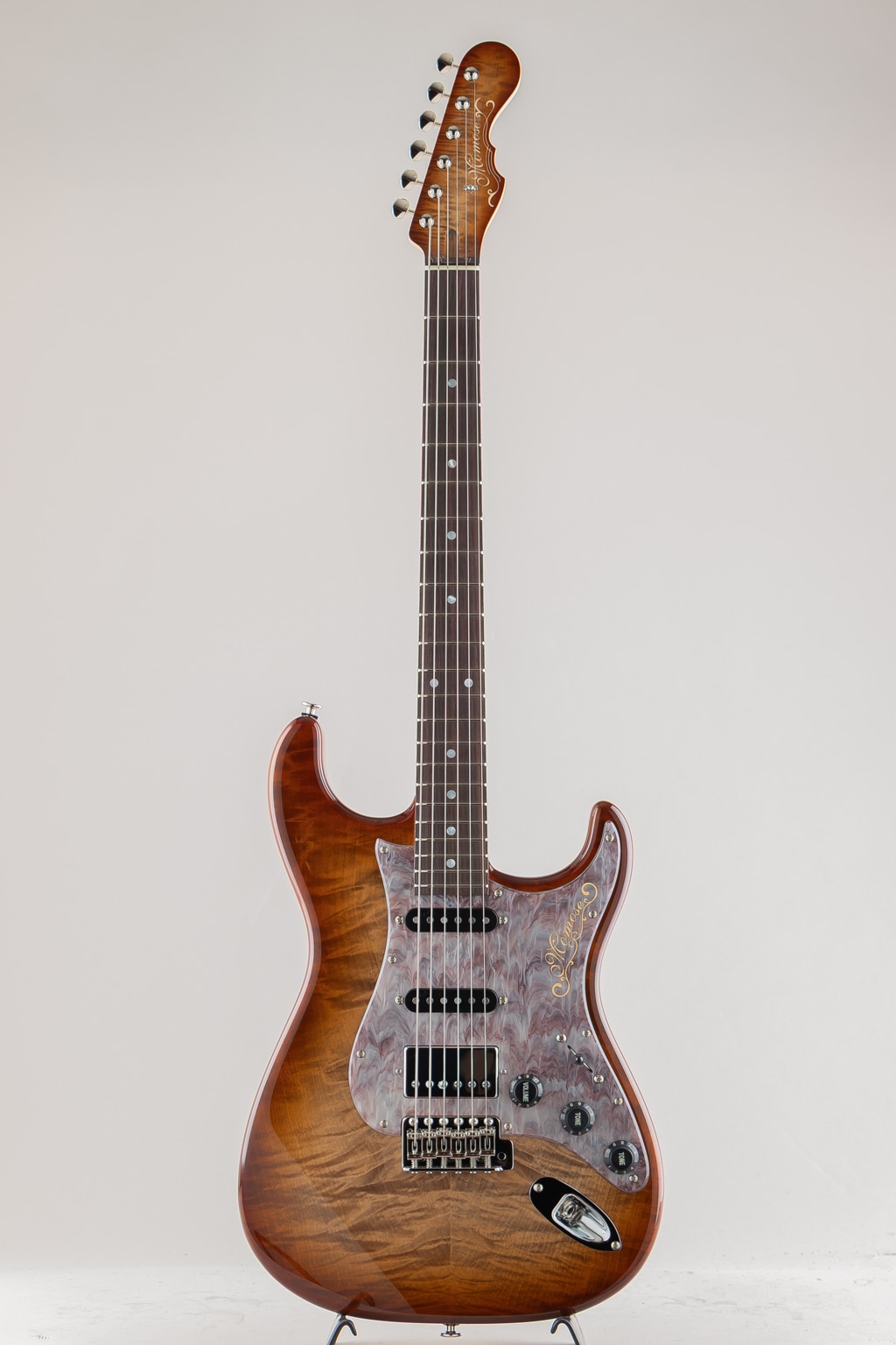 栃の杢目を活かす木地着色と色合いを乗せる中間着色を絶妙に使い分け仕上げたBlown-Burstにはがしマーブルのピックガードを組み合わせたショップオーダー品でございます。