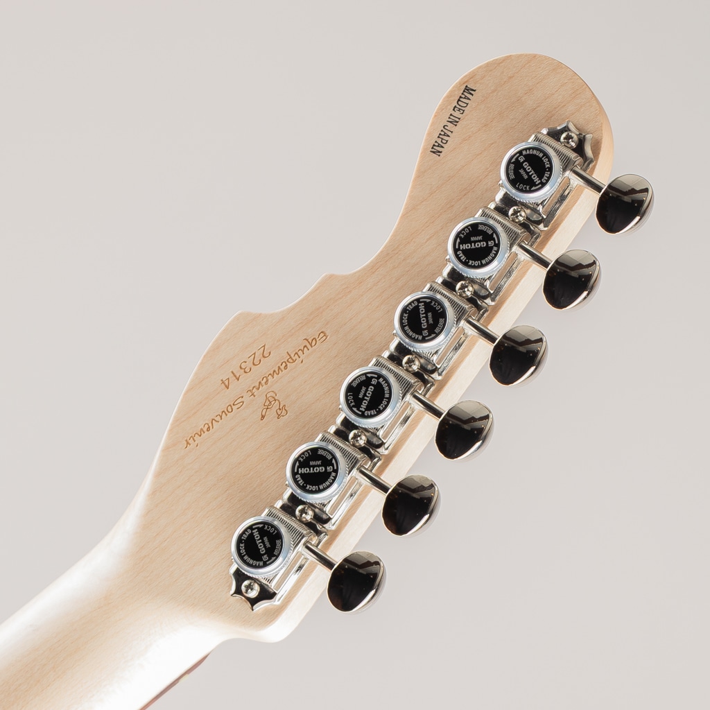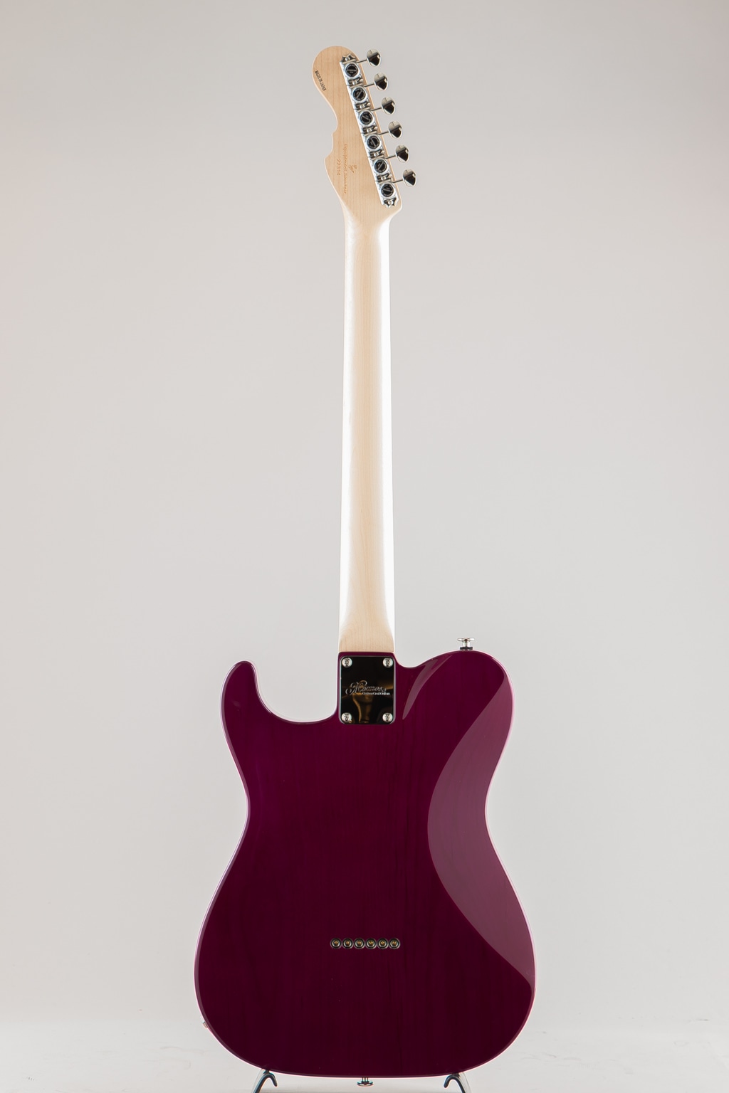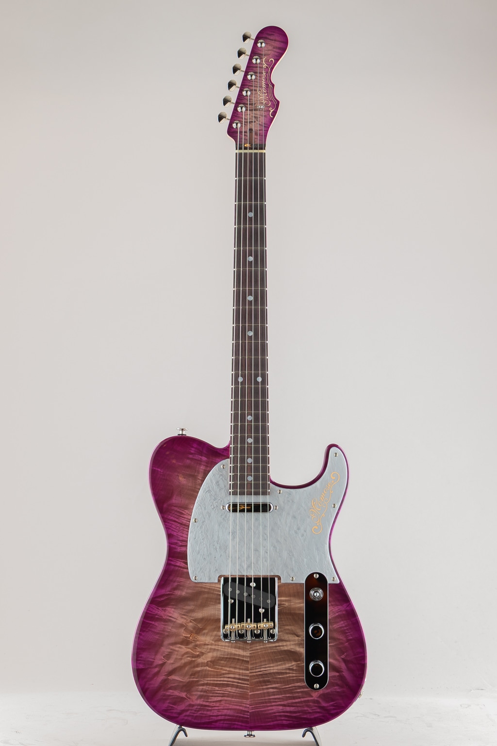 栃の杢目を活かす木地着色と色合いを乗せる中間着色を絶妙に使い分け仕上げたPurple-Burstが美しい栃の杢目とシルバーマーブルのピックガードの組み合わせにより一見派手目な印象ですが、妖艶でアダルトなルックスに仕上がった当店オーダーの一点ものとなっております。