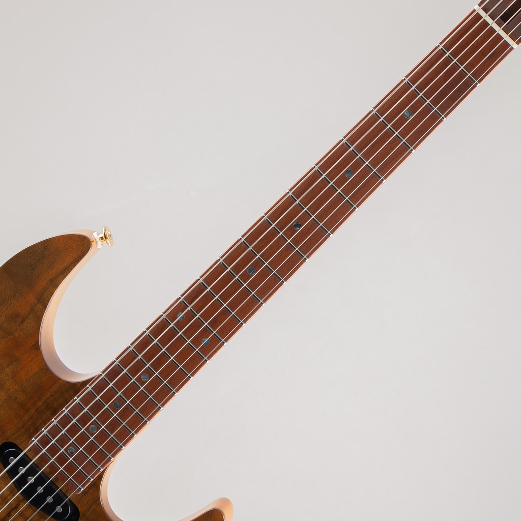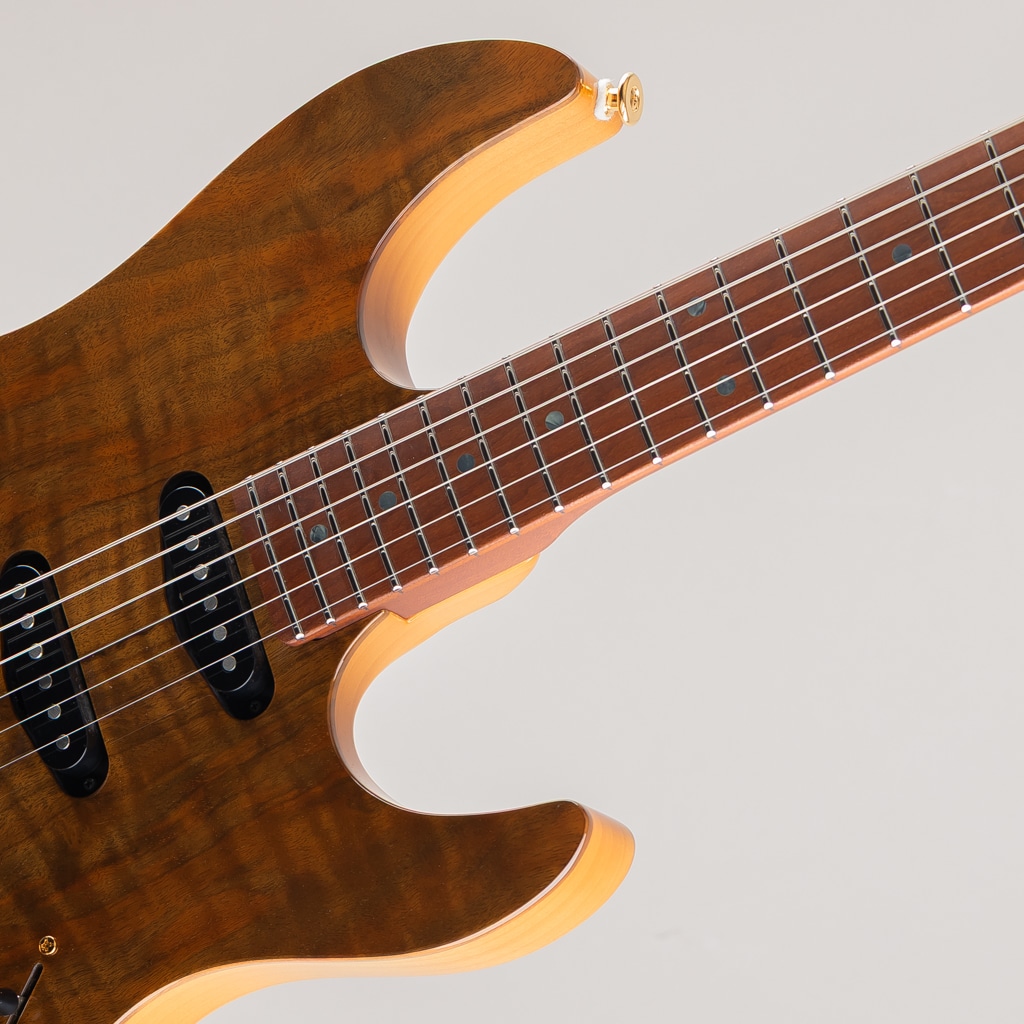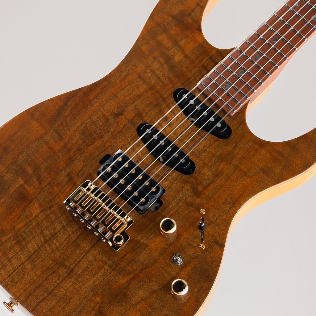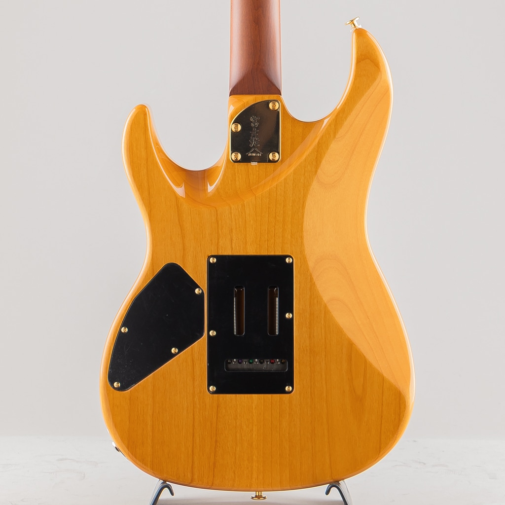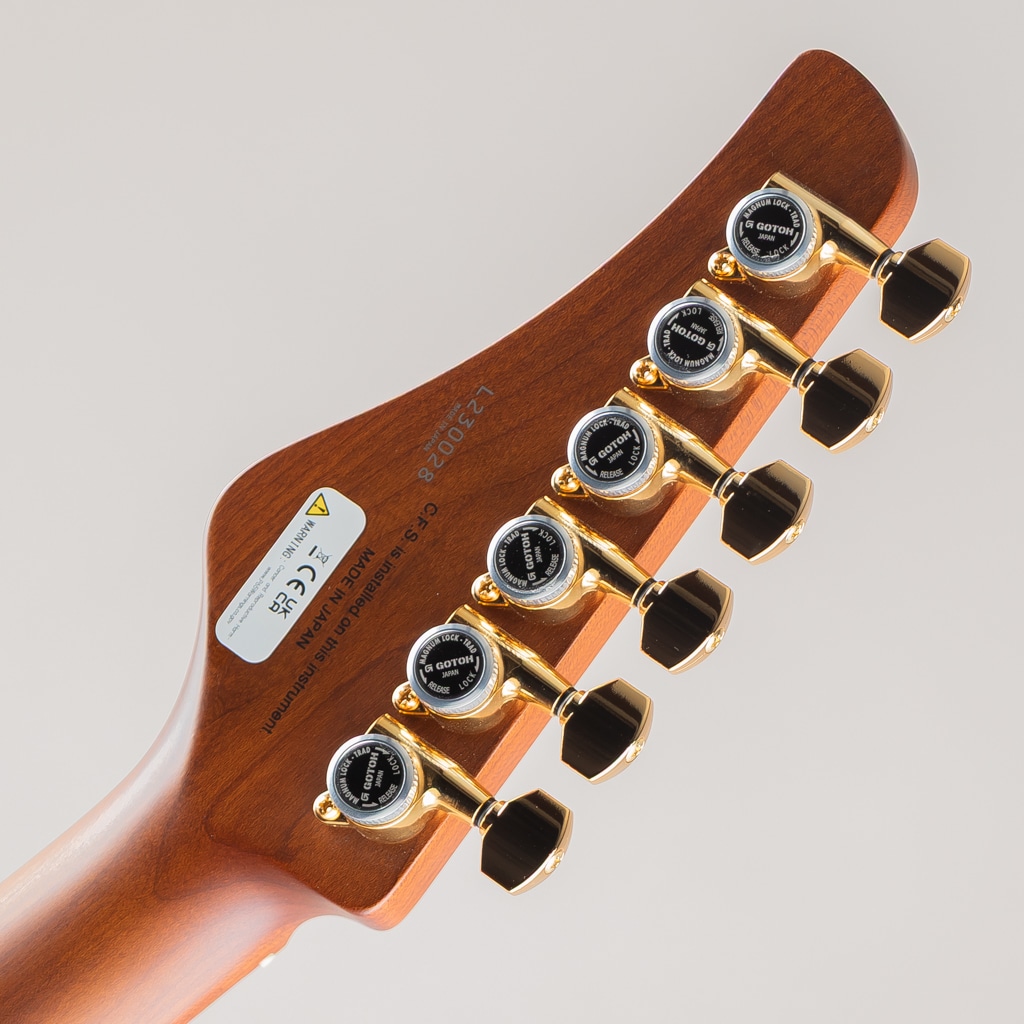 ピックアップはFGNオリジナルをSSHマウント。ブライトでキレのあるシングルコイルに加え、ホットなリアハムバッカーのみに作動するキルスイッチを搭載したトリッキーなコントロールが可能です。その他にも体にフィットしやすい形状のEXPERT OSオリジナルのコンター加工・エルボーカット、アーミング時の狂いを軽減するマグナムロックチューナーといった拘りが随所にみられます。