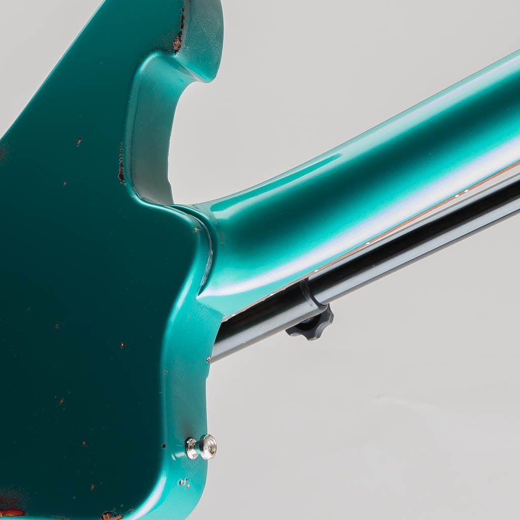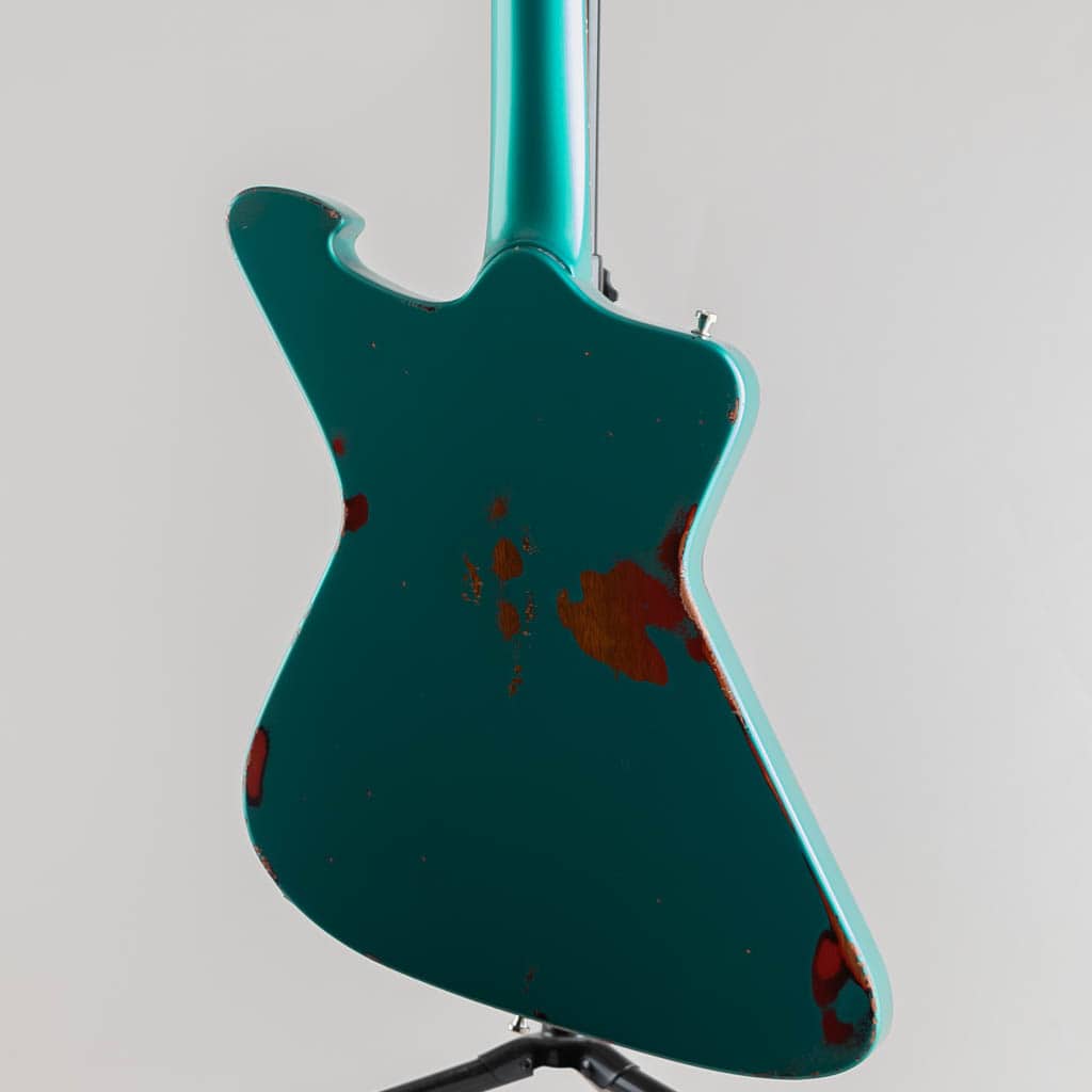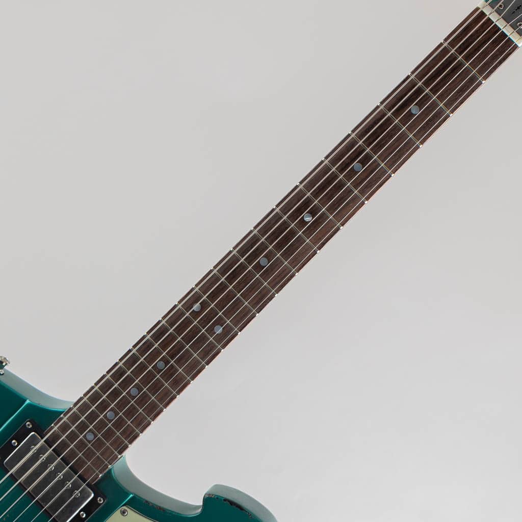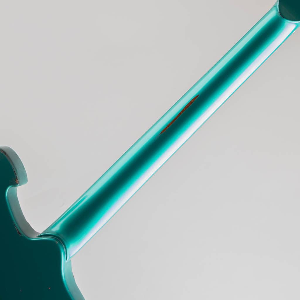塗装はマルチレイヤー仕様となっており表層のティールグリーンの下から、サンバーストが顔を覗かせることでヴィンテージライクな外観を演出するTeal Green Over Burst。グリーン部分のウェザーチェックも相まり非常に風格のある佇まいとなっております。また、ピックガードはボディテールのコントロール部までを大きくカバーする形状となっており、全体の独特なフォルムと合わさって、唯一無二の存在感を生み出しています。