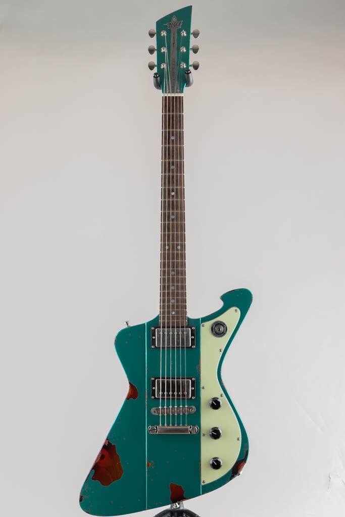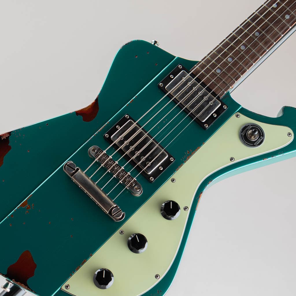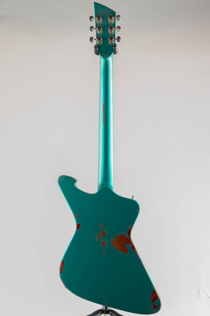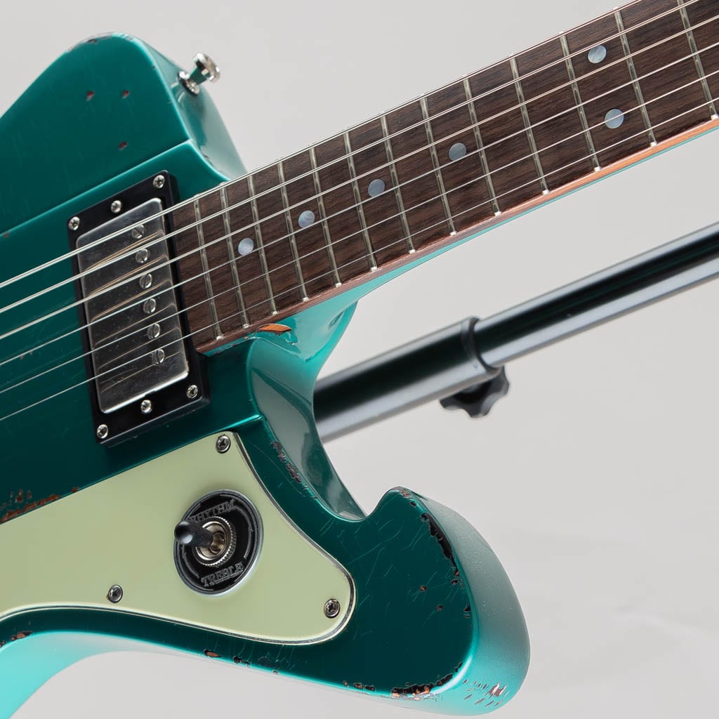 塗装はマルチレイヤー仕様となっており表層のティールグリーンの下から、サンバーストが顔を覗かせることでヴィンテージライクな外観を演出するTeal Green Over Burst。グリーン部分のウェザーチェックも相まり非常に風格のある佇まいとなっております。また、ピックガードはボディテールのコントロール部までを大きくカバーする形状となっており、全体の独特なフォルムと合わさって、唯一無二の存在感を生み出しています。