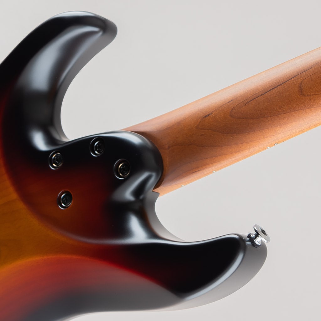 低音弦側のカッタウェイを浅めに設計しており、ボディとネックとの設地面積を最大化することで、高い演奏性を保持しながらもサスティーンとレゾナンスの良さをも両立しています。また、ホーンとカッタウェイはIbanezの代表機種であるRGを彷彿とさせる、抉りの大きな形状で、ハイポジションでの弾きやすさを実現しています。