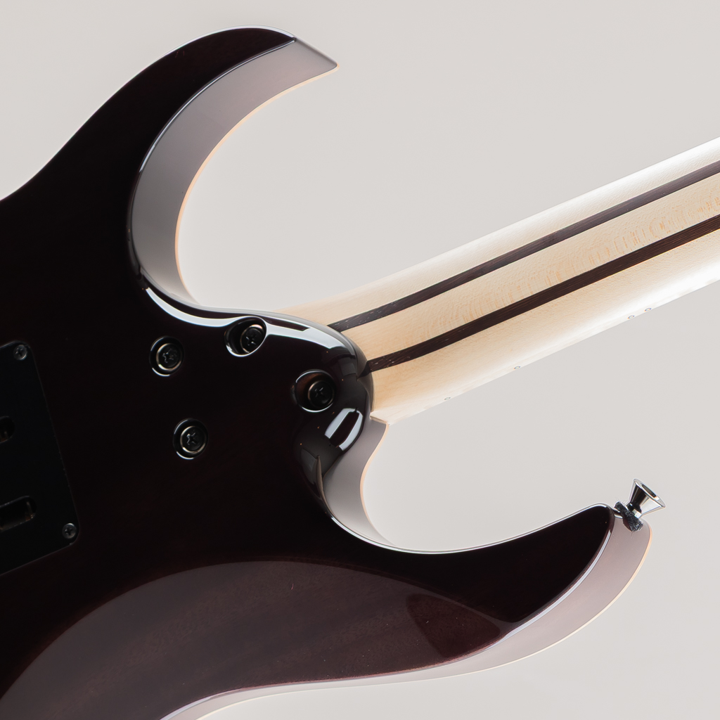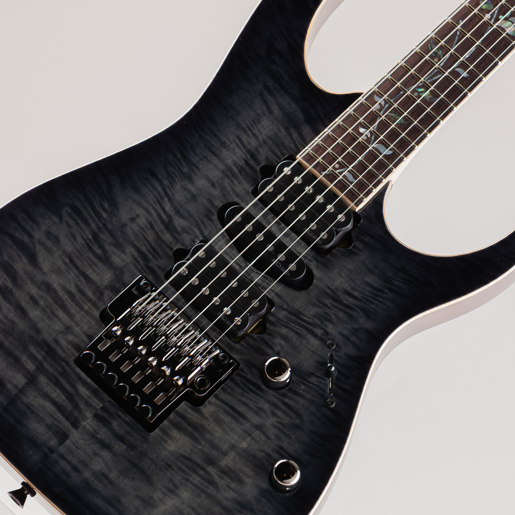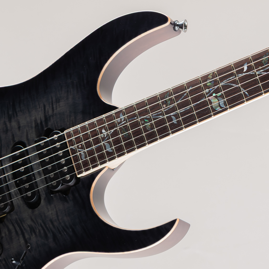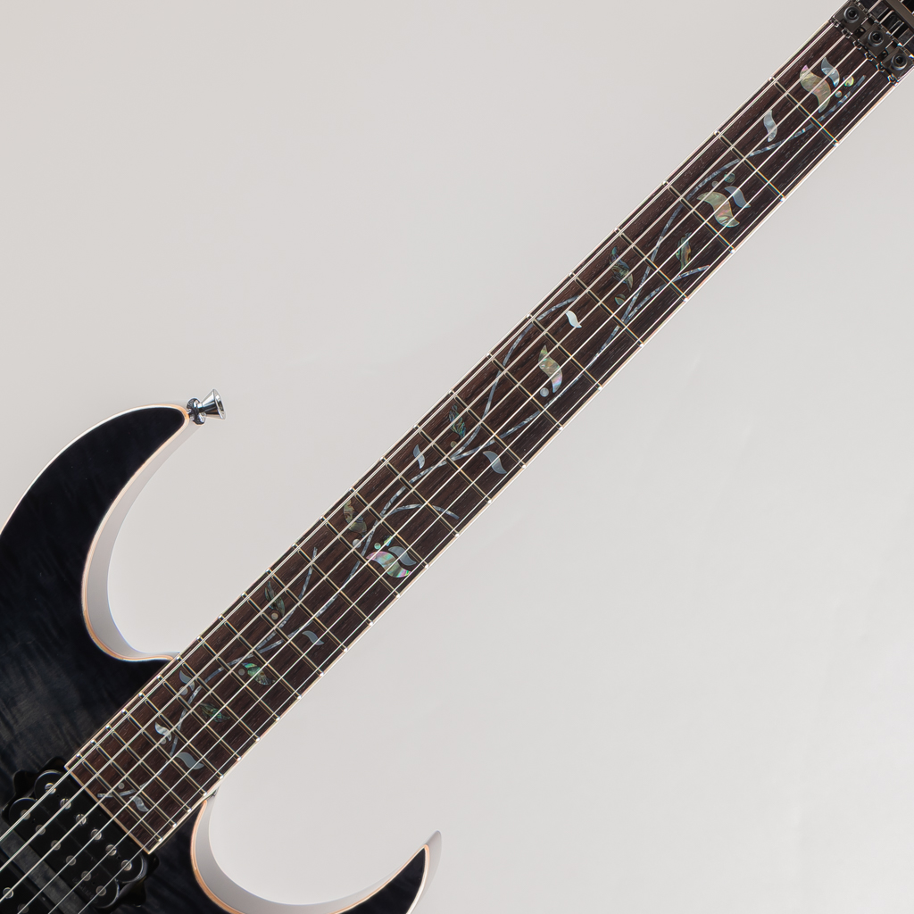 当機はボディ&ヘッドトップに鮮やかなAAAフレイムメイプル材を使用したマホガニーバックボディ。メイプル/ウェンジの5pcネック、指板にはマッカーサーエボニーを採用。旧約聖書に登場する、エデンの園の中央に植えられた「生命の樹」にインスピレーションを受けてデザインしたインレイ・デザインはMade In Japanならではの精緻な美を堪能できるポイントのひとつです。グリップはライブパフォーマンスを重要視し、演奏性の向上を追求した決定版とも言えるスリムネックRG j.custom Super Wizard neck。ブリッジにはロック式トレモロLo-Pro Edge bridgeを搭載しておりチューニングの安定性が高く演奏面もしっかり考慮されております。