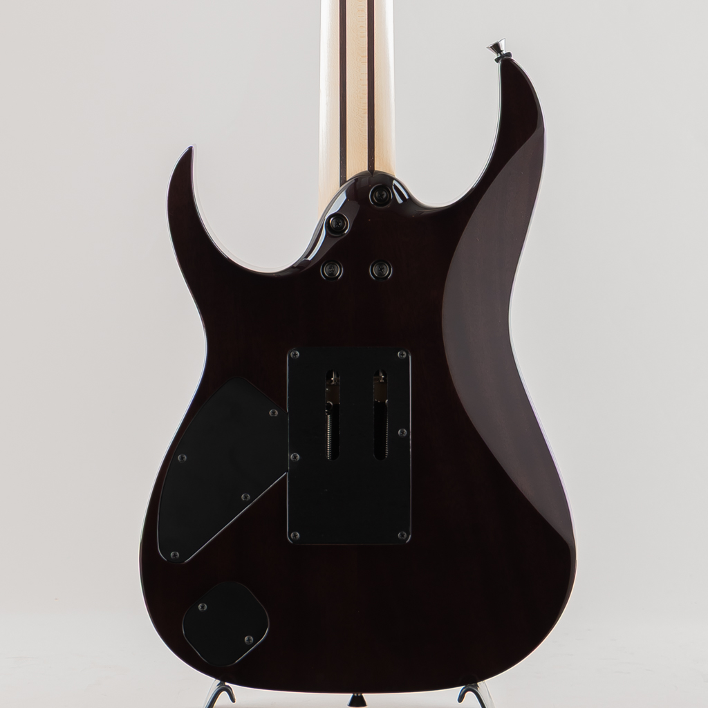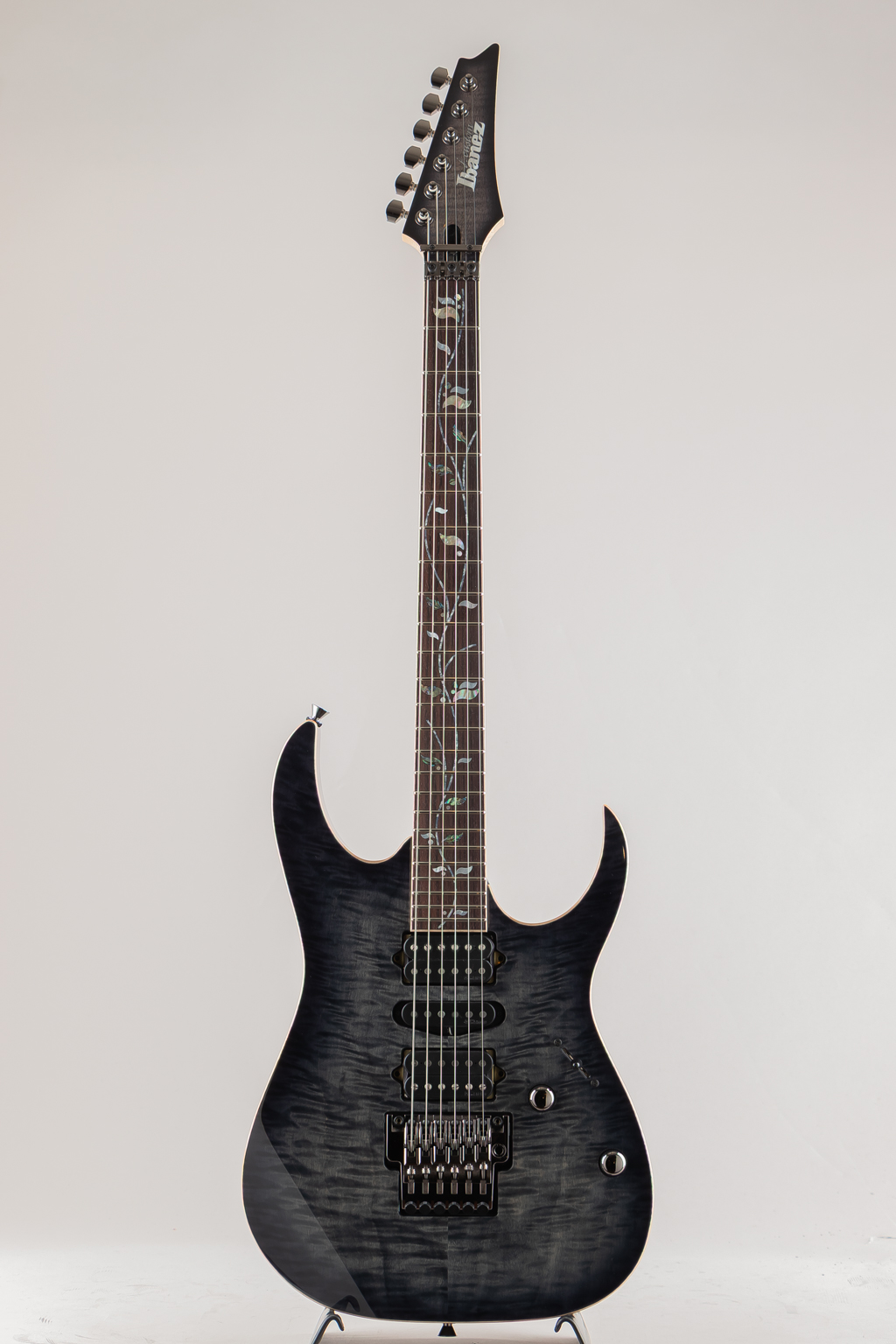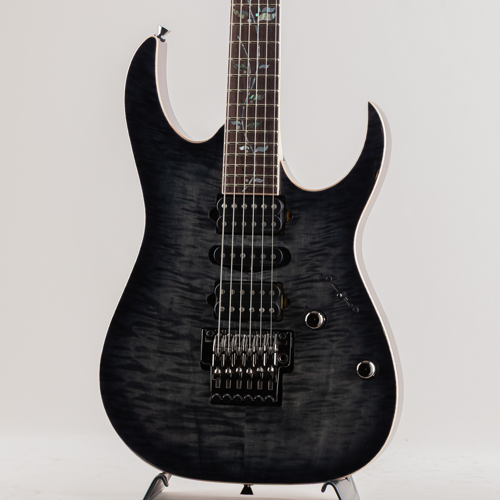 当機はボディ&ヘッドトップに鮮やかなAAAフレイムメイプル材を使用したマホガニーバックボディ。メイプル/ウェンジの5pcネック、指板にはマッカーサーエボニーを採用。旧約聖書に登場する、エデンの園の中央に植えられた「生命の樹」にインスピレーションを受けてデザインしたインレイ・デザインはMade In Japanならではの精緻な美を堪能できるポイントのひとつです。グリップはライブパフォーマンスを重要視し、演奏性の向上を追求した決定版とも言えるスリムネックRG j.custom Super Wizard neck。ブリッジにはロック式トレモロLo-Pro Edge bridgeを搭載しておりチューニングの安定性が高く演奏面もしっかり考慮されております。
