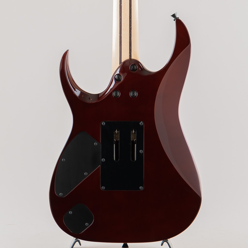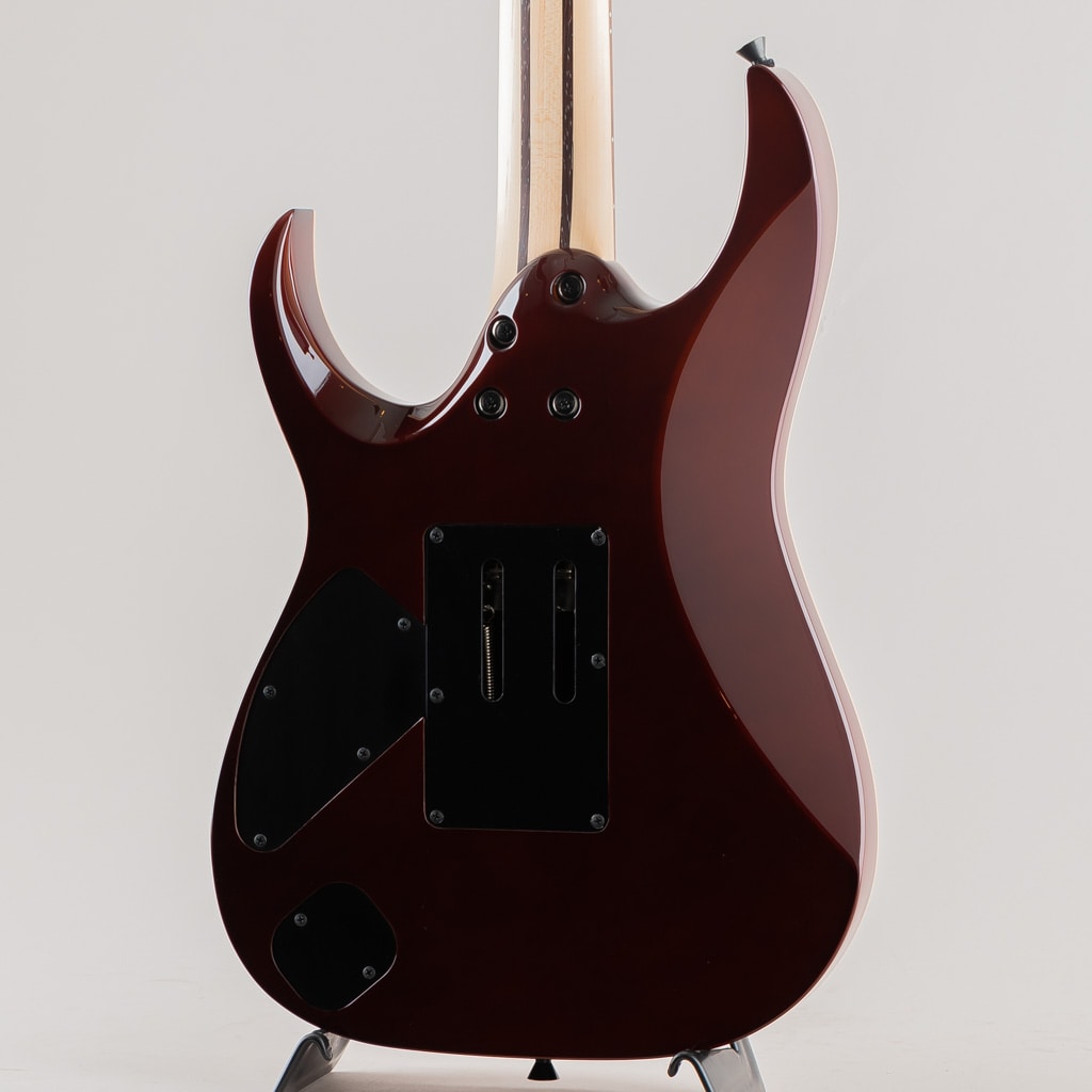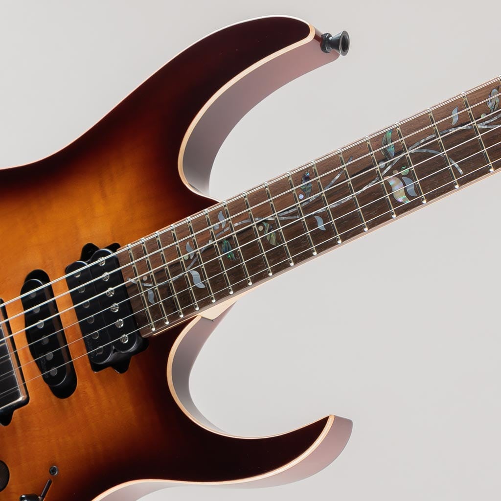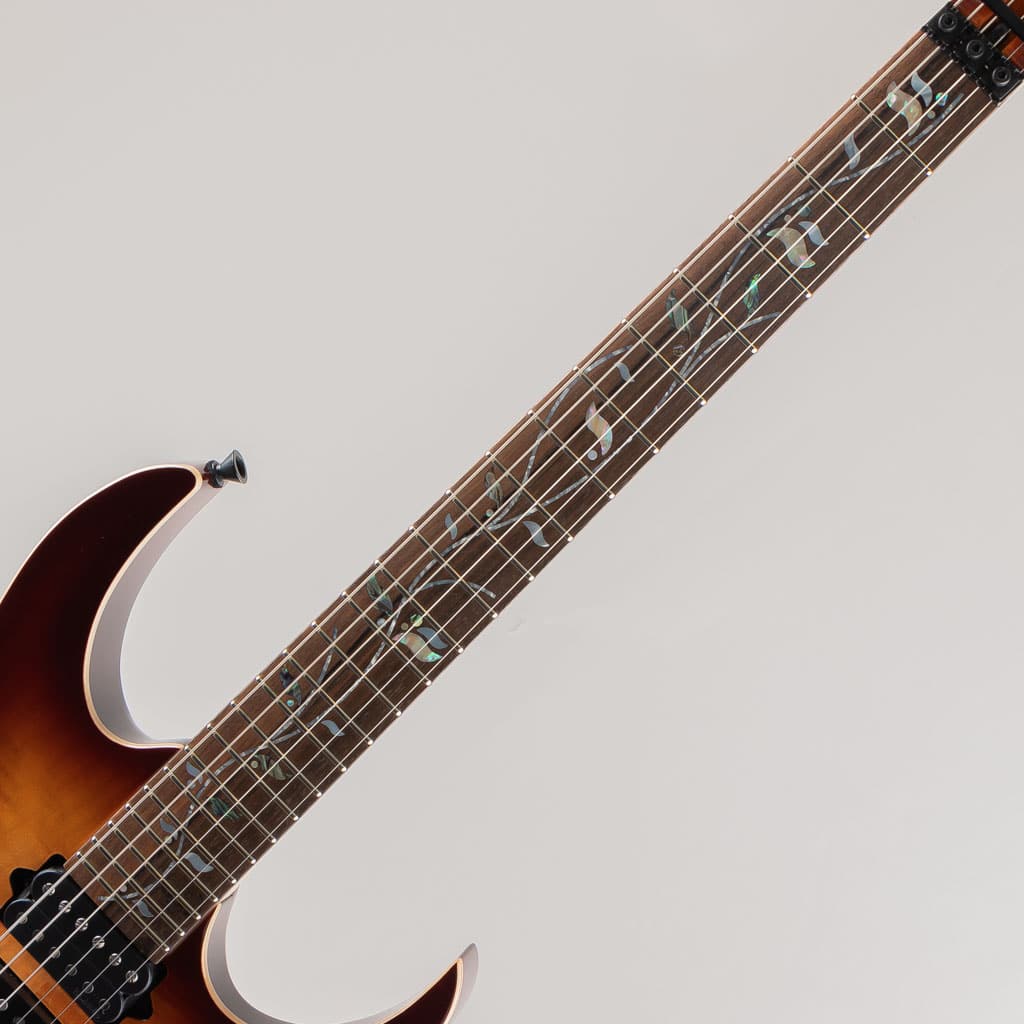 当機RG8870はボディ&ヘッドトップに鮮やかなフレイムメイプル材を使用したアルダーボディ。メイプル/ウェンジの5pcネック、指板にはマッカーサーエボニーを採用。旧約聖書に登場する、エデンの園の中央に植えられた「生命の樹」にインスピレーションを受けてデザインしたインレイ・デザインはMade In Japanならではの精緻な美を堪能できるポイントのひとつです。グリップはライブパフォーマンスを重要視し、演奏性の向上を追求した決定版とも言えるスリムネックRG j.custom Super Wizard neck。ブリッジにはロック式トレモロLo-Pro Edge bridgeを搭載しておりチューニングの安定性が高く演奏面もしっかり考慮されております。また今回のRGは軽量化を取り入れるべく、ボディには表面にチェンバー加工が施されており全てにおいてプレイヤー重視の本格的なスペックが採用されております。