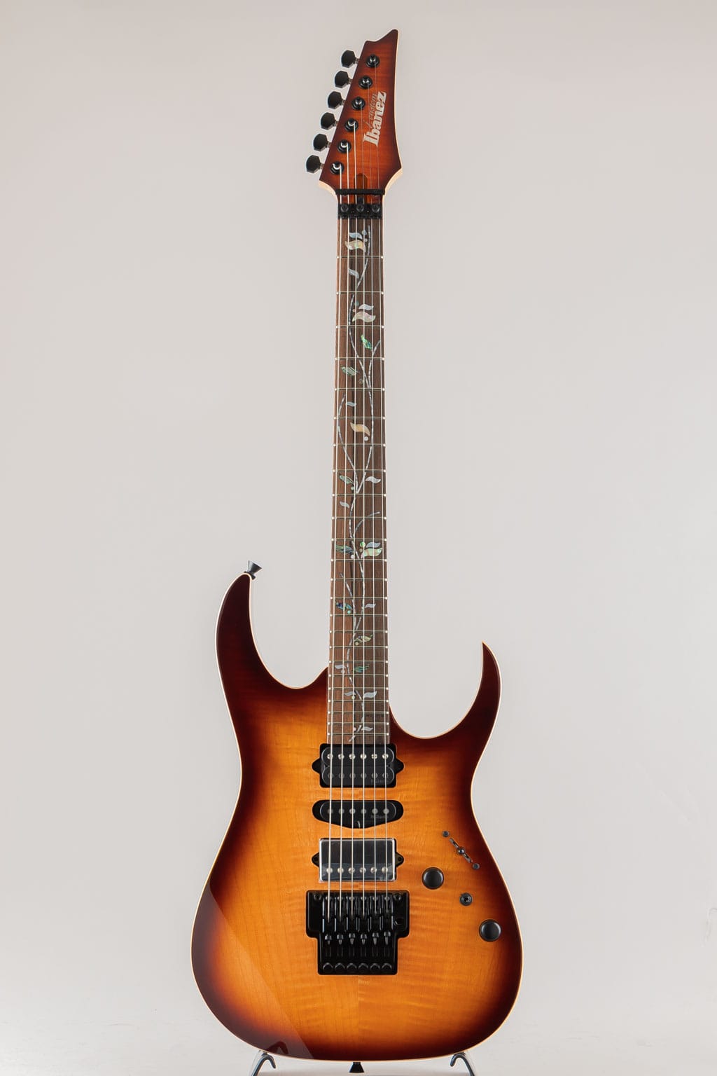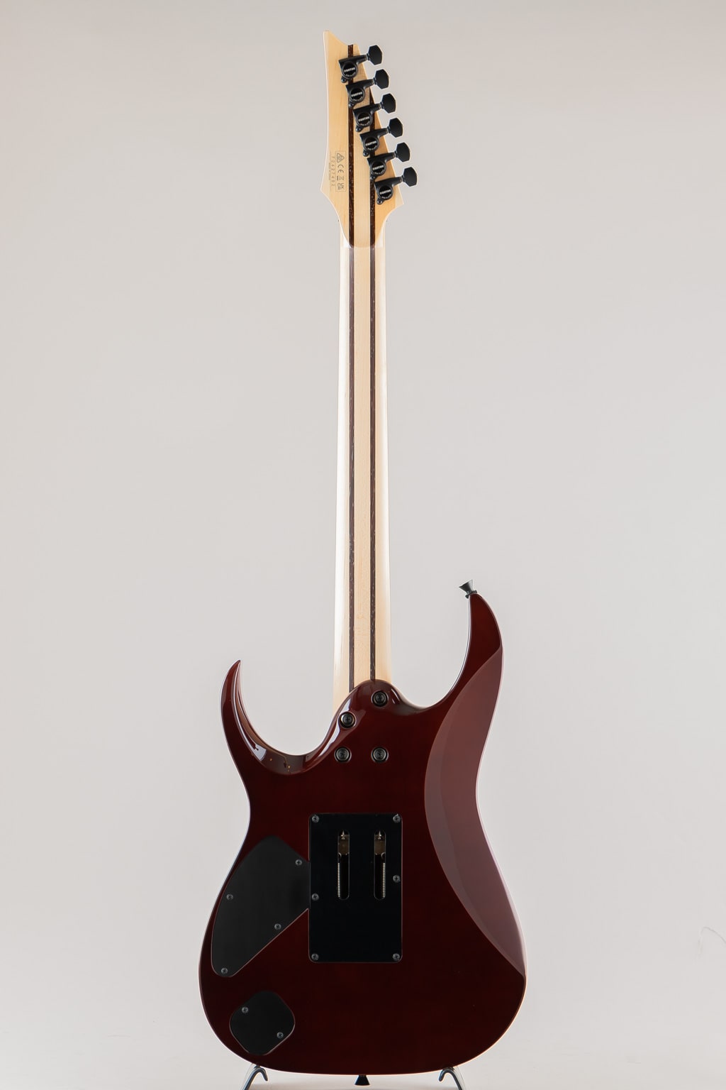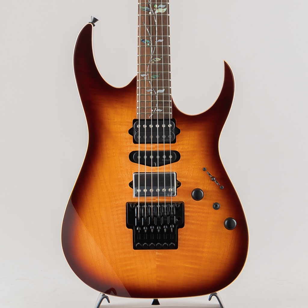 当機RG8870はボディ&ヘッドトップに鮮やかなフレイムメイプル材を使用したアルダーボディ。メイプル/ウェンジの5pcネック、指板にはマッカーサーエボニーを採用。旧約聖書に登場する、エデンの園の中央に植えられた「生命の樹」にインスピレーションを受けてデザインしたインレイ・デザインはMade In Japanならではの精緻な美を堪能できるポイントのひとつです。グリップはライブパフォーマンスを重要視し、演奏性の向上を追求した決定版とも言えるスリムネックRG j.custom Super Wizard neck。ブリッジにはロック式トレモロLo-Pro Edge bridgeを搭載しておりチューニングの安定性が高く演奏面もしっかり考慮されております。また今回のRGは軽量化を取り入れるべく、ボディには表面にチェンバー加工が施されており全てにおいてプレイヤー重視の本格的なスペックが採用されております。