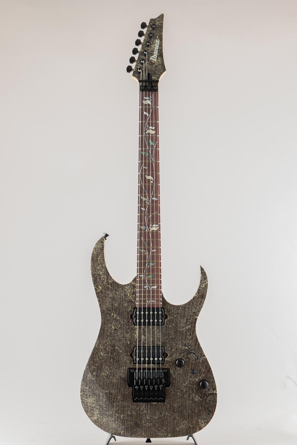 メイプル/ウェンジの5pcネック、指板にはローズウッドを採用。旧約聖書に登場する、エデンの園の中央に植えられた「生命の樹」にインスピレーションを受けてデザインしたインレイ・デザインはMade In Japanならではの精緻な美を堪能できるポイントのひとつです。