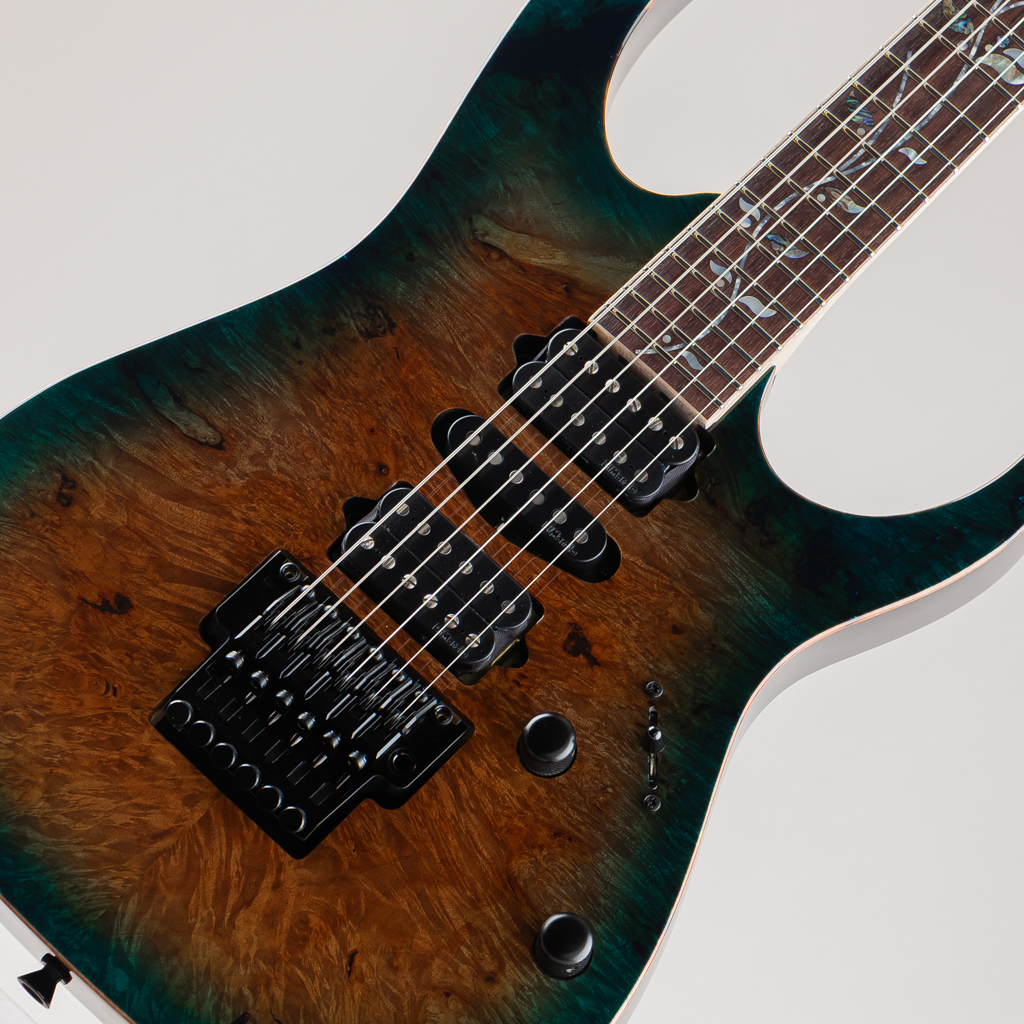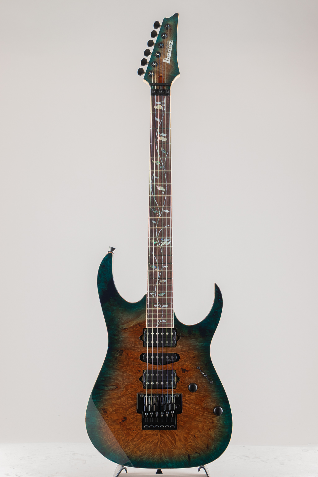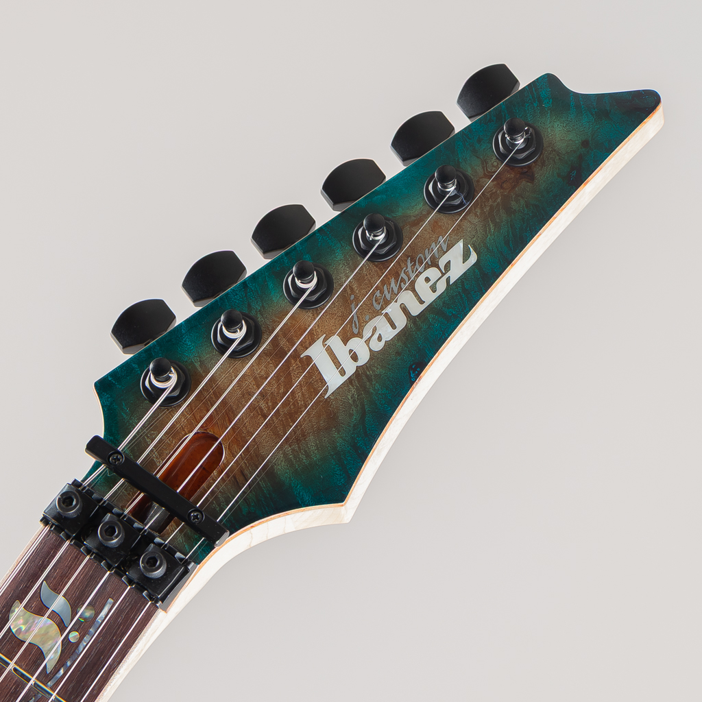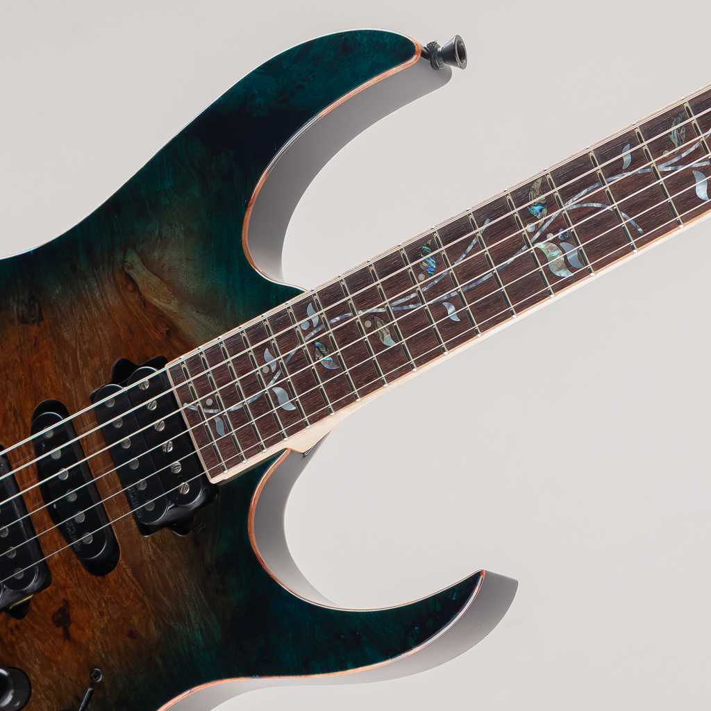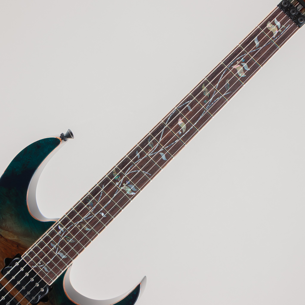 妖艶なエキゾチックメイプルトップのボディ&メイプル/ウェンジの5pcネック、ロースウッド指板を採用。旧約聖書に登場するエデンの園の中央に植えられた「生命の樹」にインスピレーションを受けてデザインしたインレイ・デザインはMade In Japanならではの精緻な美を堪能できるポイントのひとつです。グリップはライブパフォーマンスを重要視し、演奏性の向上を追求した決定版とも言えるスリムネックRG j.custom Super Wizard neck。ブリッジにはロック式トレモロLo-Pro Edge bridgeを搭載しておりチューニングの安定性が高く演奏面もしっかり考慮されております。