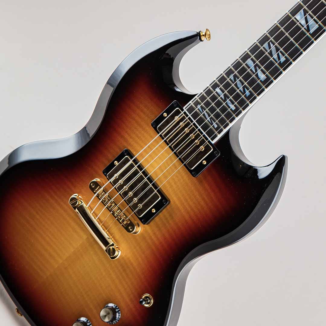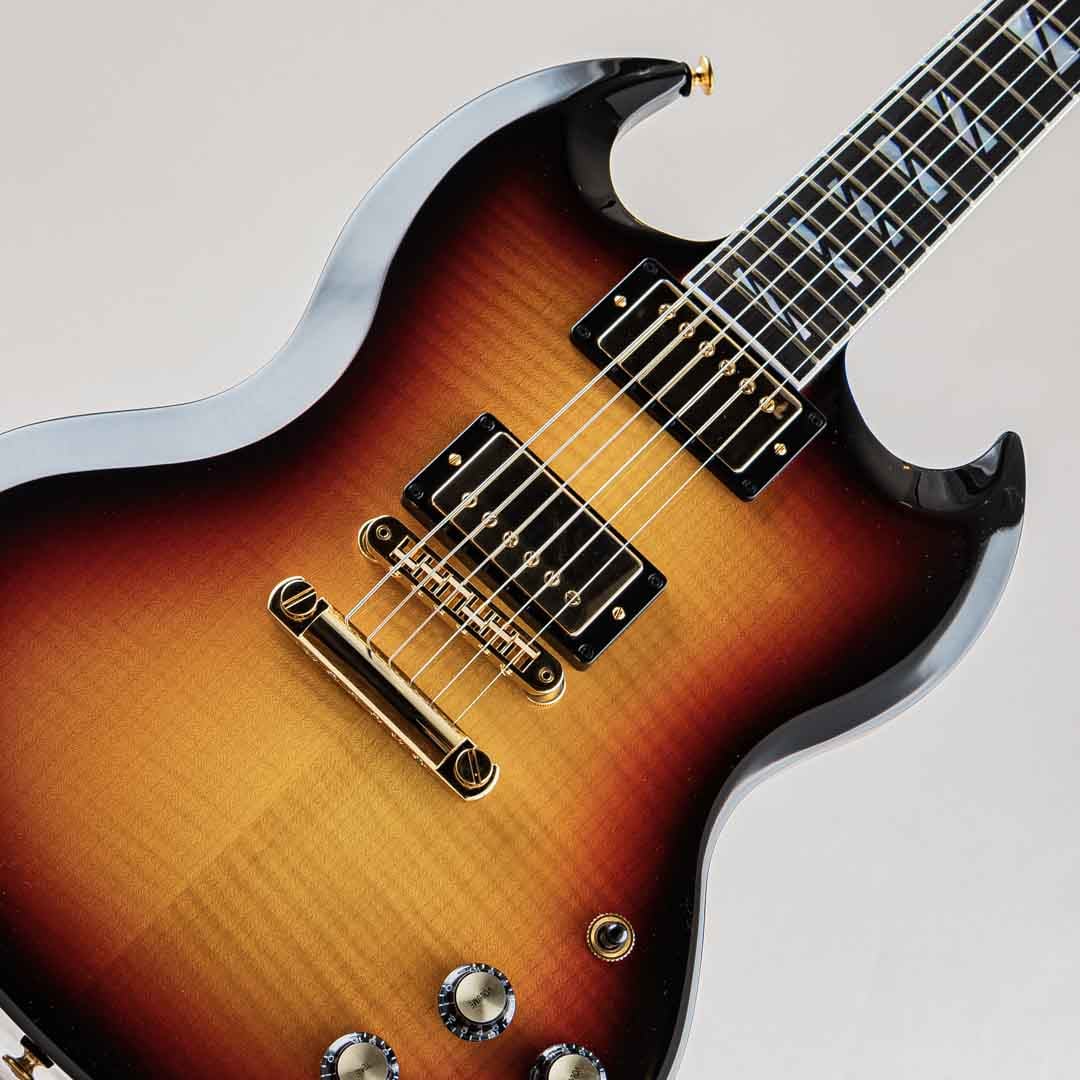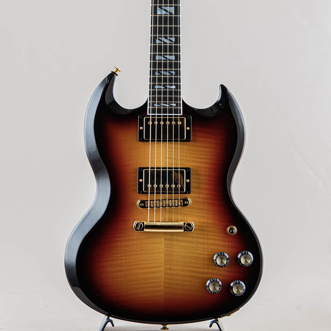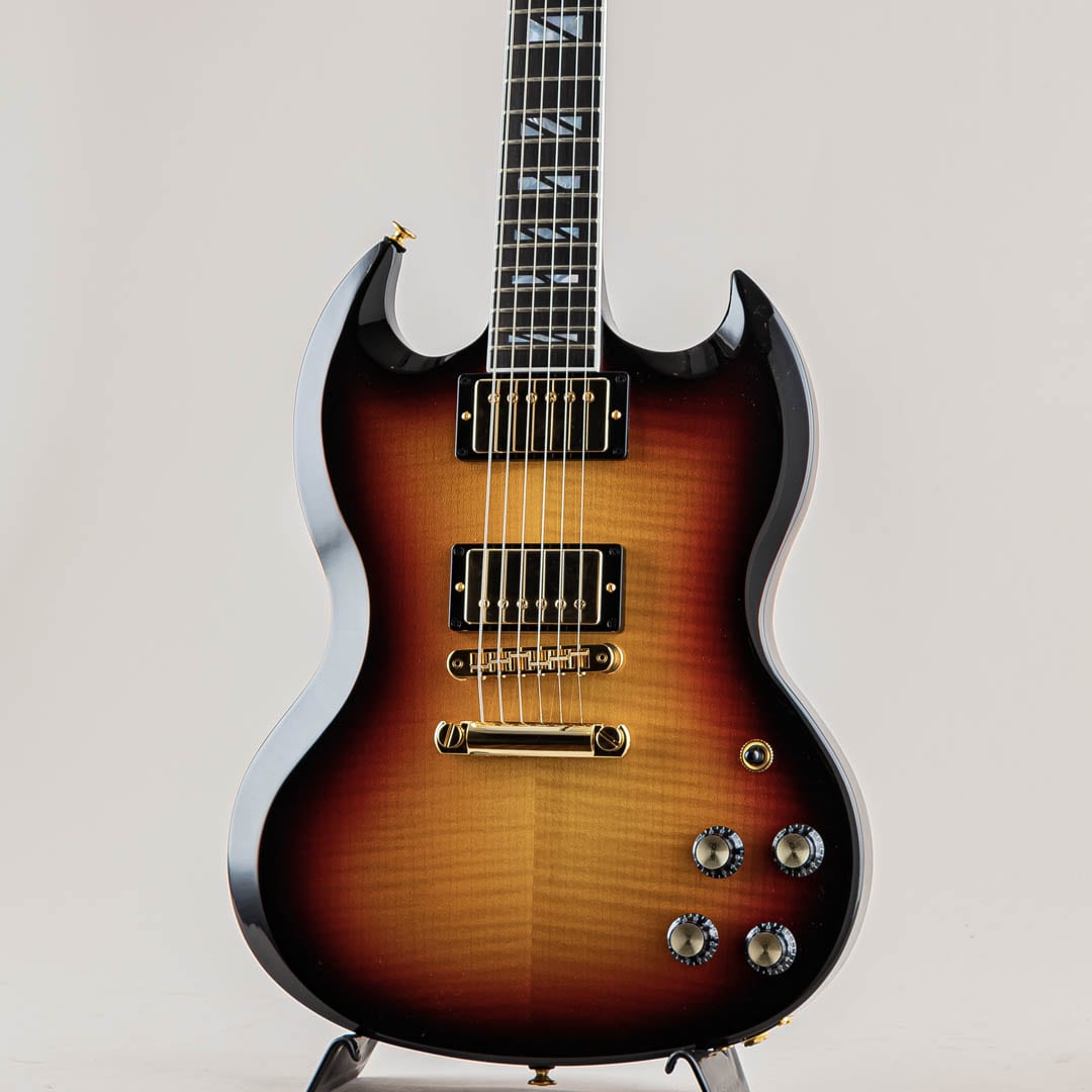 マホガニーボディには豪華なフレイムが美しいAAAフィギュアドメイプルを採用。その美しさを損なわせないためにピックガードは取り付けられておりません。ハードウェアにはゴールドカラーのタイプを採用。ヘッドには1940年代のデザインからインスパイアされた、スーパー・スプリット・ブロック・マザー・オブ・パール・インレイ、”シャンデリア・インレイ”など、”Supreme”の名を冠するに相応しい豪華な装いでございます。