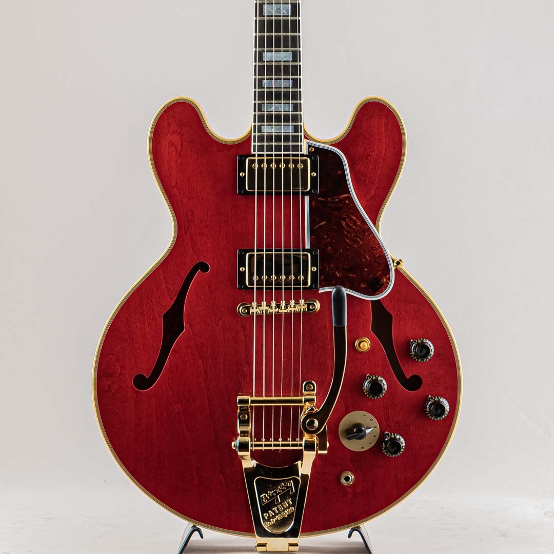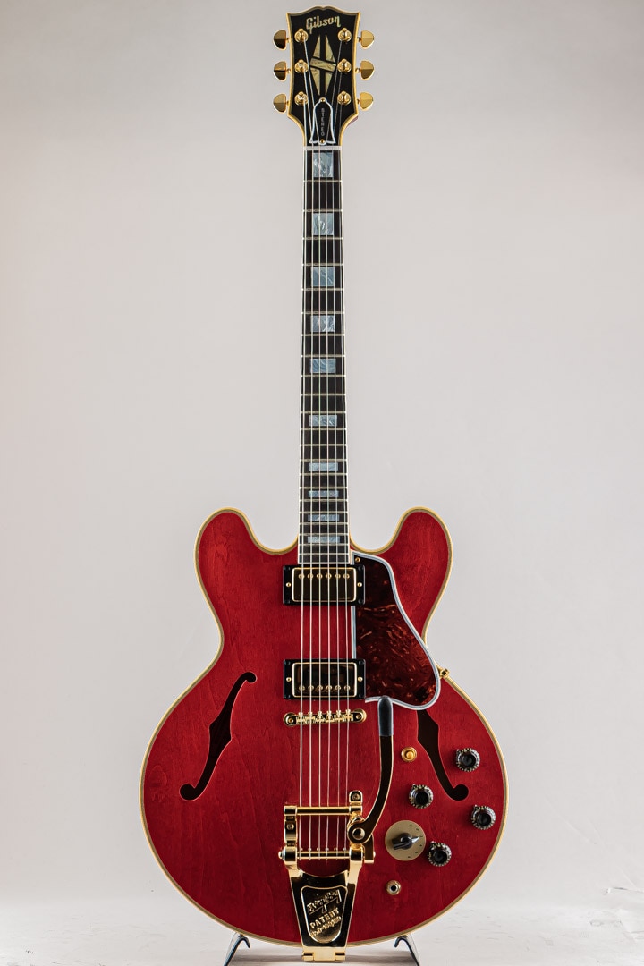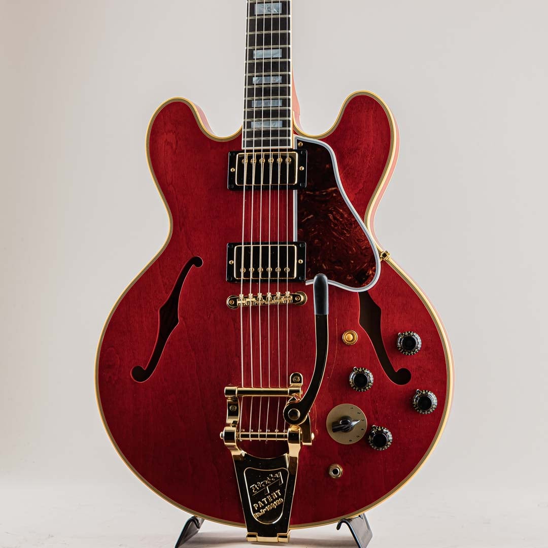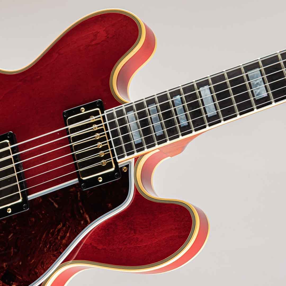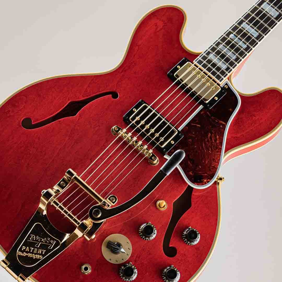 この度入荷いたしましたのは、ゴールドハードウェア/マルチバインディング/ダイヤモンド・スプリット・インレイ等ESシリーズの中でも最高級としての立ち位置を持つES-355。ウッドマテリアルは、ラミネイトメイプルボディ/マホガニーネック/エボニー指板にて構成。セミアコらしいふくよかな倍音感に、エボニー指板から成るアタック感のある響きが特徴的。ネックシェイプには通常のスペックからスリムなES Slima Taperを搭載。心地よいグリップ感はあるものの肉厚さを感じない握り心地。テイルピースにはBigsby B-7を搭載。355のルックスをより高級感ある見た目へ向上しつつも、弦スケールが長くなることにより、心地よいテンション感を実現。