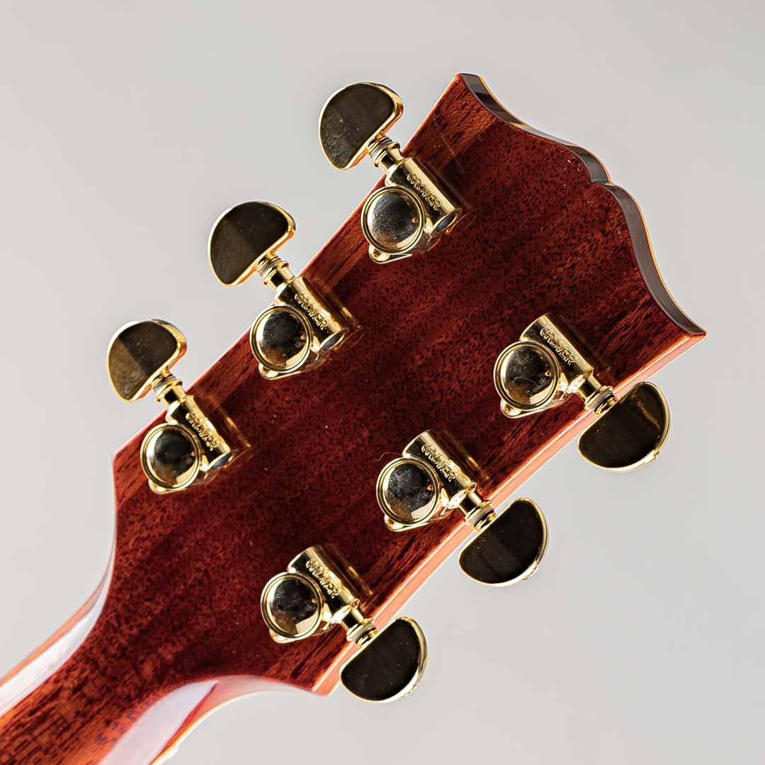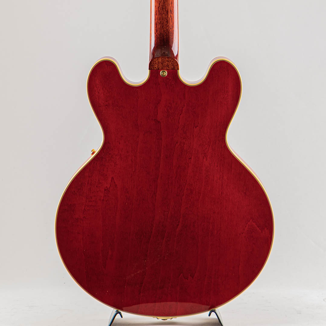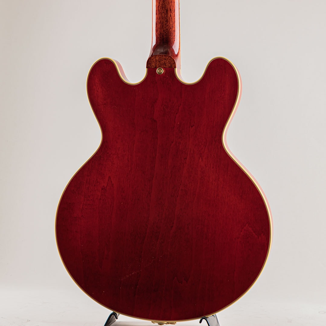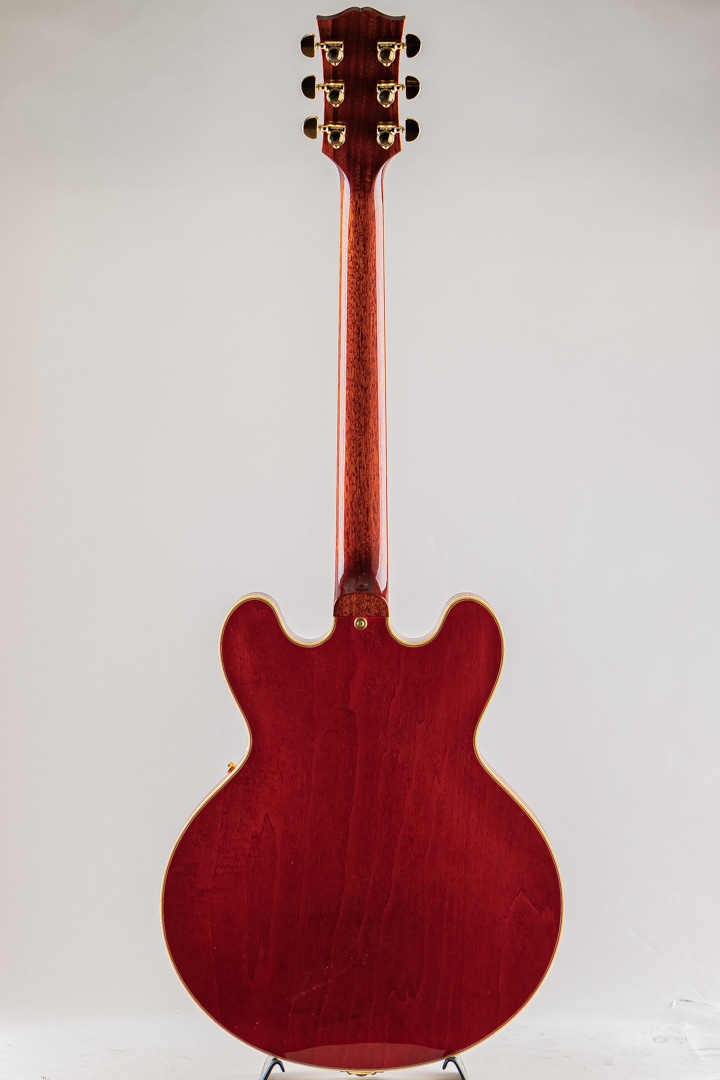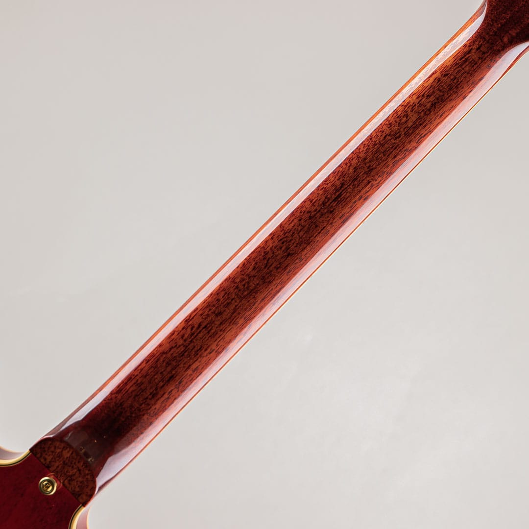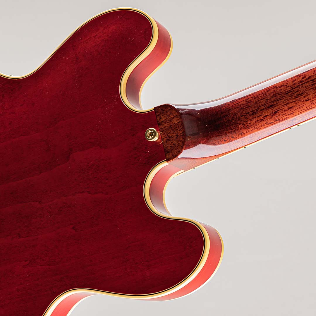 この度入荷いたしましたのは、ゴールドハードウェア/マルチバインディング/ダイヤモンド・スプリット・インレイ等ESシリーズの中でも最高級としての立ち位置を持つES-355。ウッドマテリアルは、ラミネイトメイプルボディ/マホガニーネック/エボニー指板にて構成。セミアコらしいふくよかな倍音感に、エボニー指板から成るアタック感のある響きが特徴的。ネックシェイプには通常のスペックからスリムなES Slima Taperを搭載。心地よいグリップ感はあるものの肉厚さを感じない握り心地。テイルピースにはBigsby B-7を搭載。355のルックスをより高級感ある見た目へ向上しつつも、弦スケールが長くなることにより、心地よいテンション感を実現。