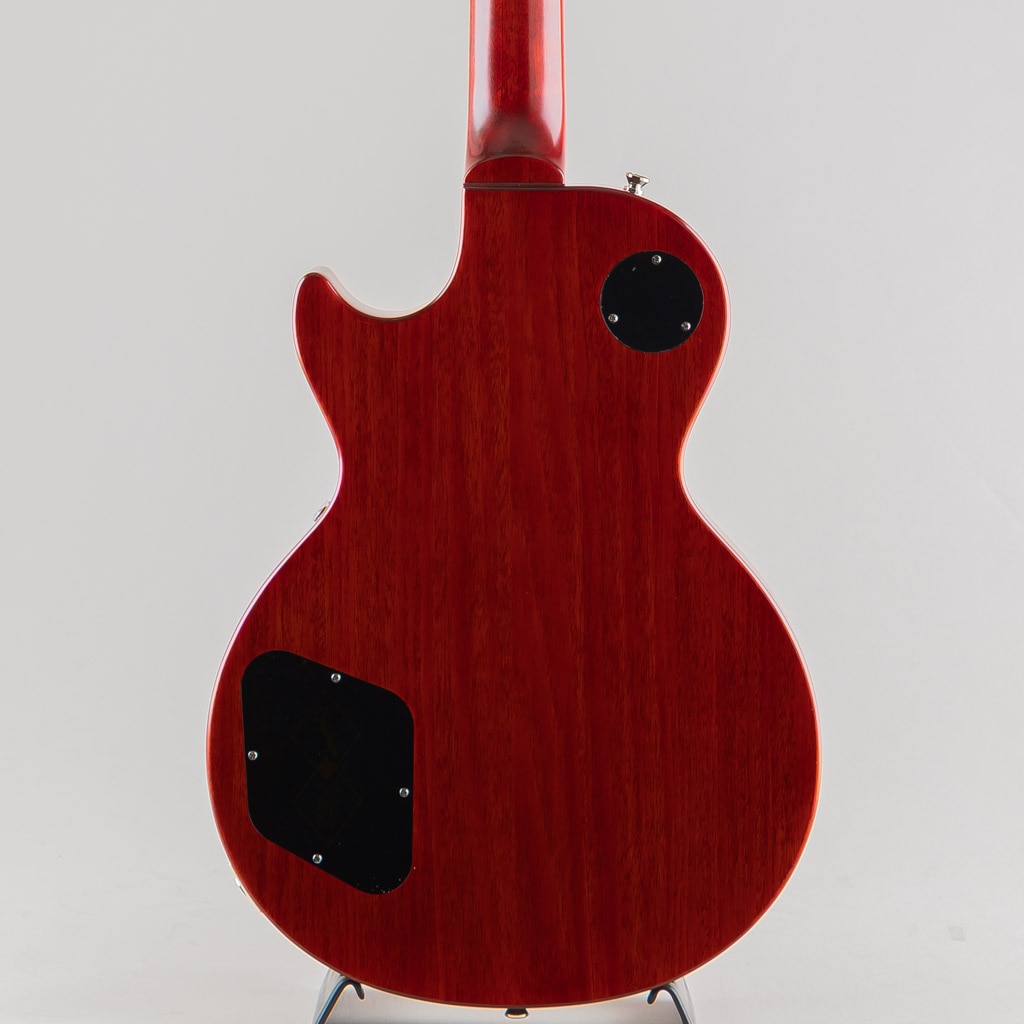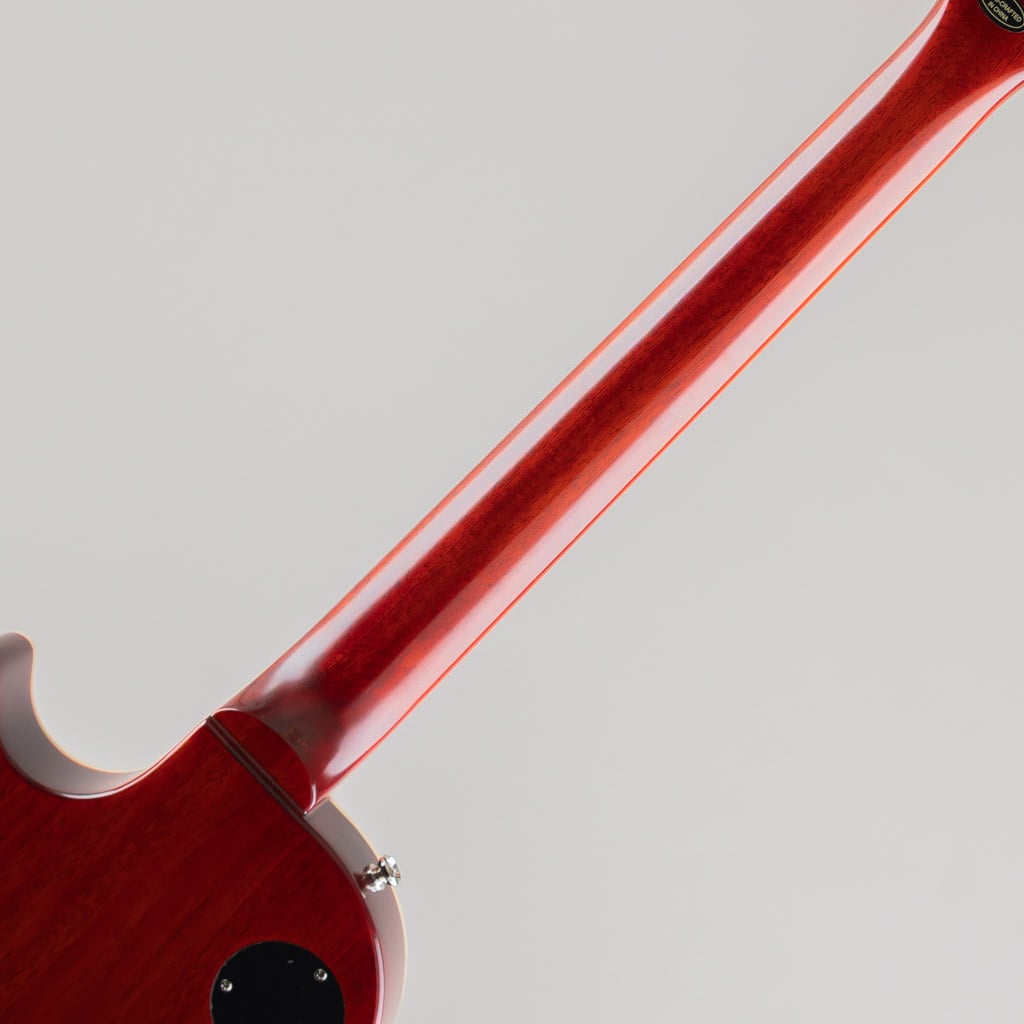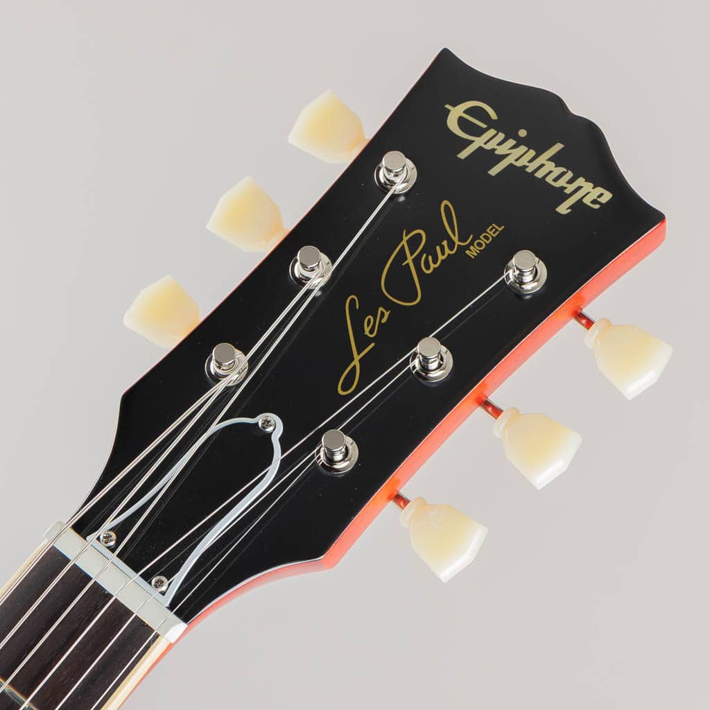 本モデルでは、ワンピース・マホガニー・ネック(ロング・ネック・テノン仕様)を採用し、豊かなサステインを実現。1959年ラウンデッド・ミディアムCネック・プロファイルを採用し、バインディングが施されたローズウッド指板を備えています。さらに、マザー・オブ・パールのトラペゾイド・インレイ、エイジド加工を施したEpiphoneロゴ、シルクスクリーン印刷されたゴールド色の「Les Paul Model」の文字が入ったギブソン・スタイルの“オープンブック”ヘッドストックを採用。サイドドットの位置やサイズも、1959年当時のLes Paul Standardと同じ仕様になっています。ジェニューイン・マホガニー材のボディにメイプル・トップが貼られ、トップには美しいAAAフレイムメイプル化粧板があしらわれています。