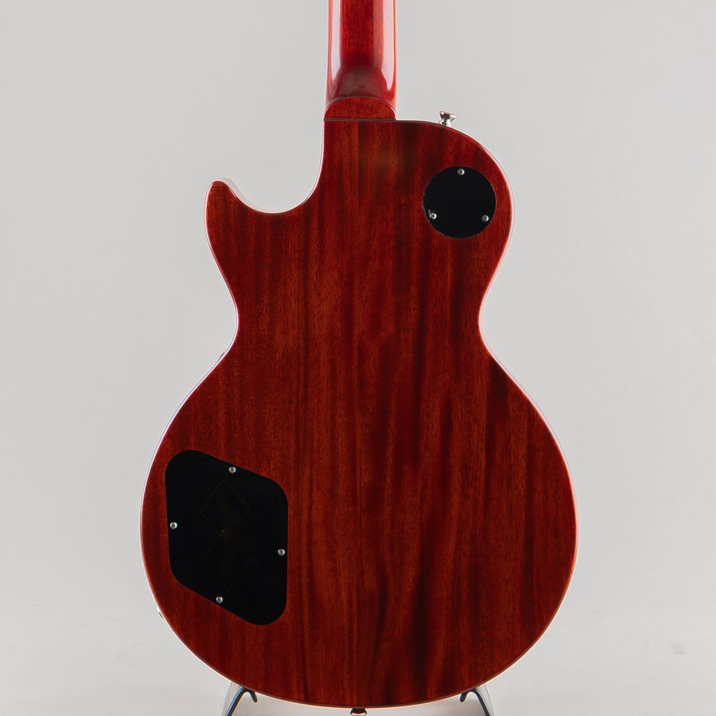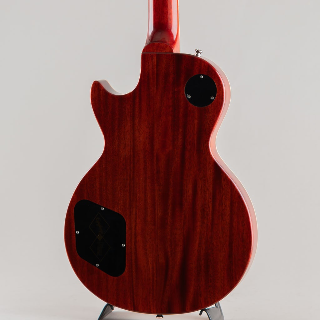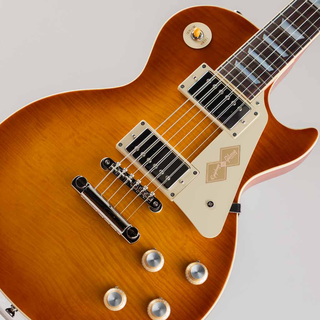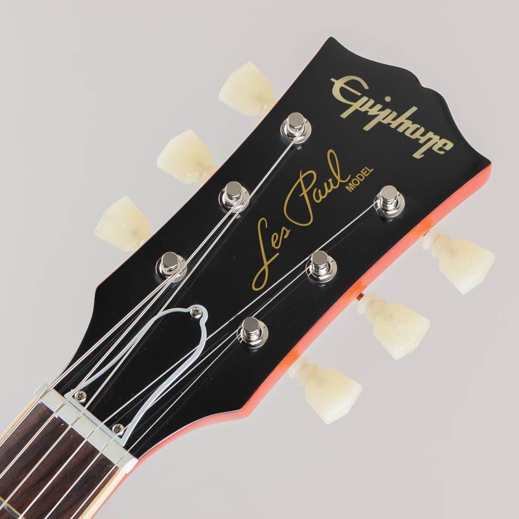 本モデルでは、ワンピース・マホガニー・ネック(ロング・ネック・テノン仕様)を採用し、豊かなサステインを実現。スリムテーパー・ネック・プロファイルにより、スムーズな演奏性を提供します。さらに、バインディングが施されたローズウッド指板、マザー・オブ・パールのトラペゾイド・インレイ、エイジド加工を施したEpiphoneロゴ、ゴールドでシルクスクリーン印刷された「Les Paul Model」の文字が入ったギブソン・スタイルの“オープンブック”ヘッドストックを採用。サイド・ドットの位置やサイズも、1960年当時のLes Paul Standardと同じ仕様になっています。ジェニューイン・マホガニー材のボディにメイプル・トップが貼られ、トップには美しいAAAフレイムメイプル化粧板があしらわれています。