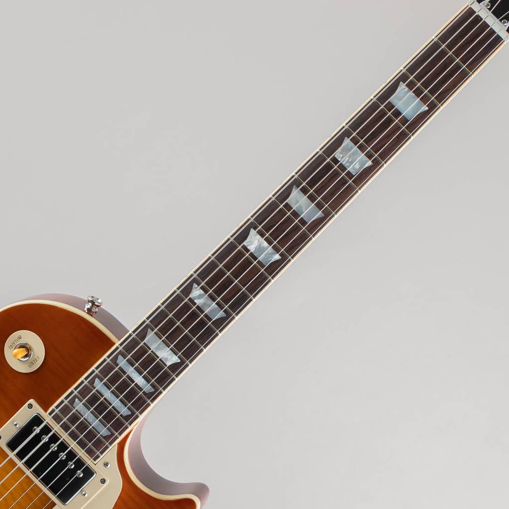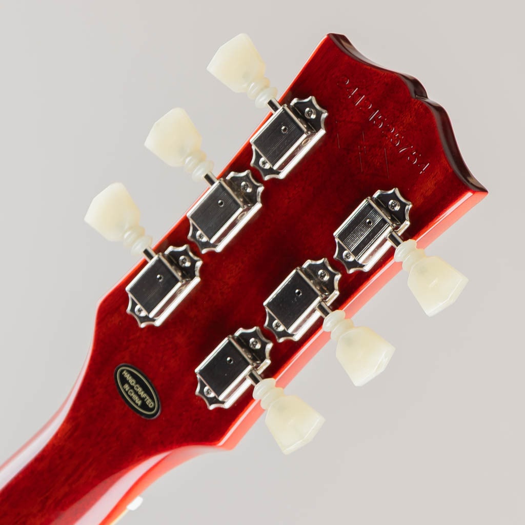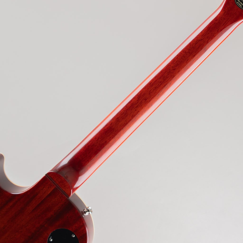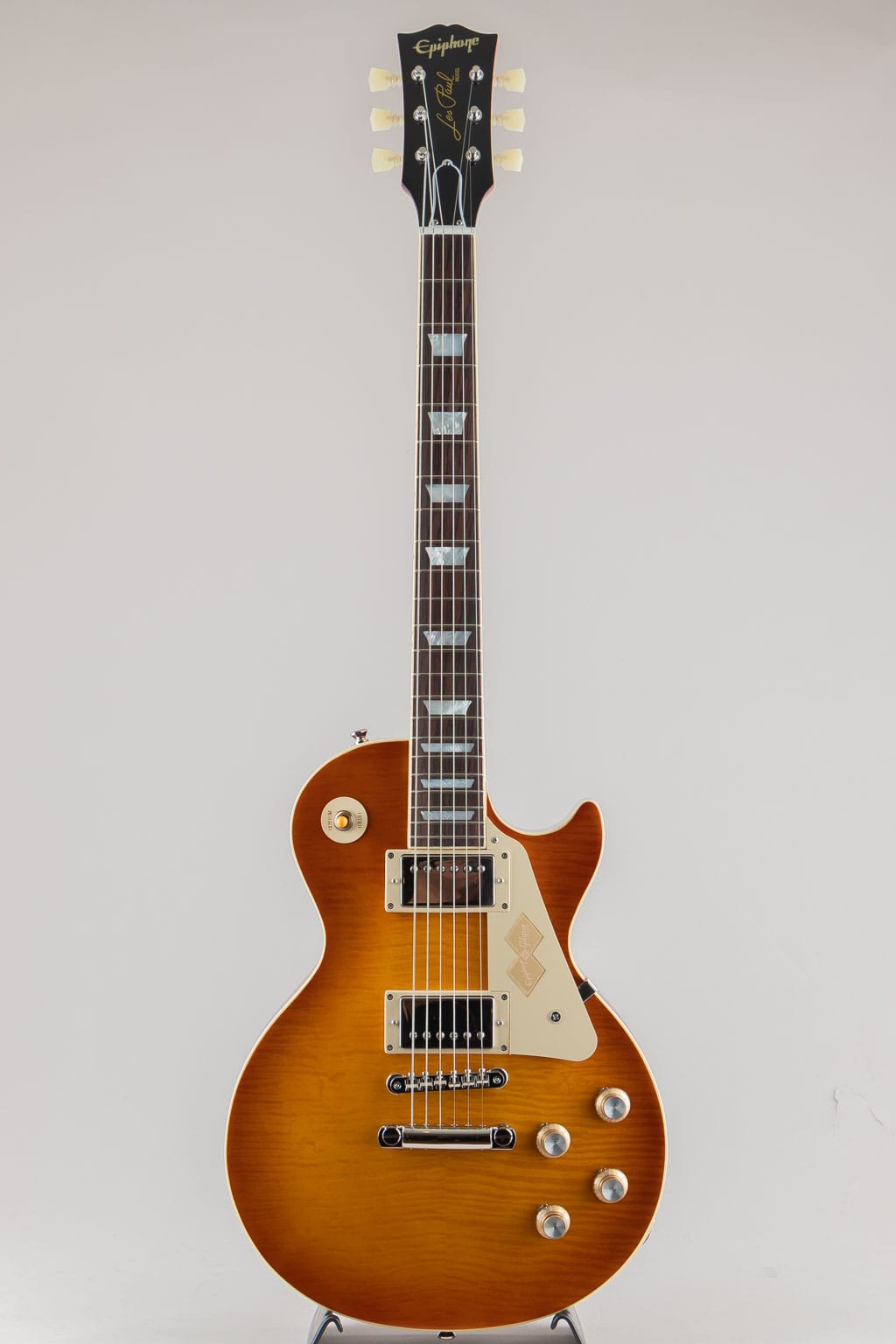 本モデルでは、ワンピース・マホガニー・ネック(ロング・ネック・テノン仕様)を採用し、豊かなサステインを実現。スリムテーパー・ネック・プロファイルにより、スムーズな演奏性を提供します。さらに、バインディングが施されたローズウッド指板、マザー・オブ・パールのトラペゾイド・インレイ、エイジド加工を施したEpiphoneロゴ、ゴールドでシルクスクリーン印刷された「Les Paul Model」の文字が入ったギブソン・スタイルの“オープンブック”ヘッドストックを採用。サイド・ドットの位置やサイズも、1960年当時のLes Paul Standardと同じ仕様になっています。ジェニューイン・マホガニー材のボディにメイプル・トップが貼られ、トップには美しいAAAフレイムメイプル化粧板があしらわれています。