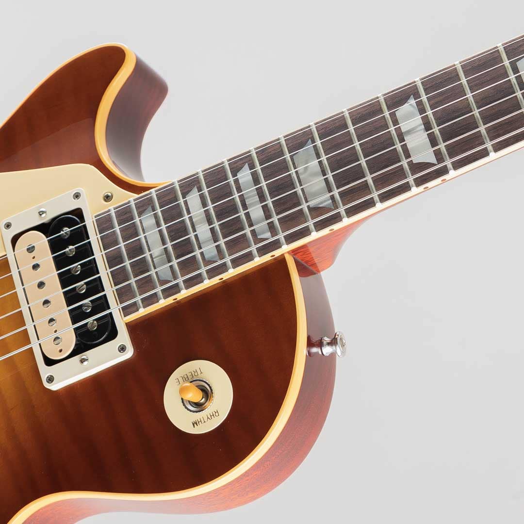 ウッドマテリアルは、ハンド・セレクト・フィギュアドメイプルトップ/1Pマホガニーバック/マホガニーネック/インディアンローズウッド指板にて構成。波打つような立体感がありながらも奥行きを感じさせるフィギュアドメイプル。VOSフィニッシュとアイスドティーカラーが織りなすコントラストは美しく、眺めているだけで想像力が掻き立てられる素晴らしいルックス。ネックシェイプは太すぎず細すぎないAuthentic '59 Medium C-Shapeをチョイス。ピックアップにはゼブラボビンのオープンスタイルにてオーダーした、Custombuckerを2機搭載。オリジナルサウンドに迫る軽快な立ち上がりのスピード感、反応の良さ、それでいてくもりの無い音像と芯の太さを持った、素直に良いと感じさせてくれるグッドサウンド。軽量ながらガツンと力強く抜けるトーンはクリーンから深く歪ませたドライブサウンドまで、楽器の”楽しさ”を感じさせてくれるクオリティでございます。