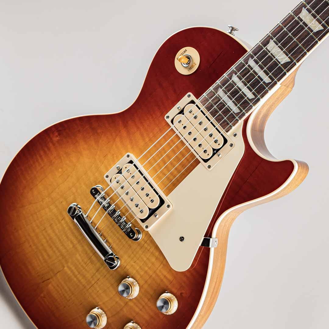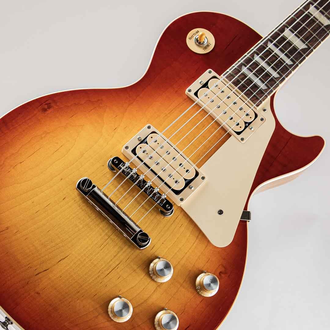 ウッドマテリアルは、ウェイトリリーフ加工が施されていないマホガニーバック/AAフィギュアド・メイプルトップ/マホガニーネック/ローズウッド指板にて構成。王道ウッドマテリアルからアウトプットされる、芳醇でありながらも力強さを感じられる鳴りはギブソンのフラッグシップモデルとして君臨し続けるのを納得させるクオリティ。ネックプロファイルは、60年代のGibsonビンテージをプロファイリングし形成されたSlimTaperシェイプで、なだらかな曲線を描いたグリップ感は、テクニカルなフレーズをプレイされる際においても、ストレスを感じにくい握り心地。その他ABR-1ブリッジ/Groverペグ等が搭載されております。