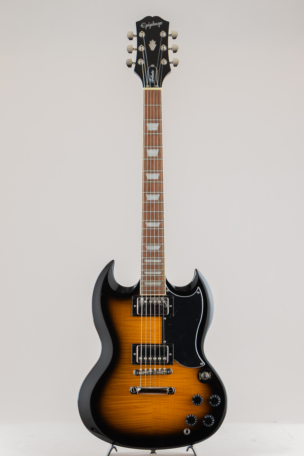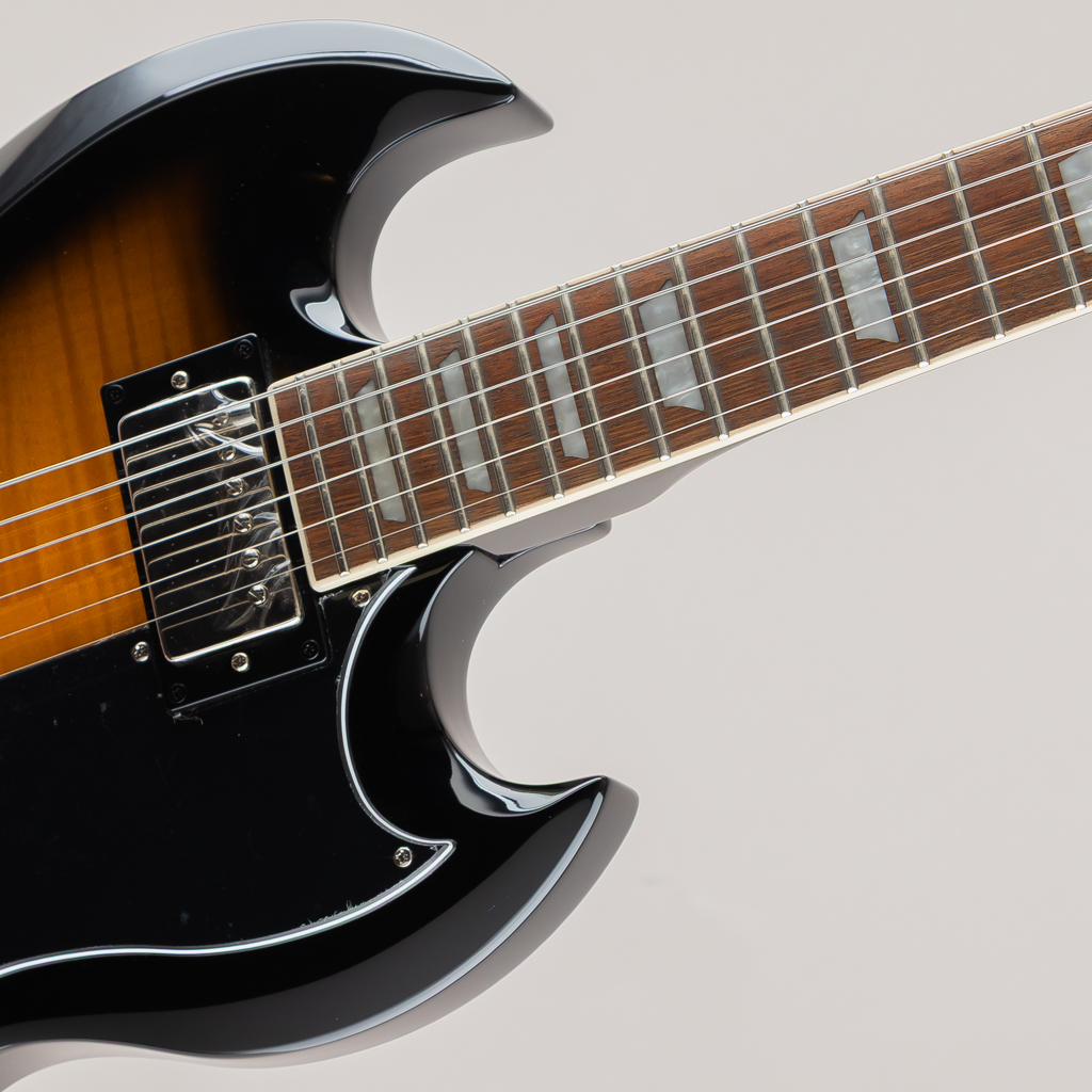 エピフォン トリビュート・シリーズは、ギターを初めて手にする全世界のプレイヤーにとって、ギターの世界の入り口となっているモデルです。この度、その人気シリーズに、新製品 エピフォン SG トリビュート・プラスが加わります。手頃な価格設定と高品質を実現した本モデルは、初心者から中級者レベルのプレイヤー向けに設計されており、ギターを始めたばかりのもっとも上達が著しい時期のプレイヤーを堅実にサポートします。 エピフォン SG トリビュート・プラスは、クラシックなSGモデルと同じボディ形状を採用。ボディ全面にわたって傾斜がつけられた象徴的なSGボディの形状をベースに、フレイム・メイプルの化粧板をトップに配することで圧巻の美しさを演出しています。ボルトオン仕様でボディに接合されたネックは、60年代スタイルのSlimTaper Rounded Cプロファイルを採用。演奏性に優れ、練習やジャムセッションを快適にサポートします。ネックヒールはスカルプテッド加工が施されており、ハイポジションへのアクセスが向上しています。ヘッドストックは人気の60sカラマズーシェイプを採用し、高品質なダイキャスト製チューニングマシンを装備。バインディング付きのローレル指板には22本のミディアムジャンボ・フレットが打たれ、パーロイド製のトラペゾイド・インレイが施されています。ブリッジにはEpiphone LockTone Tune-O-Maticを、テイルピースにはLockTone Stop Barを採用。弦高とイントネーションの微調整が容易で、なおかつ優れたサステインを生み出します。ピックアップはEpiphone Humbuckerを2基搭載。ネックポジションにEpiphone 650R、ブリッジポジションにEpiphone 700Tを装備。両ピックアップは強力なセラミックマグネットを備え、豊かで力強いトーンを出力します。ニッケルカバーの下はゼブラ・コイル仕様となっています。 エピフォン SG トリビュート・プラスは、従来のトリビュート・シリーズの進化系であり、より優れた性能と洗練された外観を実現しながらも、世界中のプレイヤーにとって手頃な価格を実現しています。初めてのエレキギターとして、あるいは2本目のギターとしても最適な選択肢であり、今後何年にもわたってギターに取り組むにあたり頼りになる相棒となるでしょう。 ※画像はサンプルとなります。予めご了承くださいませ。 Body:Mahogany Top:Flame Maple Veneer Body Finish:Gloss Neck:Mahogany Profile:60s SlimTaper Rounded C Scale Length:628.65 mm / 24.75 in Fingerboard:Laurel Fingerboard Radius:304.8 mm / 12 in Fret:22/Medium Jumbo Nut:Ivory Urite Nut Width:43.0 mm / 1.692 in Joint:Bolt On Bridge:LockTone Tune-O-Matic Tailpiece:LockTone Stop Bar Tuning Machines:Die Cast Neck Pickup:Epiphone 650R Humbucker Bridge Pickup:Epiphone 700T Humbucker Controls:2 Volume, 2 Tone Pickup Selector:3-way Toggle