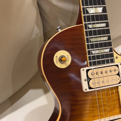 現地ファクトリー選定材採用モデル。1959 Les Paul Standard R Top Dark Iced Tea Burst VOSが入荷。ダブルホワイトボビン採用の限定モデルでございます。