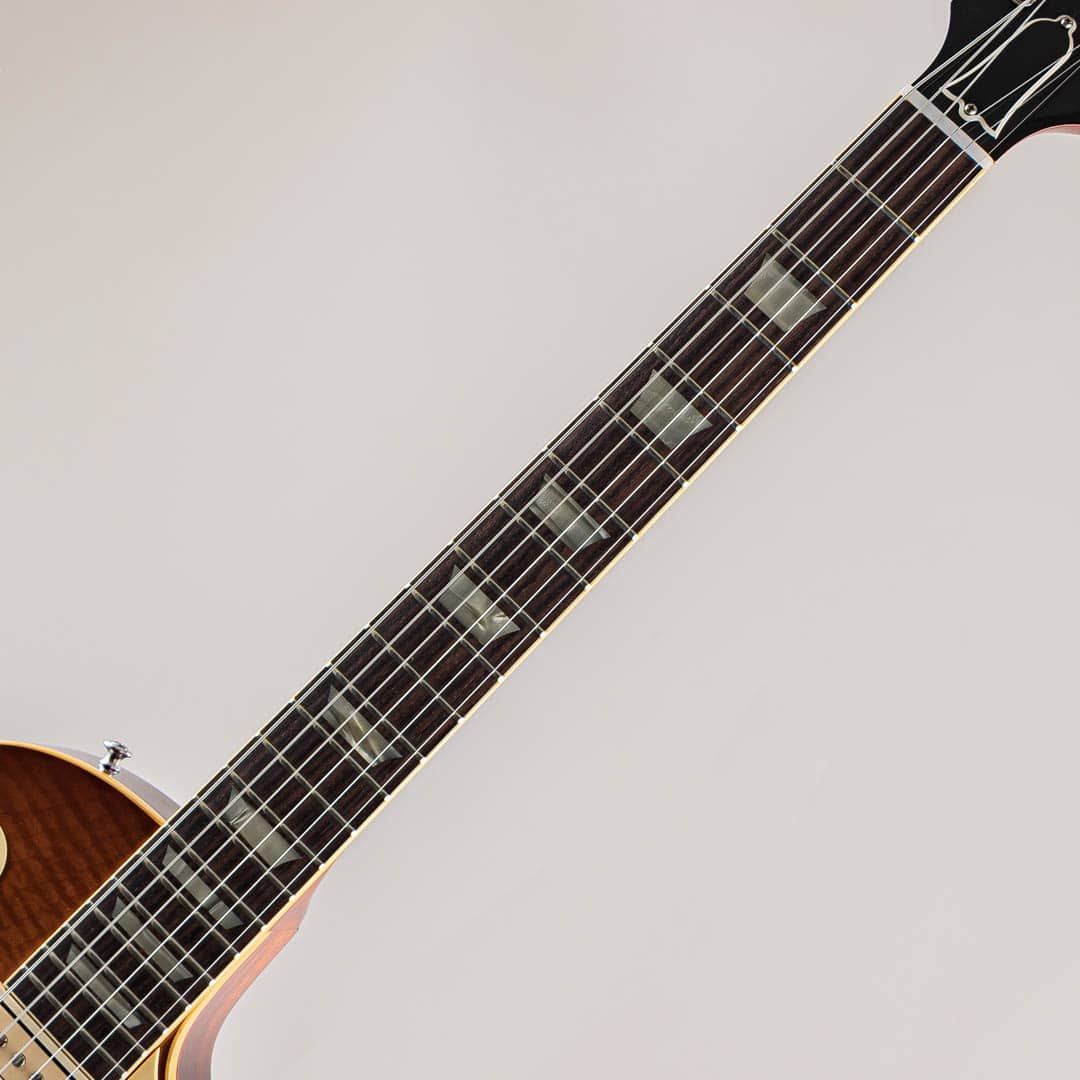 ウッドマテリアルは、Rグレードフレイムメイプル / ソリッド・マホガニーバック / ワンピース・マホガニーネック / ローズウッド指板にて構成。細やかでありながらも輪郭のある、霜降りのようなフレイムは非常に美しく、光の当て方や見る角度を変えることで様々な表情を演出、極上グレードというのも頷ける圧巻のクオリティでございます。指板に採用されたローズウッドも黒々しく、スロウ・アイスティー・フェイドとのコントラストも抜群でございます。また、本機は重量が3.8kgと軽量なところもグッドポイントです。