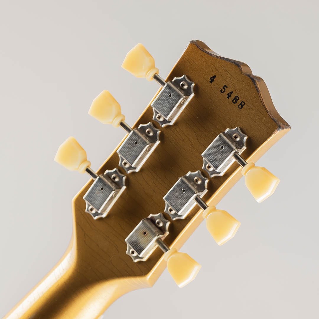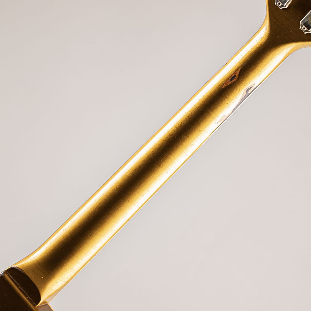 この度入荷いたしました本機は、カスタムショップ1954モデルをベースモデルとして、ディーラーセレクトにて特別にオーダーされたモデルとなります。ウッドマテリアルは、メイプルトップ / マホガニーボディ / マホガニーネック / ローズウッド指板にて構成。カラーは、全ての面をゴールドにてフィニッシュ。一見豪華な印象を受けるゴールドカラーでございますが、実際は見る角度を変えることで少し緑色ぽさを感じさせる渋いカラーリング。そこに加えて、Murphy Labにて施された「ヘビー・エイジド」加工がより一層渋さを増加。本年から採用されたゴールドノブの緑青加工なども合わさり、従来よりヴィンテージテイストを感じられるルックスでございます。その他、本機だけの仕様として、ロゴの位置が低いLower Logo、Authentic '59 Medium C-Shape、Authentic Medium jumbo Flets等、54の見た目を細やかに再現しつつも、59のプレイアビリティを併せ持っております。