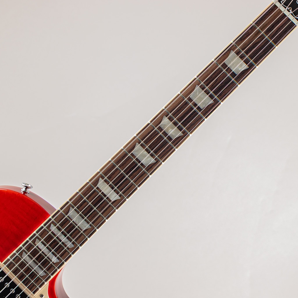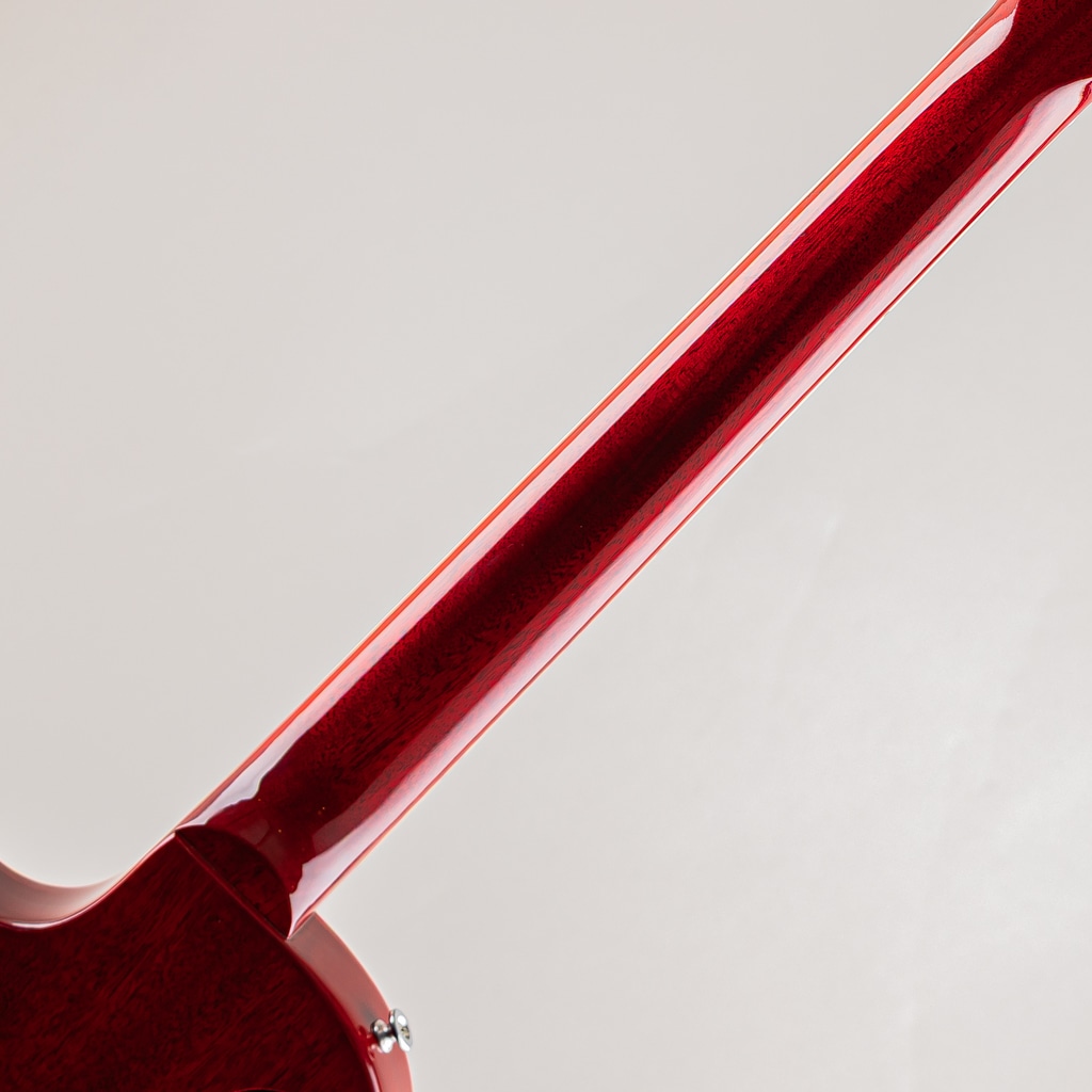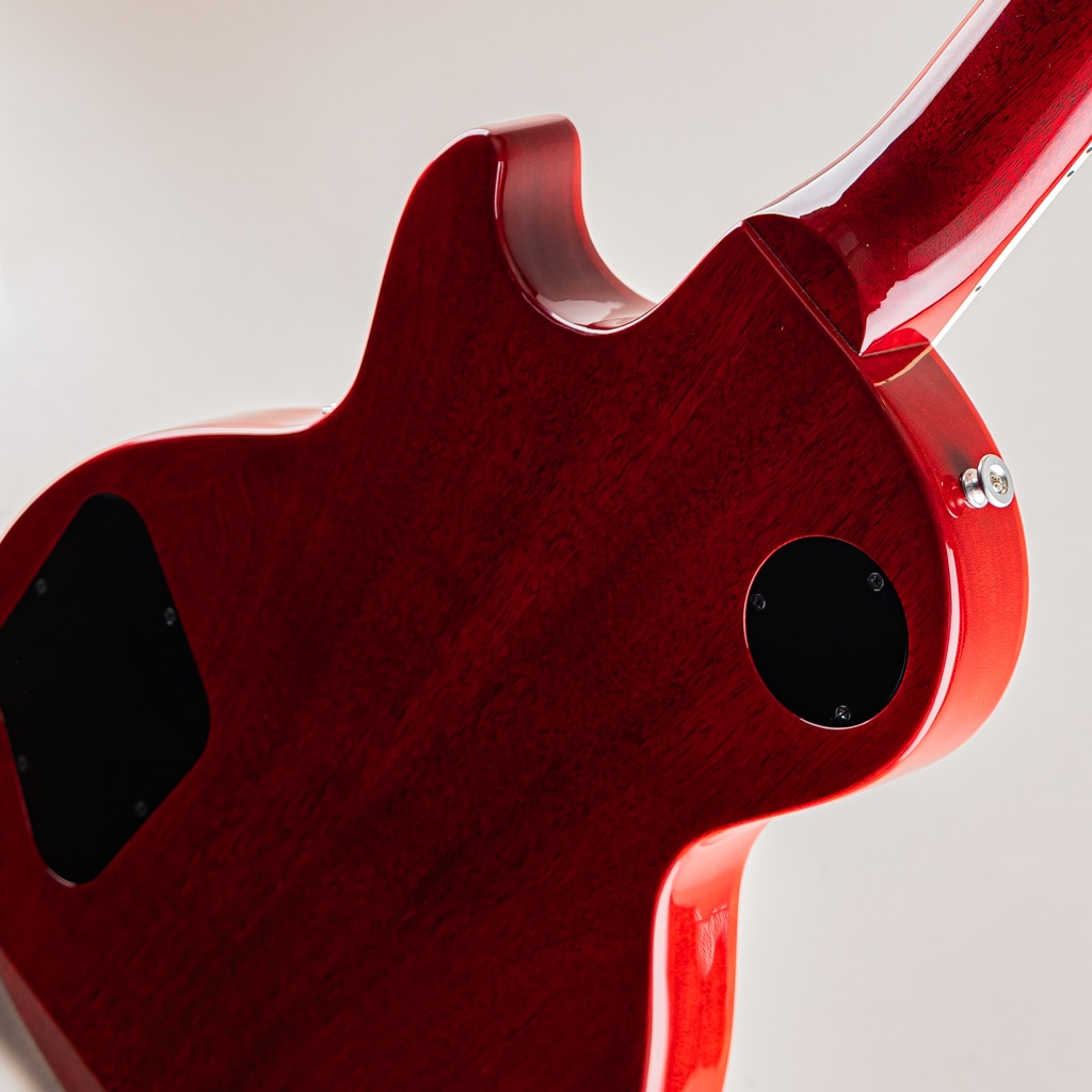 スペックとしてはマホガニーボディ/メイプルトップ/マホガニーネック/ローズ指板のウッドマテリアル。ボディにはウルトラ・モダーン・ウェイトリリーフ加工が施されたことにより、レスポールスタンダードに比べ軽量な取り回しを実現。そこに加えネック厚が薄いスリム・テーパーシェイプ、オクターブ調整がしやすいナッシュビルチューンブリッジを搭載することで、高い演奏性が確保されております。その他の面では、ネックバインディングが新たに採用されておりますので、ポジションマークの視認性が向上しただけではなく、ルックス面においても締まりのある雰囲気を演出しております。