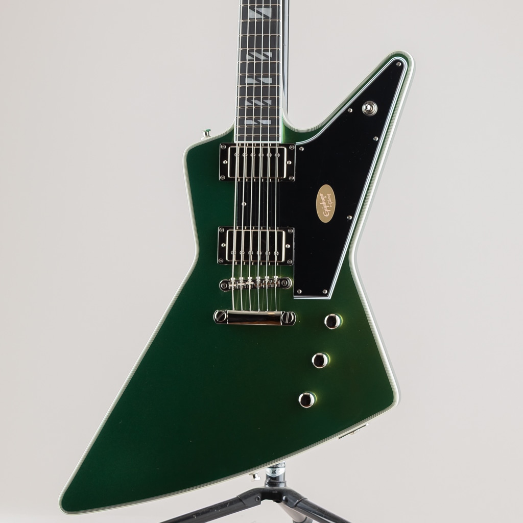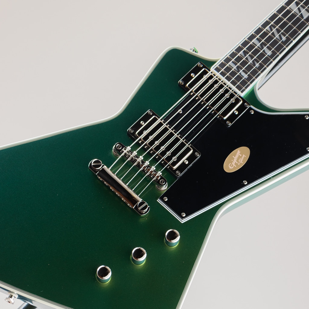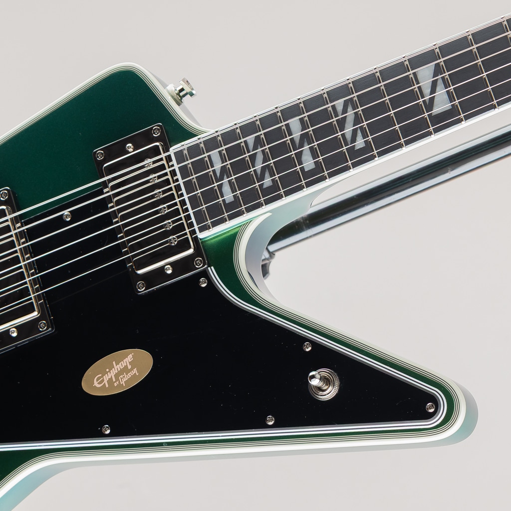 ギブソン エクスプローラーは、エレキギターの世界で最も斬新でモダン、そして一目でそれとわかるプロファイルを持つギターの1つです。1950年代後半に設計され、初めて発売されたこのギターは、あまりにもモダンだったため、プレイヤーが追いつくのに何年もかかりましたが、一度追いつくと、世界中のロックやメタルプレイヤーの間で人気となりました。エピフォンは、ギブソンが1958年に初めて発売した当時、時代をはるかに先取りしていたデザインを現代的にアレンジした、新しいFutura Explorer Customを発表できることを嬉しく思います。角張ったマホガニーボディには、トップに7プライのバインディングが施されています。LockTone Tune-O-MaticブリッジとLockTone Stop Barテールピースを搭載し、優れたイントネーションとサステインを実現。Posi-Lokストラップボタンにより、追加のハードウェアなしでストラップをしっかりと固定できます。接着式のマホガニーネックは、非常に快適で演奏性に優れたモダンCプロファイルを採用し、バインディング付きのエボニー指板には22本のステンレススチール製ミディアムジャンボフレットと、魅力的なスーパー400スタイルのパーロイドスプリットブロックインレイが施されています。指板は10~14インチのコンパウンドラジアスを採用しており、コード演奏やチョーキングも容易に行えます。バインディング付きのエクスプローラーヘッドストックには、ロック式グローバーミニロトマチックチューナー、グラフテックナット、そしてマザーオブパールで象嵌されたエピフォンロゴが装備されています。
