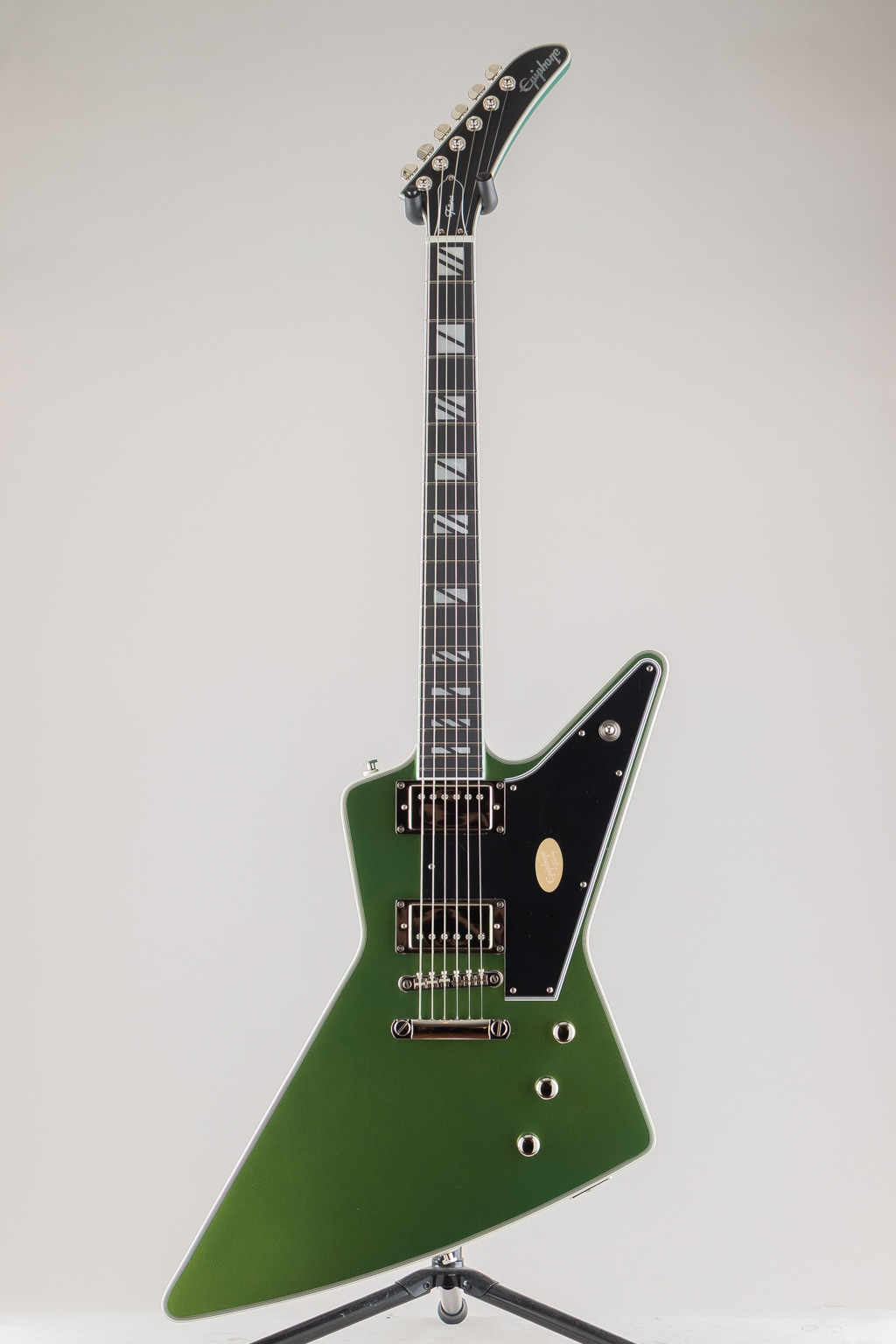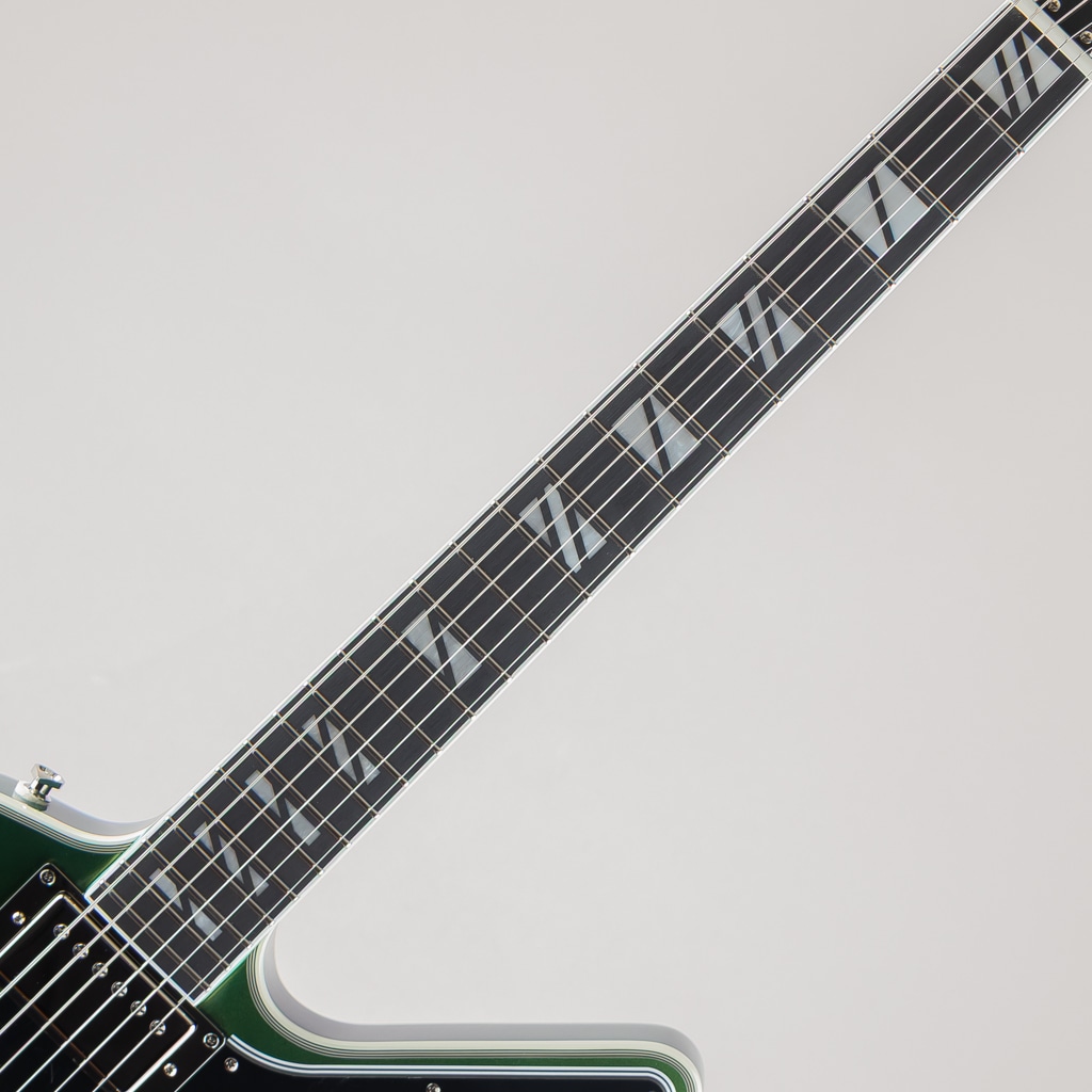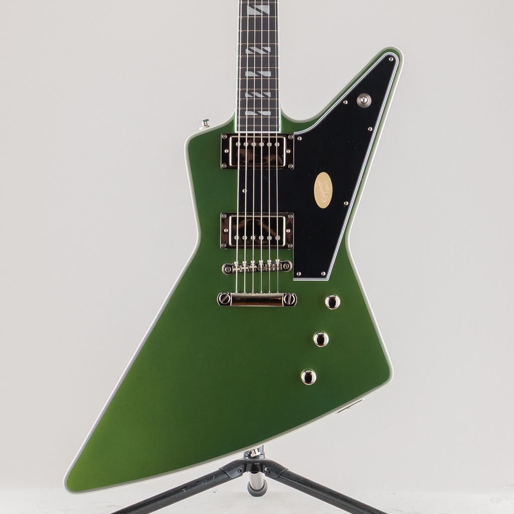 ギブソン エクスプローラーは、エレキギターの世界で最も斬新でモダン、そして一目でそれとわかるプロファイルを持つギターの1つです。1950年代後半に設計され、初めて発売されたこのギターは、あまりにもモダンだったため、プレイヤーが追いつくのに何年もかかりましたが、一度追いつくと、世界中のロックやメタルプレイヤーの間で人気となりました。エピフォンは、ギブソンが1958年に初めて発売した当時、時代をはるかに先取りしていたデザインを現代的にアレンジした、新しいFutura Explorer Customを発表できることを嬉しく思います。角張ったマホガニーボディには、トップに7プライのバインディングが施されています。LockTone Tune-O-MaticブリッジとLockTone Stop Barテールピースを搭載し、優れたイントネーションとサステインを実現。Posi-Lokストラップボタンにより、追加のハードウェアなしでストラップをしっかりと固定できます。接着式のマホガニーネックは、非常に快適で演奏性に優れたモダンCプロファイルを採用し、バインディング付きのエボニー指板には22本のステンレススチール製ミディアムジャンボフレットと、魅力的なスーパー400スタイルのパーロイドスプリットブロックインレイが施されています。指板は10~14インチのコンパウンドラジアスを採用しており、コード演奏やチョーキングも容易に行えます。バインディング付きのエクスプローラーヘッドストックには、ロック式グローバーミニロトマチックチューナー、グラフテックナット、そしてマザーオブパールで象嵌されたエピフォンロゴが装備されています。