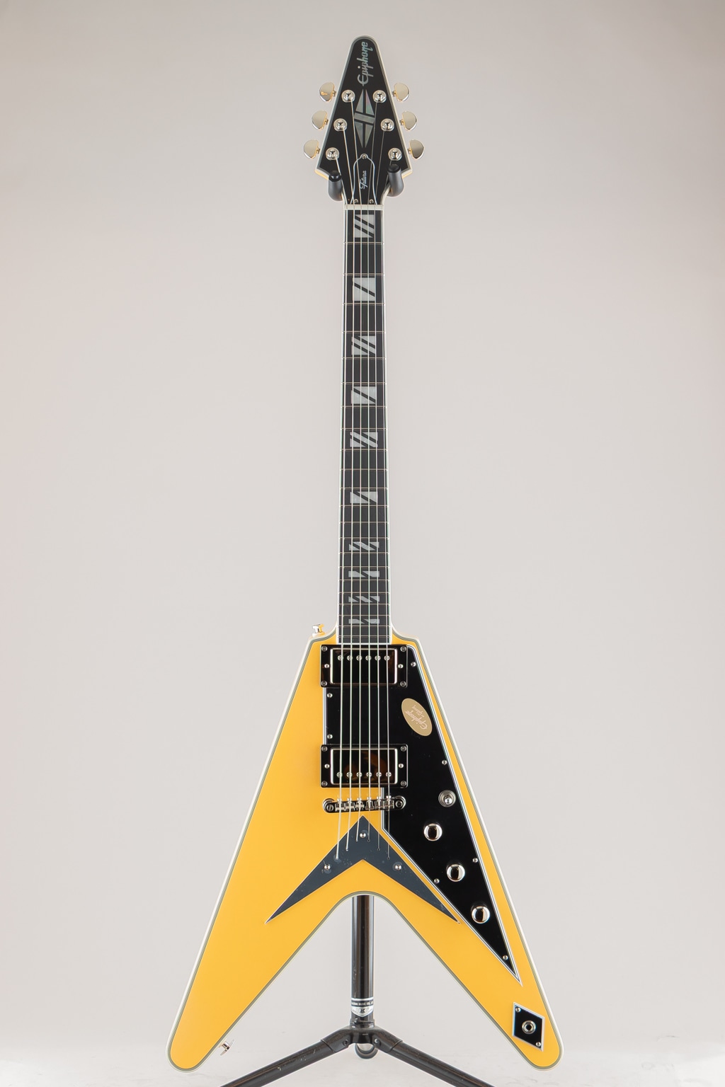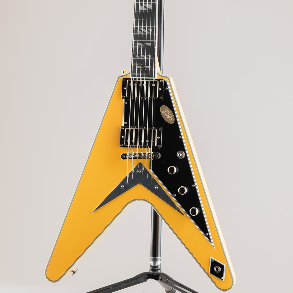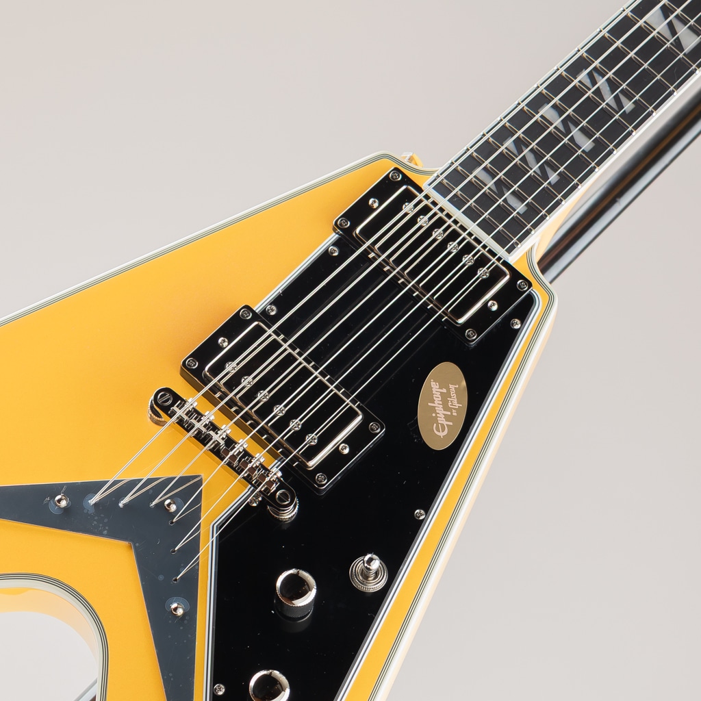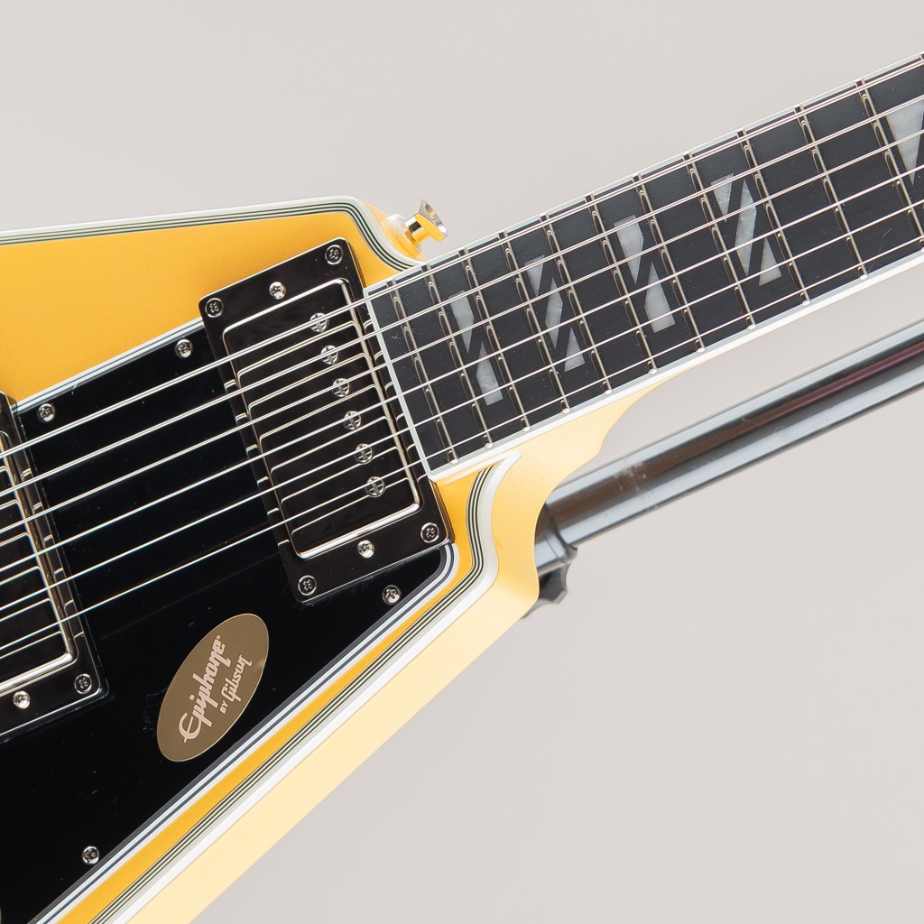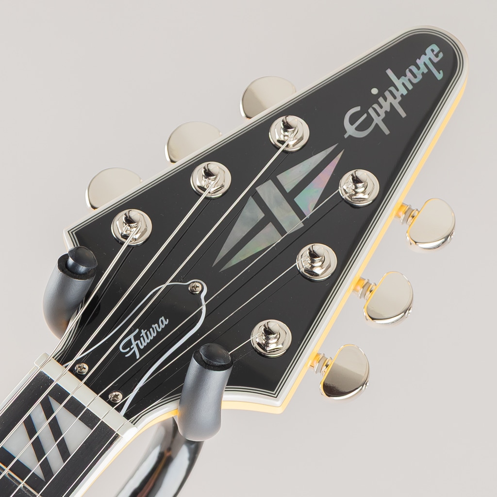 ギブソン フライングVは、エレキギターの歴史において最もアイコニックで冒険的なデザインのひとつであり続けています。1950年代後半に初めて登場したその未来的なシェイプは時代を先取りしており、やがて世界中のロックやメタルのプレイヤーたちの間で愛用されるようになりました。エピフォンが自信を持って発表するFutura Flying V Customは、その画期的なデザインを現代的に解釈した印象的なモデルです。角張ったマホガニー・ボディにはエレガントな7プライ・トップ・バインディングが施され、優れたサステインとチューニングの安定性を約束するLockTone Tune-O-MaticブリッジとLockToneストップバー・テイルピースを装備しています。Posi-Lokストラップボタンは、追加のハードウェアなしでストラップを安全に固定します。
