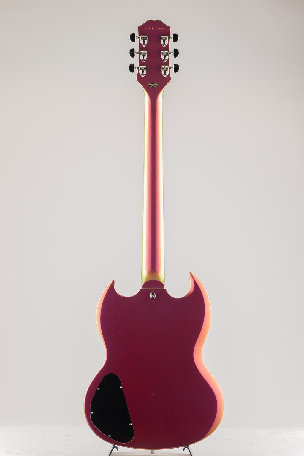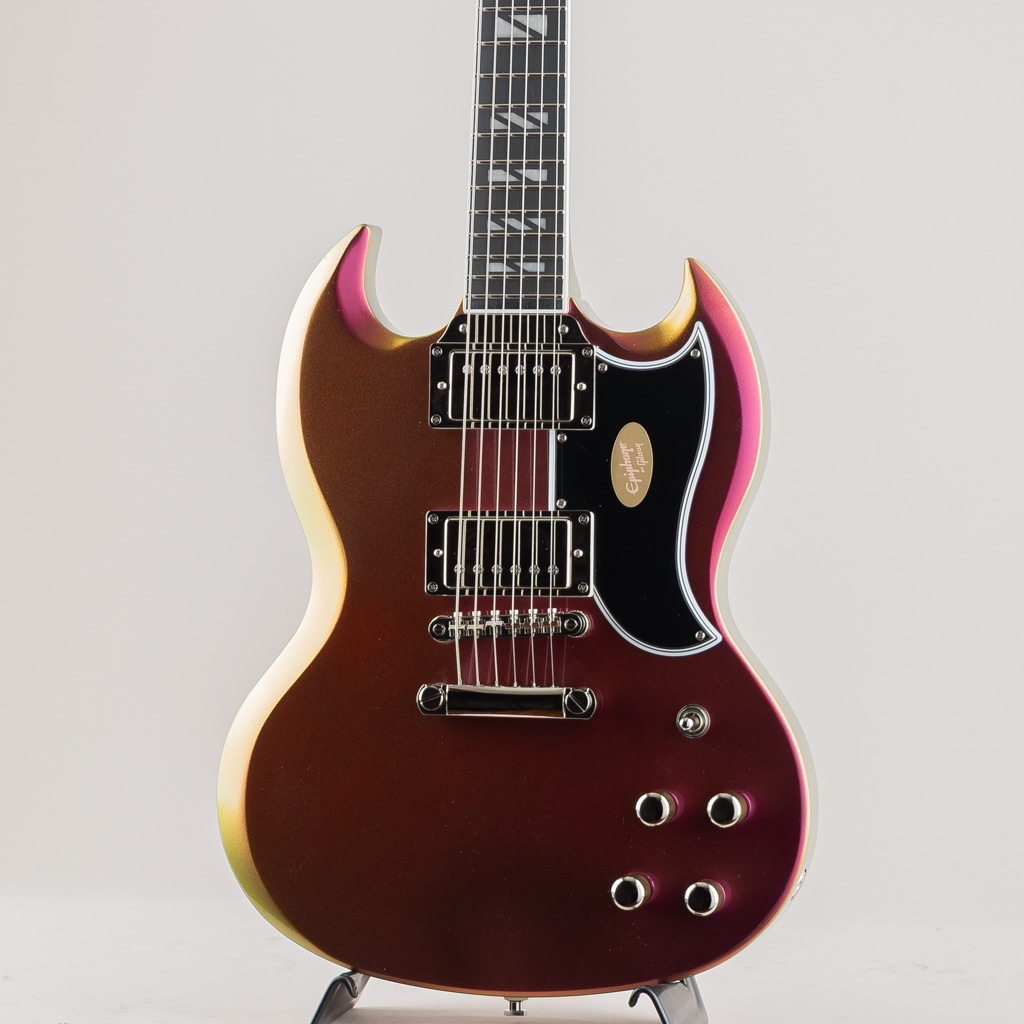 ギブソン SGは、1961年の登場以来、ギブソンで最もアイコニックなソリッドボディ・モデルのひとつであり続けています。もともとはレスポールの再設計モデルとして導入されましたが、すぐに「Solid Guitar」の略称である「SG」として独自のアイデンティティを確立しました。エピフォンが自信を持って発表するFutura SG Customは、60年以上を経てもなお洗練されたアグレッシブなスタイルを放つ、この伝説的なデザインを現代的に解釈したモデルです。ダブルカッタウェイのマホガニー・ボディは、視覚的な魅力と演奏の快適さを両立するクラシックなSGのコンターを継承しています。ハードウェアには、優れたサステインとチューニングの安定性を約束するLockTone Tune-O-MaticブリッジとLockToneストップバー・テイルピース、そして安全なパフォーマンスを支えるPosi-Lokストラップボタンを装備しています。