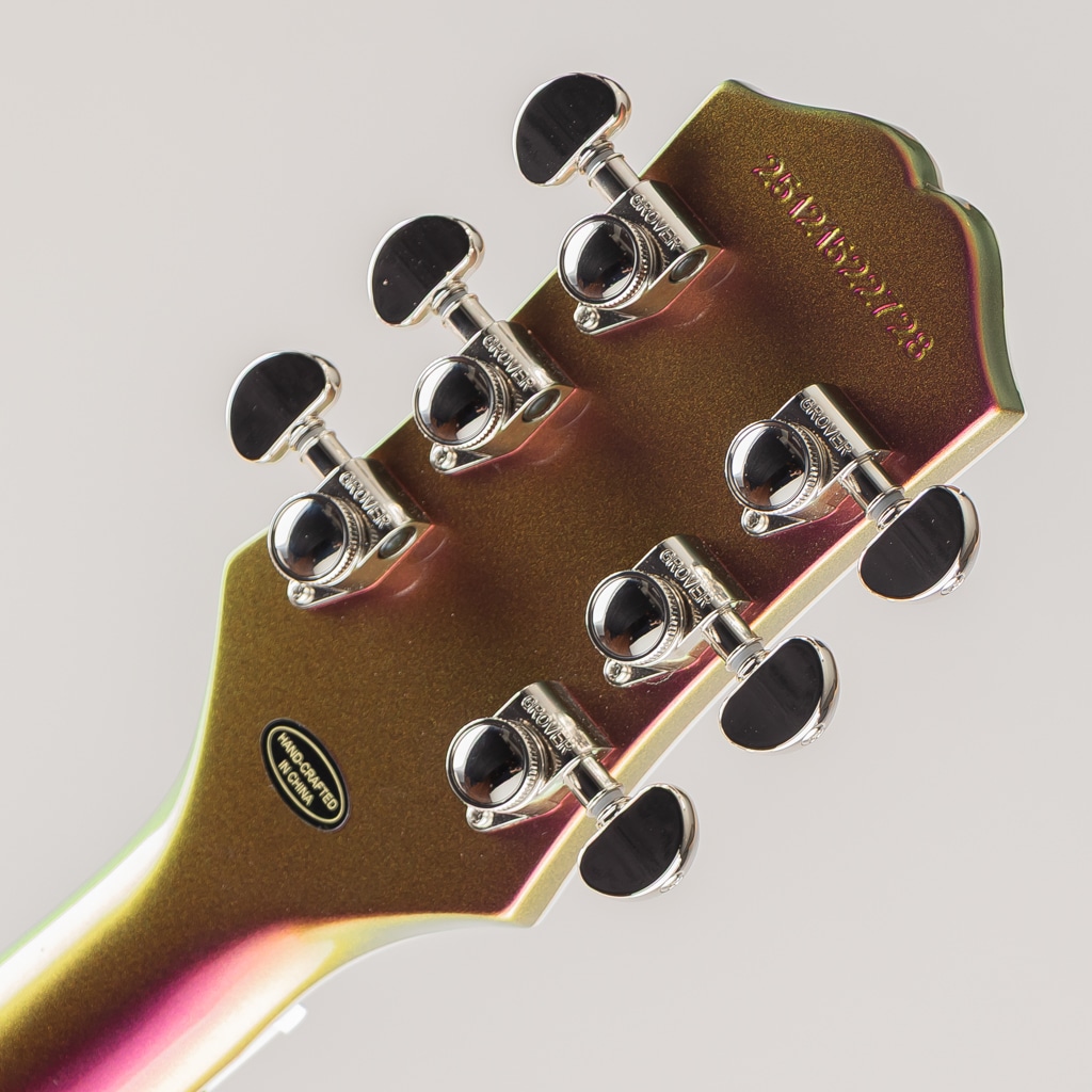 セットネック構造のマホガニー・ネックは、素早い運指を可能にするモダンCプロファイルを採用。バインディングが施されたエボニー指板には、22本のステンレス・スチール・ミディアムジャンボ・フレット、Super 400スタイルのパーロイド・スプリットブロック・インレイ、そしてスムーズなコードワークとチョーキングを実現する10~14インチのコンパウンド・ラジアスが採用されています。バインディング仕様のカラマズー・ヘッドストックには、ロッキングGrover RotomaticチューナーとGraph Techナットを備え、エピフォン・ロゴとカスタム・スプリットダイヤモンド・インレイがマザー・オブ・パールで施されています。