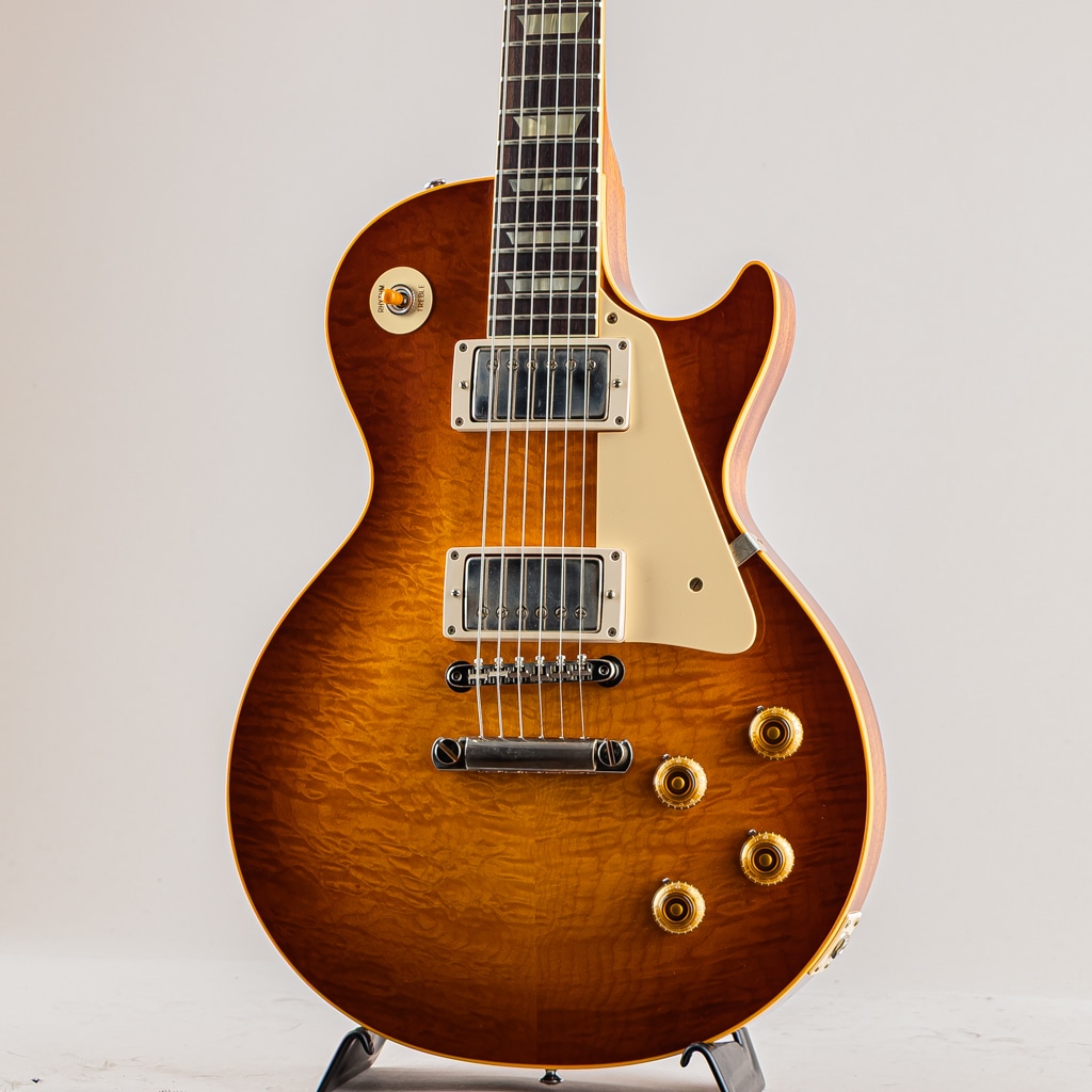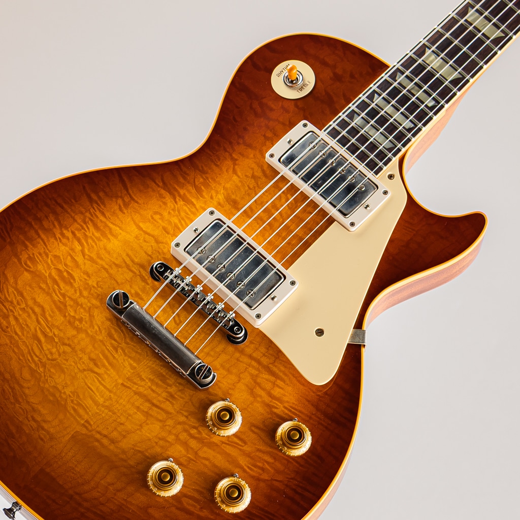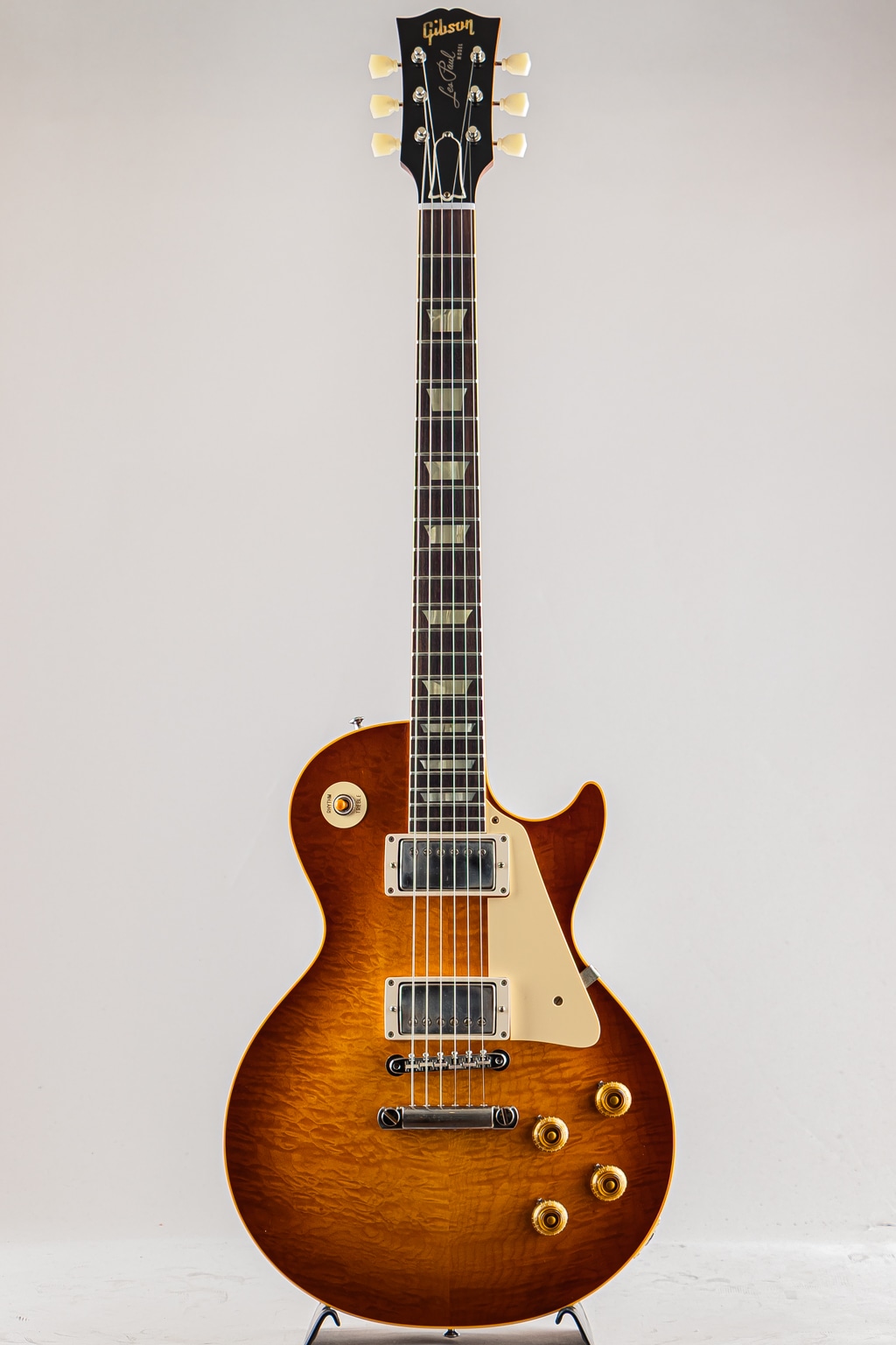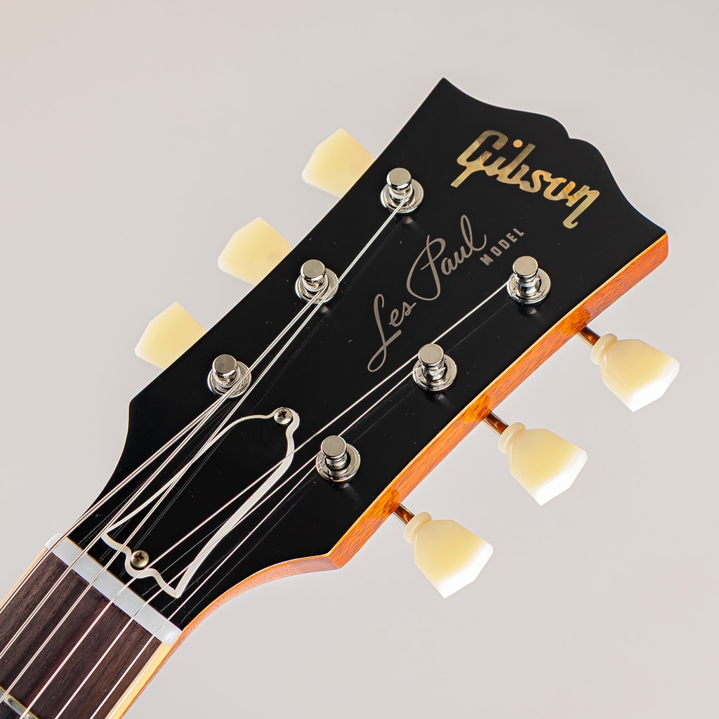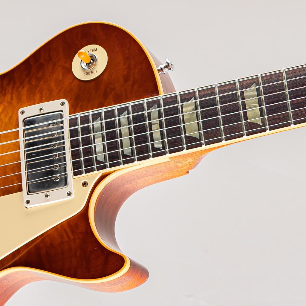 ウッドマテリアルは、ハンドセレクト・フィギュアドメイプル / ソリッド・マホガニーバック / ソリッド・マホガニーネック / ローズウッド指板にて構成。細やかな鱗のようなフレイムが特徴的なメイプルトップは、まるでキルトメイプルかのようなきめ細やかさがありつつ、しっかりと杢目の深さを感じられるトップ材でございます。カラーには"ゴールデン・ポピー・バースト"を採用し、フィニッシュはVOSを採用致しました。本機の重量は3.9kgとなり、偏りを感じさせないボディバランスで、ネックシェイプは人気の59 ミディアムCシェイプを採用しております。その他、近年リファインされたより当時に近いヘッドトップの“Gibson”&“Les Paul”ロゴ、指板のディッシュインレイ素材の色味、サーキット内のポットやバンブルビーコンデンサーもビンテージライクな仕様が採用。オールニカワ接着やトゥルーヒストリックパーツ採用等の基本仕様も、勿論採用されております。