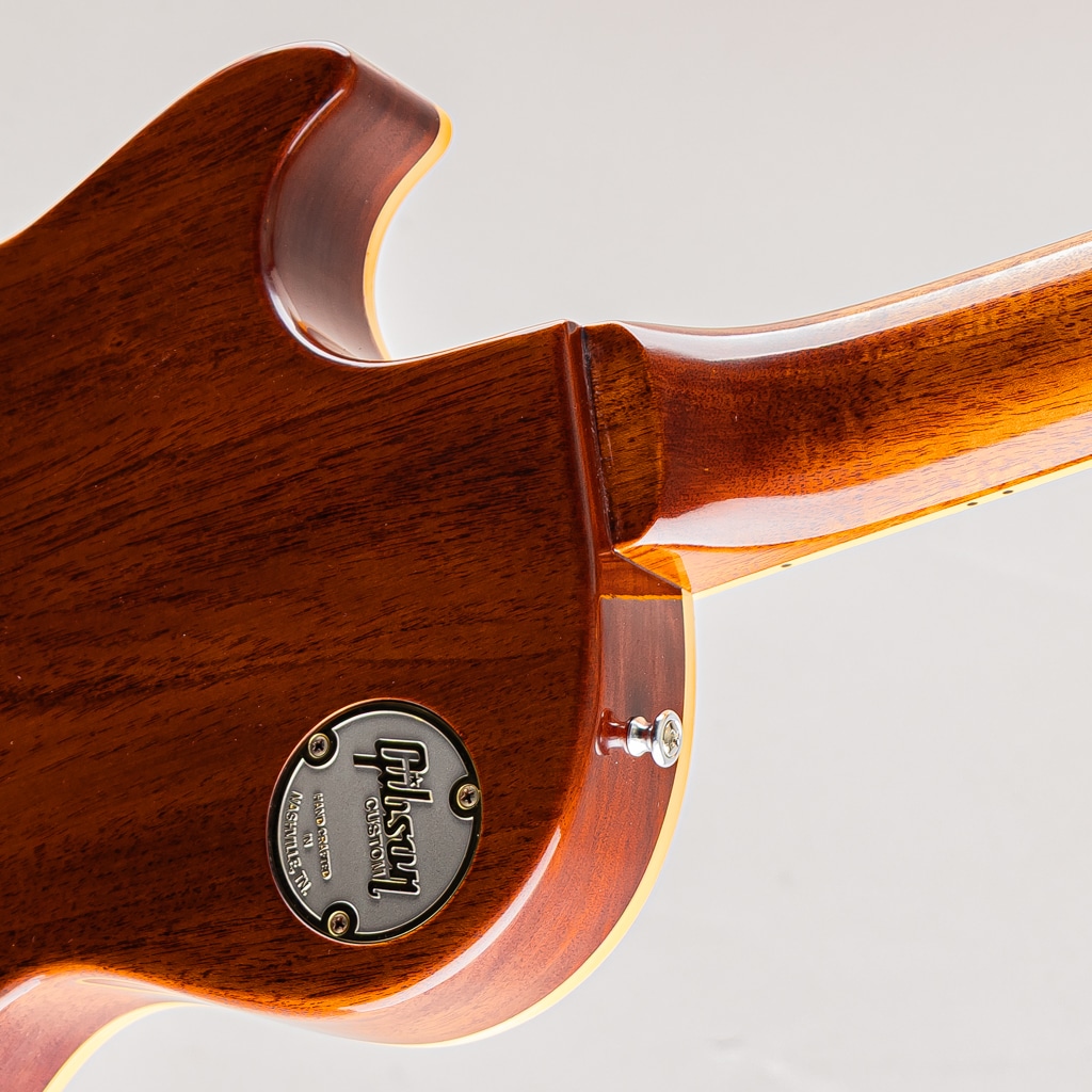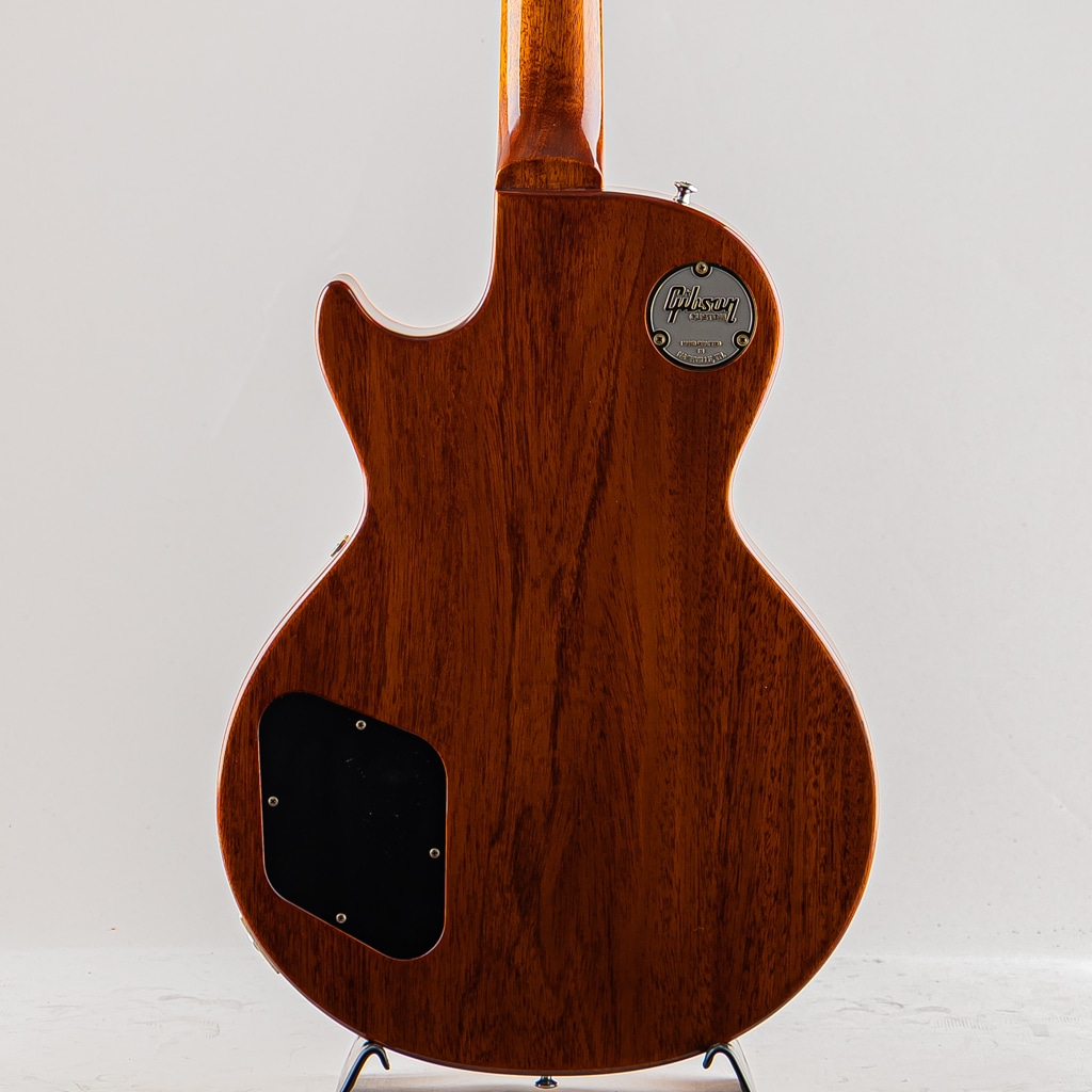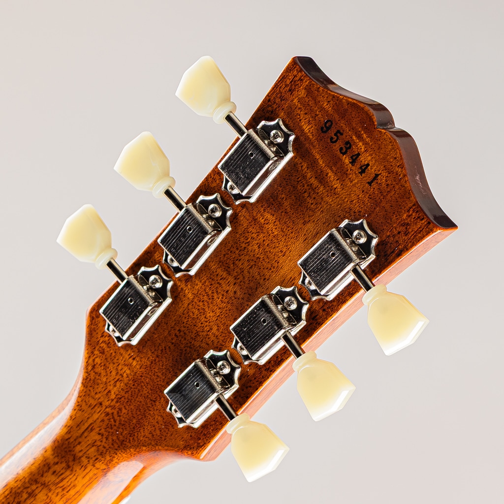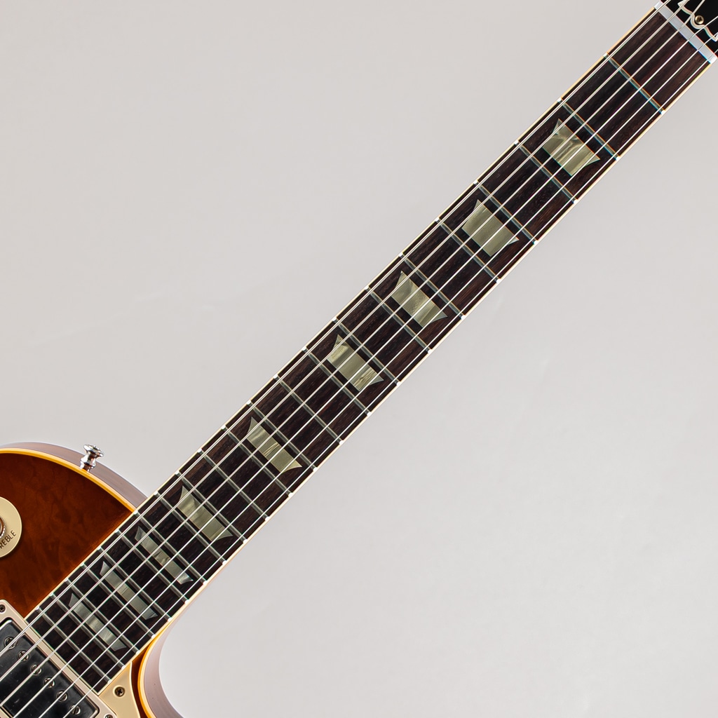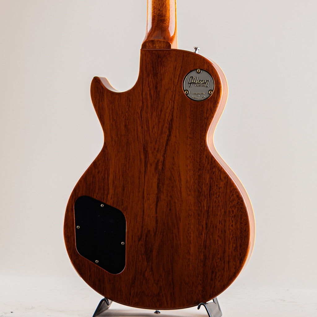 ウッドマテリアルは、ハンドセレクト・フィギュアドメイプル / ソリッド・マホガニーバック / ソリッド・マホガニーネック / ローズウッド指板にて構成。細やかな鱗のようなフレイムが特徴的なメイプルトップは、まるでキルトメイプルかのようなきめ細やかさがありつつ、しっかりと杢目の深さを感じられるトップ材でございます。カラーには"ゴールデン・ポピー・バースト"を採用し、フィニッシュはVOSを採用致しました。本機の重量は3.9kgとなり、偏りを感じさせないボディバランスで、ネックシェイプは人気の59 ミディアムCシェイプを採用しております。その他、近年リファインされたより当時に近いヘッドトップの“Gibson”&“Les Paul”ロゴ、指板のディッシュインレイ素材の色味、サーキット内のポットやバンブルビーコンデンサーもビンテージライクな仕様が採用。オールニカワ接着やトゥルーヒストリックパーツ採用等の基本仕様も、勿論採用されております。