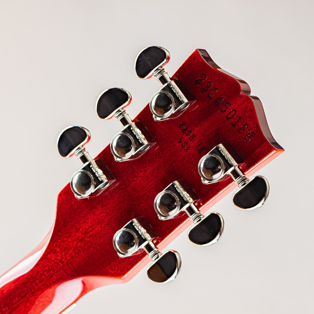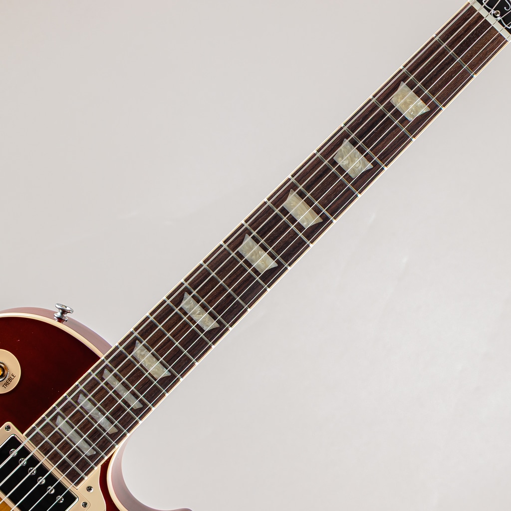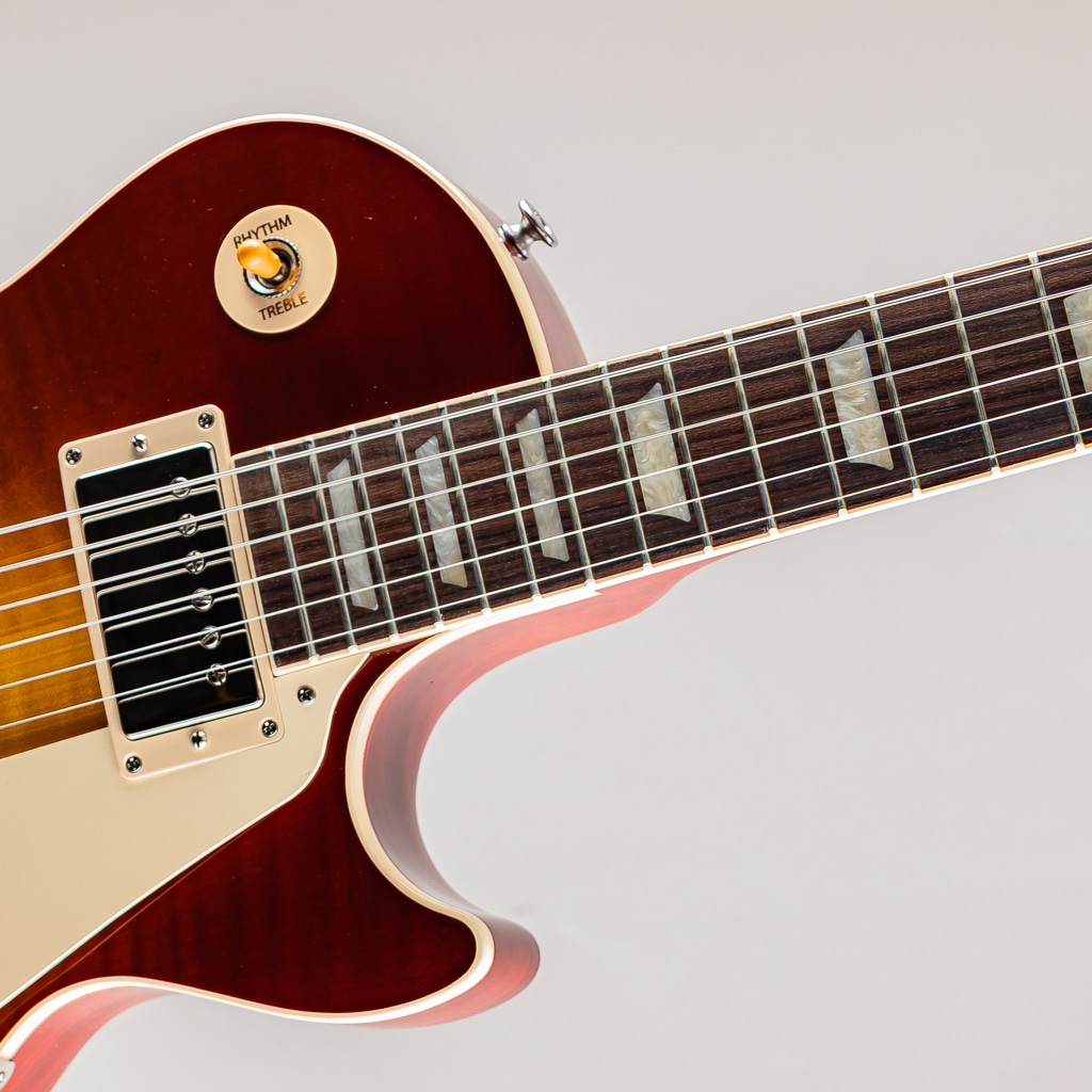 幾多のマイナーチェンジ・仕様変更を経てその時代のスタンダードとして生産され続けていた当モデルですが、今回は原点回帰的な仕様の'50s&'60sの2モデルとなって登場しました。ウェイトリリーフ(肉抜き軽量化)を無くしたソリッドマホガニーボディにメイプルトップ。ローズ指板にマホガニーネックは50s系プロファイルよりやや薄めで演奏性を高めたスリム・テーパーグリップで、滑らかに処理された指板サイドエッジやミディアムジャンボフレットもありさらに演奏性を向上。ピックアップには60's Burstbuckerを、コンデンサーにはオレンジドロップを搭載。コントロールはセレクター・各ボリューム&トーンのシンプルで簡単なサーキットレイアウトとなっております。