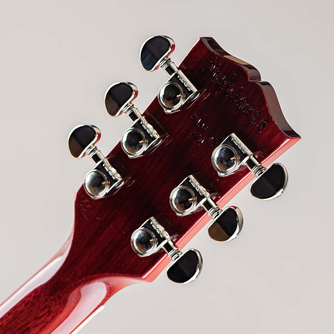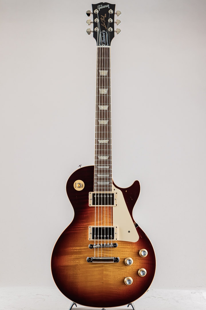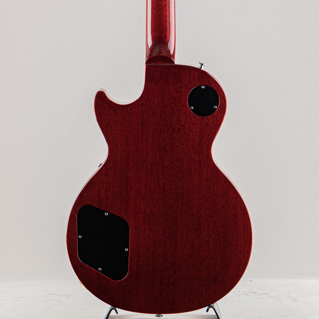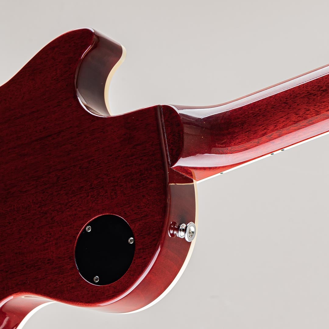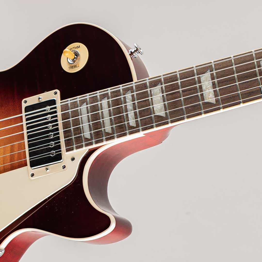 幾多のマイナーチェンジ・仕様変更を経てその時代のスタンダードとして生産され続けていた当モデルですが、今回は原点回帰的な仕様の'50s&'60sの2モデルとなって登場しました。ウェイトリリーフ(肉抜き軽量化)を無くしたソリッドマホガニーボディにメイプルトップ。ローズ指板にマホガニーネックは50s系プロファイルよりやや薄めで演奏性を高めたスリム・テーパーグリップで、滑らかに処理された指板サイドエッジやミディアムジャンボフレットもありさらに演奏性を向上。ピックアップには60's Burstbuckerを、コンデンサーにはオレンジドロップを搭載。コントロールはセレクター・各ボリューム&トーンのシンプルで簡単なサーキットレイアウトとなっております。