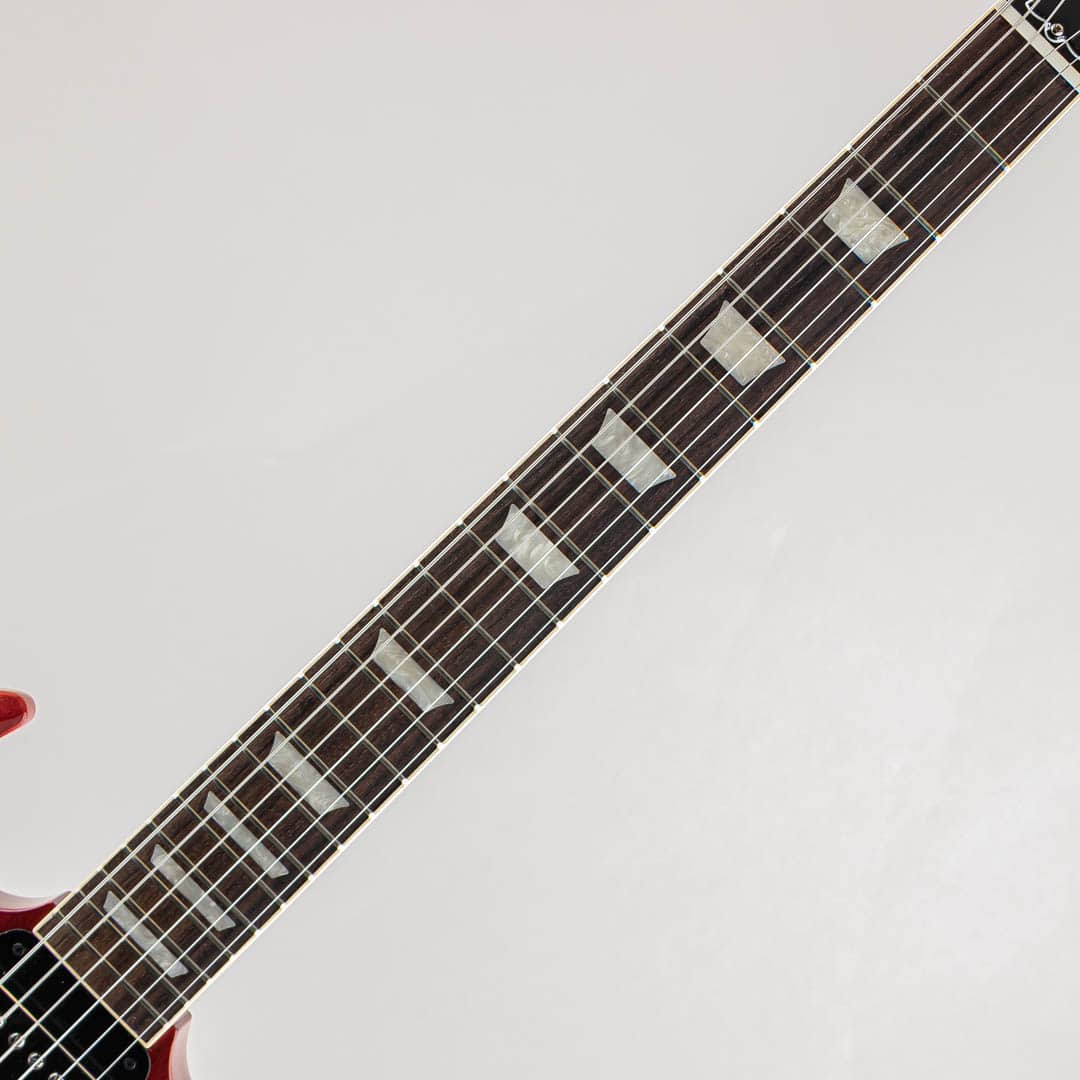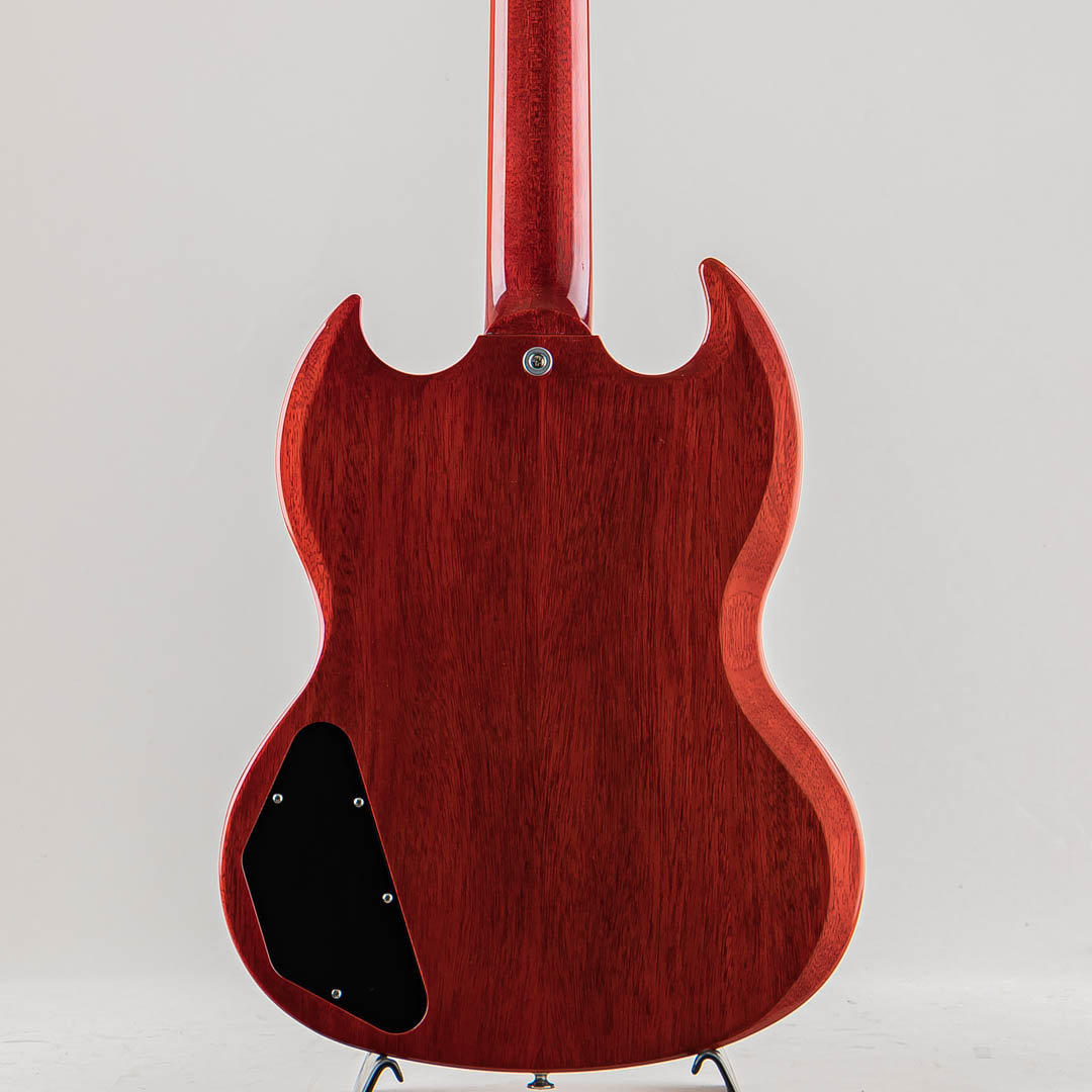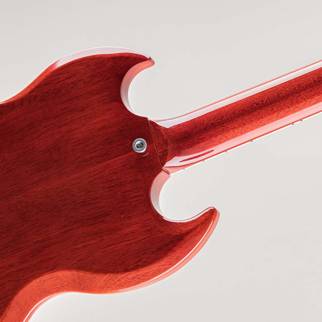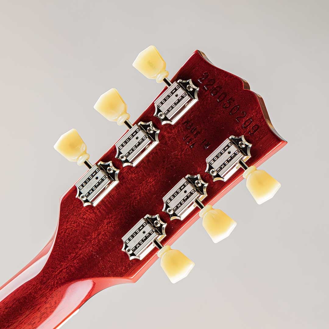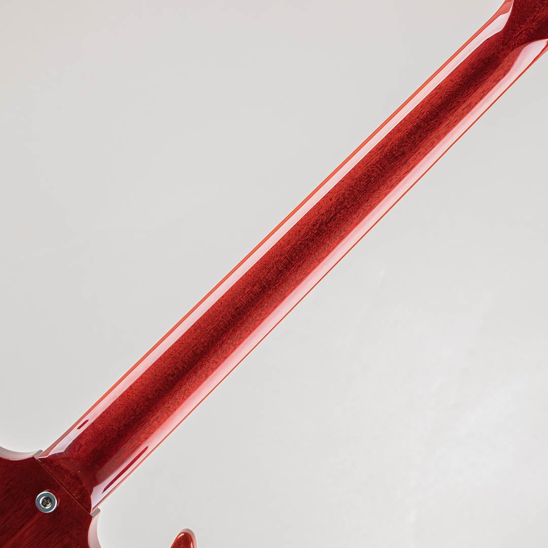 ベースはSG Standard '61モデルでマホガニーボディ&ネック/ローズ指板の基本的なウッドスペック、指板バインディングにはクリームカラーをチョイス。ペグにはクルーソンタイプを採用。またジョイント・ヒール部の再現度も増しており、ABR-1ブリッジなど、往年のスペックを搭載した充実のスペックとなっております。ピックアップにはBurstbucker 61を2機搭載。パワフルかつ軽快なミッドレンジ、ドライブさせた際には数々の名リフを弾きたくなること間違いなしのグッドサウンドでございます。また、マエストロヴァイブローラーが搭載されることで、ストップテイルピースモデルに比べ、ヘッド落ちは軽減されているのポイントでございます。
