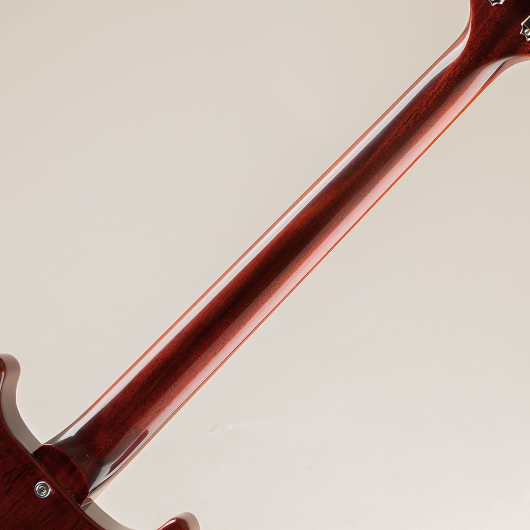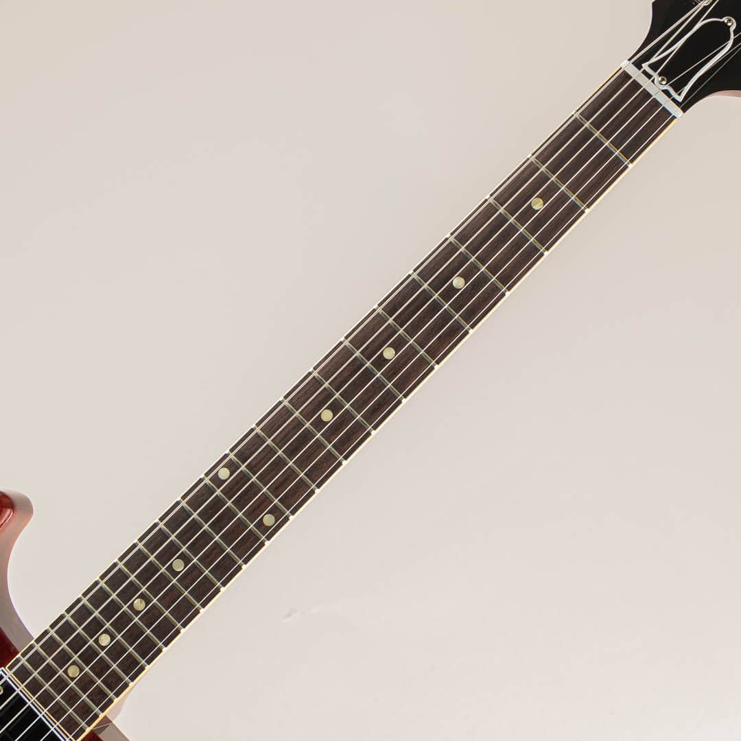 この度入荷いたしましたのは、1960 Les Paul Special Double Cut Reissue Cherry Red VOSでございます。発売当初、レスポールモデルの中級モデルとしてデビューしたレスポールスペシャル。シングルカッタウェイにフラットトップ、そしてP-90を2機搭載。どこか愛嬌の感じられる見た目は様々なプレイヤーに愛され続けられているモデルでございます。スペシャルは59年ごろからダブルカッタウェイ仕様となり、本機は59年中期ごろからフロントピックアップがブリッジ側に近づいたスタイルのリイシューモデル。ウッドスペックはマホガニーボディ/マホガニーネック/ローズ指板となり、ネックシェイプには60年ごろの細身のスタイルを再現した1960 Slim Taperをチョイス。約42mmのナット幅、ダブルカッタウェイ仕様と相まってストレスフリーな演奏性が確保されております。ピックアップにはP-90を2機搭載。マホガニーから鳴る芳醇で伸びやかな響きがありながらも、切れ味が鋭いサウンド。軽くクランチさせコードプレイを楽しむのもおすすめですが、カッティングプレイでお楽しみ頂くのもおすすめでございます。その他、近年リファインされたより当時に近いヘッドトップの“Gibson”&“Les Paul”ロゴ、指板のディッシュインレイ素材の色味、サーキット内のポットやコンデンサーもビンテージライクな仕様が採用。オールニカワ接着やトゥルーヒストリックパーツ採用等の基本仕様も勿論継承。オリジナルハードケース、認定証、タグ類、ユーザー登録カードが付属いたします。是非ご検討の程を。