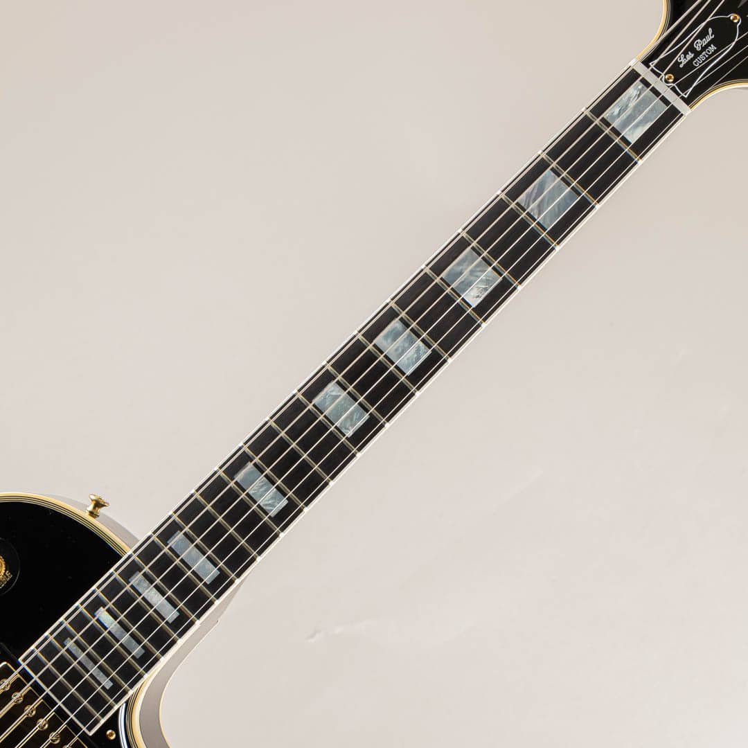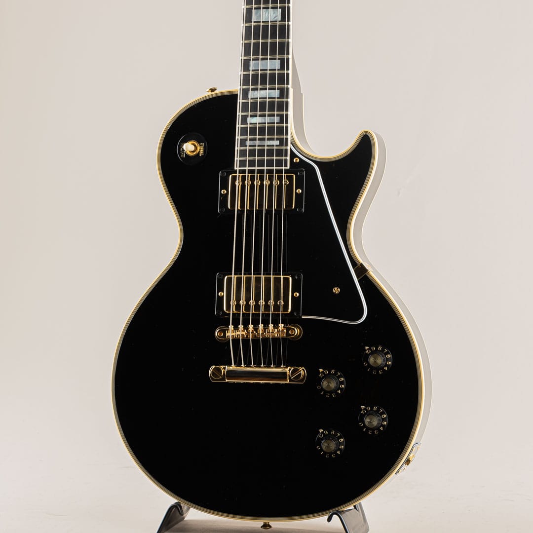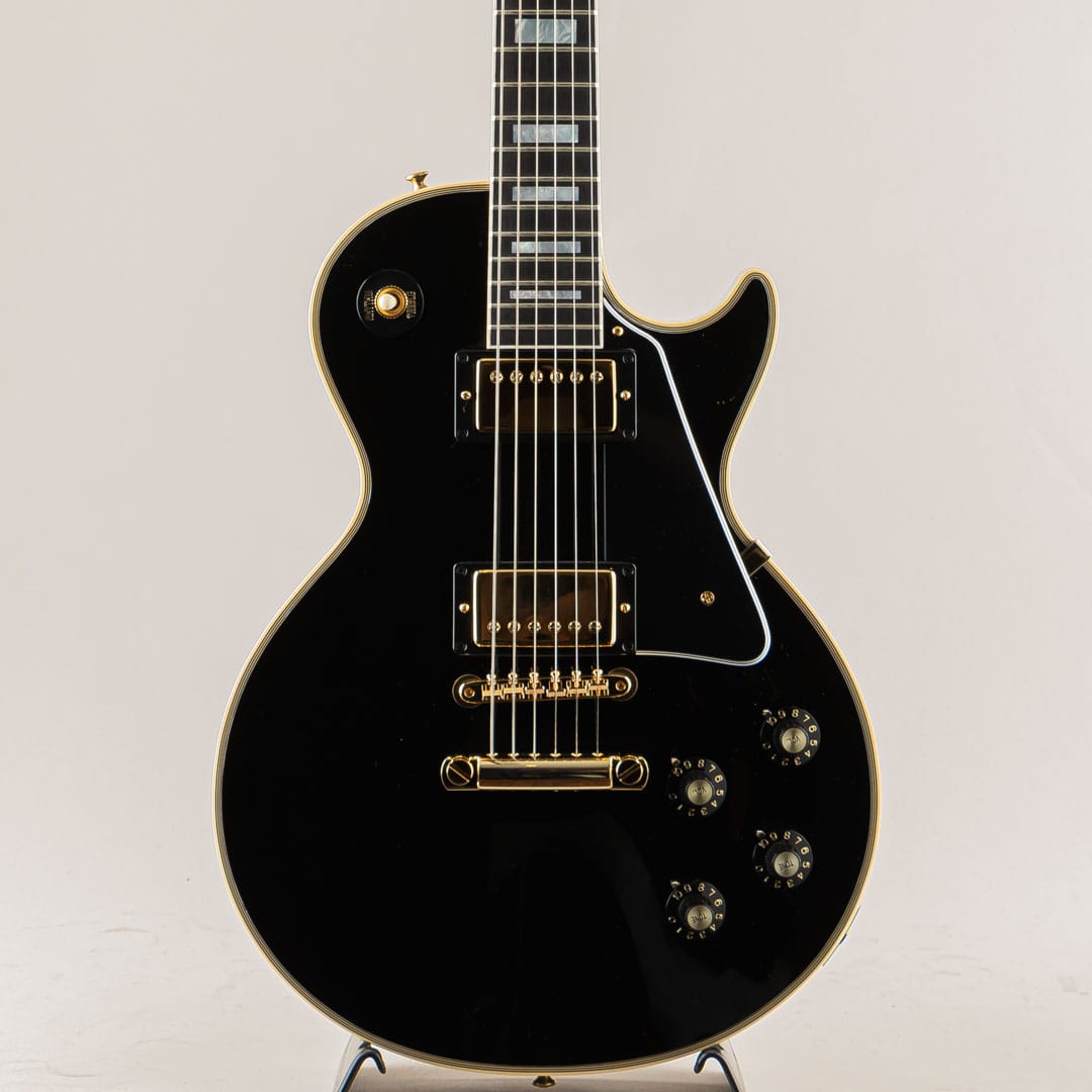 この度入荷いたしましたのは、Les Paulモデルの中でも最上位グレードとして開発されたLes Paul Customでございます。エボニー指板にマザーオブパールのポジションインレイ、ボディには7層のマルチバインディング。オールエボニーカラーのボディとゴールドハードウェアがあしらわれ、豪華でありながらもどこか凛とした佇まいを感じさせる抜群のルックスでございます。