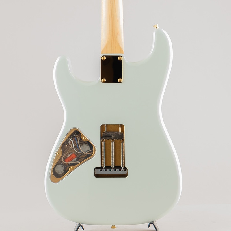 最小限のカットに抑えられたエルボーコンターはゴールドに塗装され、さらにアクリルのピックガードとコントロールパネルにより、ピックアップ、コントロール、スプリングのキャビティーまでゴールドに塗装されているのが見て取れます。 また本人の実機からプロファイルされたこだわりの太いネックとバックコンターをあえて無くした剛性の高いボディーに直付けにされたピックアップ”V-Mod II”と”Fat 50s”の組み合わせによってKenの理想のサウンドを実現しました。