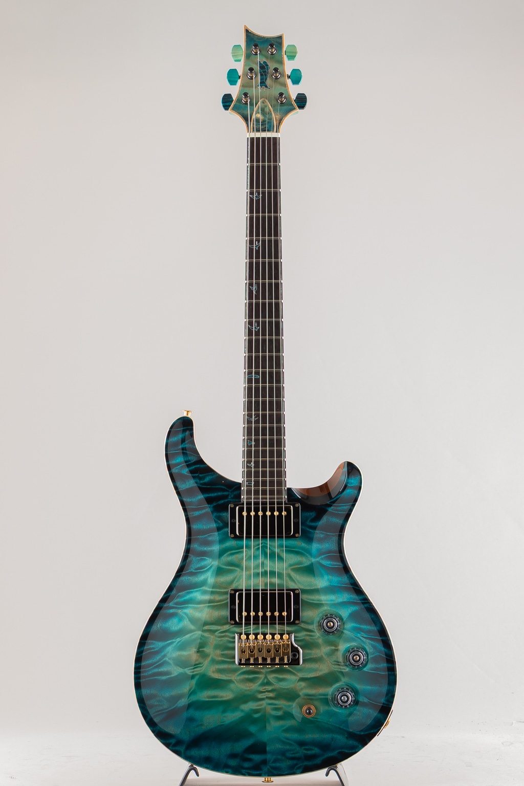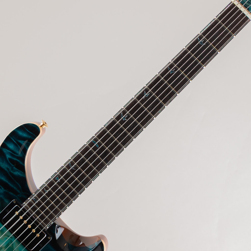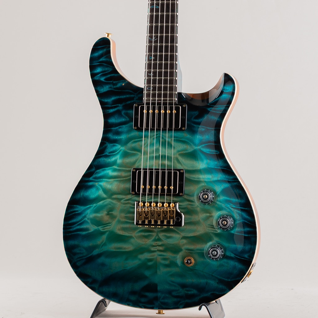 Hardware: Smoked Black / Gold PRS Gen III Tremolo Bridge, PRS Phase III Set-Screw Locking Tuning Pegs with Curly Maple Buttons stained to match, Quilted Maple Backplates, Quilted Maple Truss Rod Cover with Green Ripple Abalone Purfling, and a Bone Nut