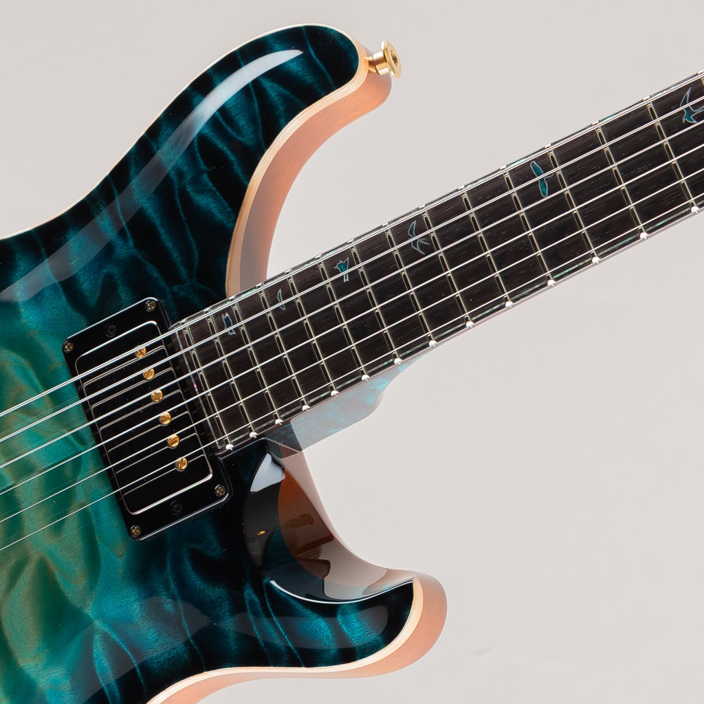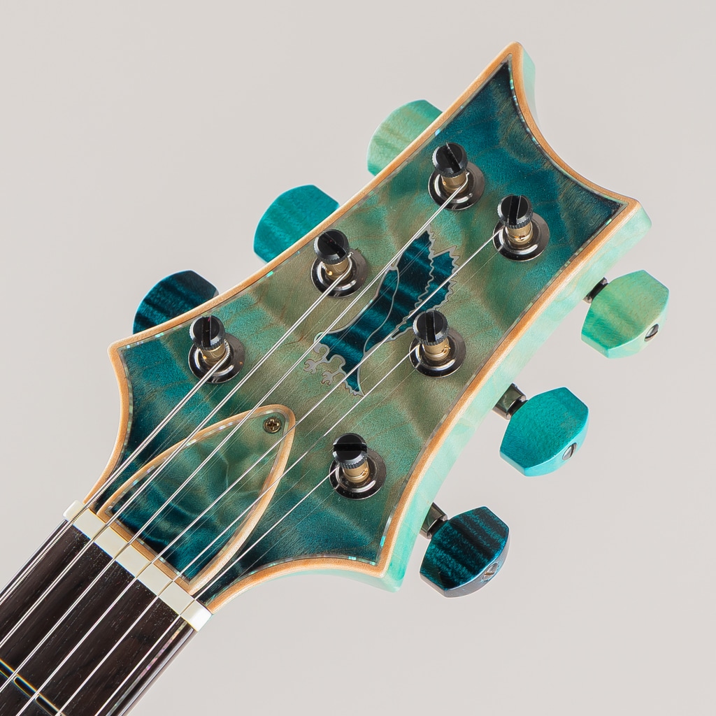 フィンガーボード & ヘッドストック・インレイは、ボディカラーに合わせて着色された “Curly Maple” を基調に “White Mother of Pearl” にてアウトラインを構成。 “Green Ripple Abalone” を用いたパーフリングと、フィンガーボード上を舞う “Offset Birds” スタイルのインレイが組み合わされ、Private Stockならではの華やかさと存在感を放つ仕上がりとなっております。
