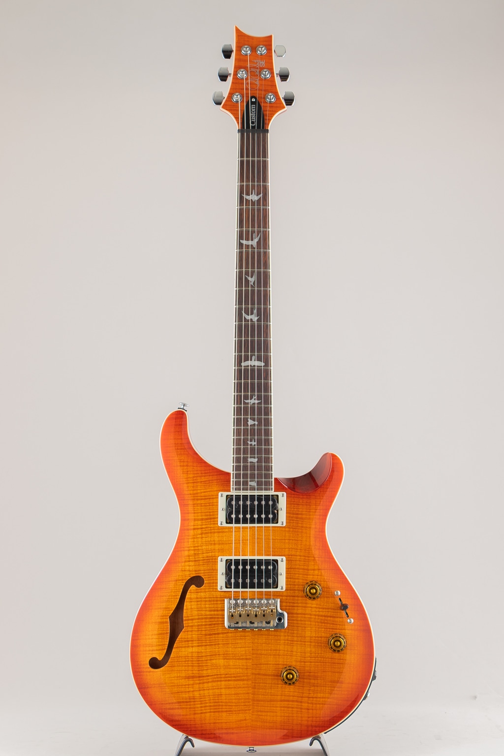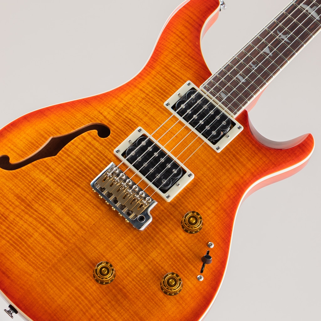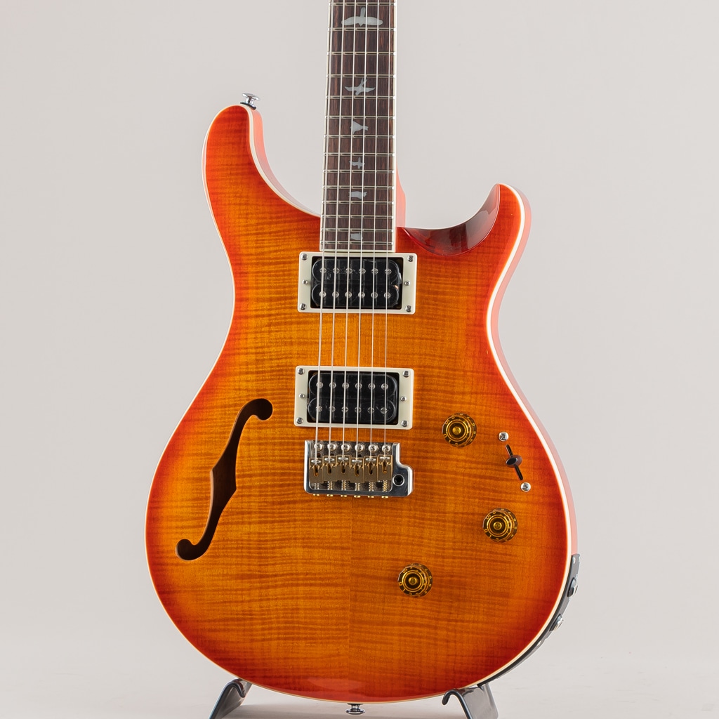 マッチングヘッドやヘッドストックと指板のバインディング、そしてランプシェード・ノブが織りなす洗練されたテデザインが優れたプレイやビリティと融合し、多彩なサウンドメイキングを可能にしたPRS SE Custom 24 Semi-Hollow Piezoは、ギタリストの幅広いニーズに応えることができるモデルです。