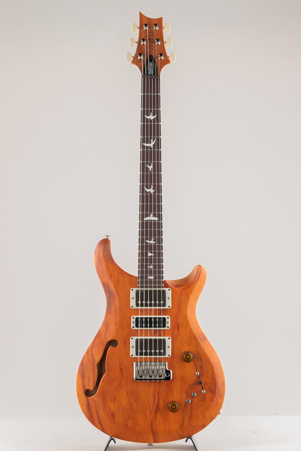 今回採用された木材の持つサウンド面における特性はあるものの、22フレット、25インチ・スケールのパターン・レギュラー・シェイプのネック、H-S-Hのピックアップ・レイアウト、ピック・アップ切り替え用の5wayブレード・スイッチ、コイル・タップ用の2つのミニ・トグル・スイッチといったS2 Special Semi-Hollow の核となる仕様は、そのまま引き継がれています。ハムバッカーのコイル・タップを含め、合計12通りのピックアップの組み合わせが可能となり、多彩なサウンドメイキングを実現した本モデルは、全世界700本限定での生産となります。
