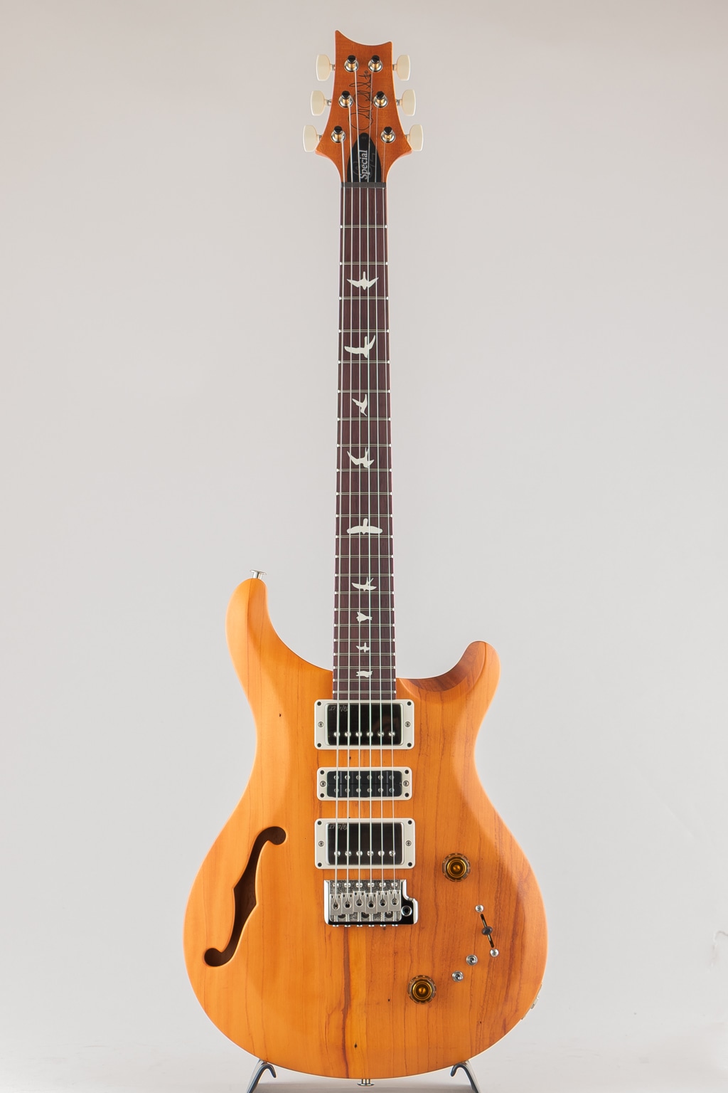 今回採用された木材の持つサウンド面における特性はあるものの、22フレット、25インチ・スケールのパターン・レギュラー・シェイプのネック、H-S-Hのピックアップ・レイアウト、ピック・アップ切り替え用の5wayブレード・スイッチ、コイル・タップ用の2つのミニ・トグル・スイッチといったS2 Special Semi-Hollow の核となる仕様は、そのまま引き継がれています。ハムバッカーのコイル・タップを含め、合計12通りのピックアップの組み合わせが可能となり、多彩なサウンドメイキングを実現した本モデルは、全世界700本限定での生産となります。