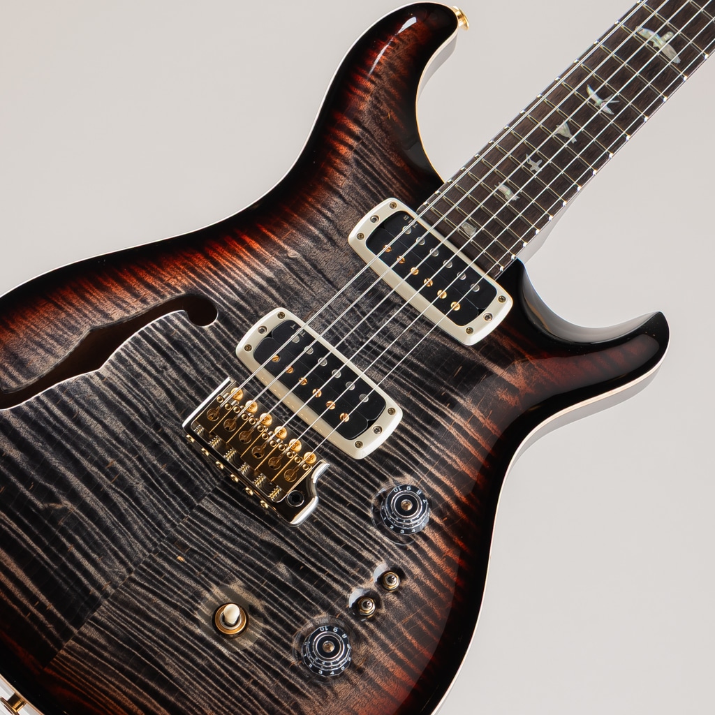 本モデルには10-Topグレードのフィギュアド・メイプル・トップ、マホガニー・バック&ネック、ジリコテ指板を使用し、全てPRS独自の木材乾燥プロセスを経て、環境の変化に強く安定したネックと、弦振動を最大限に活かすボディとなっています。さらに、Fホールを兼ね備えたセミホロウ構造を採用することで、エレガントなルックスに加え、深みと奥行きのある上質なトーンを生み出します。