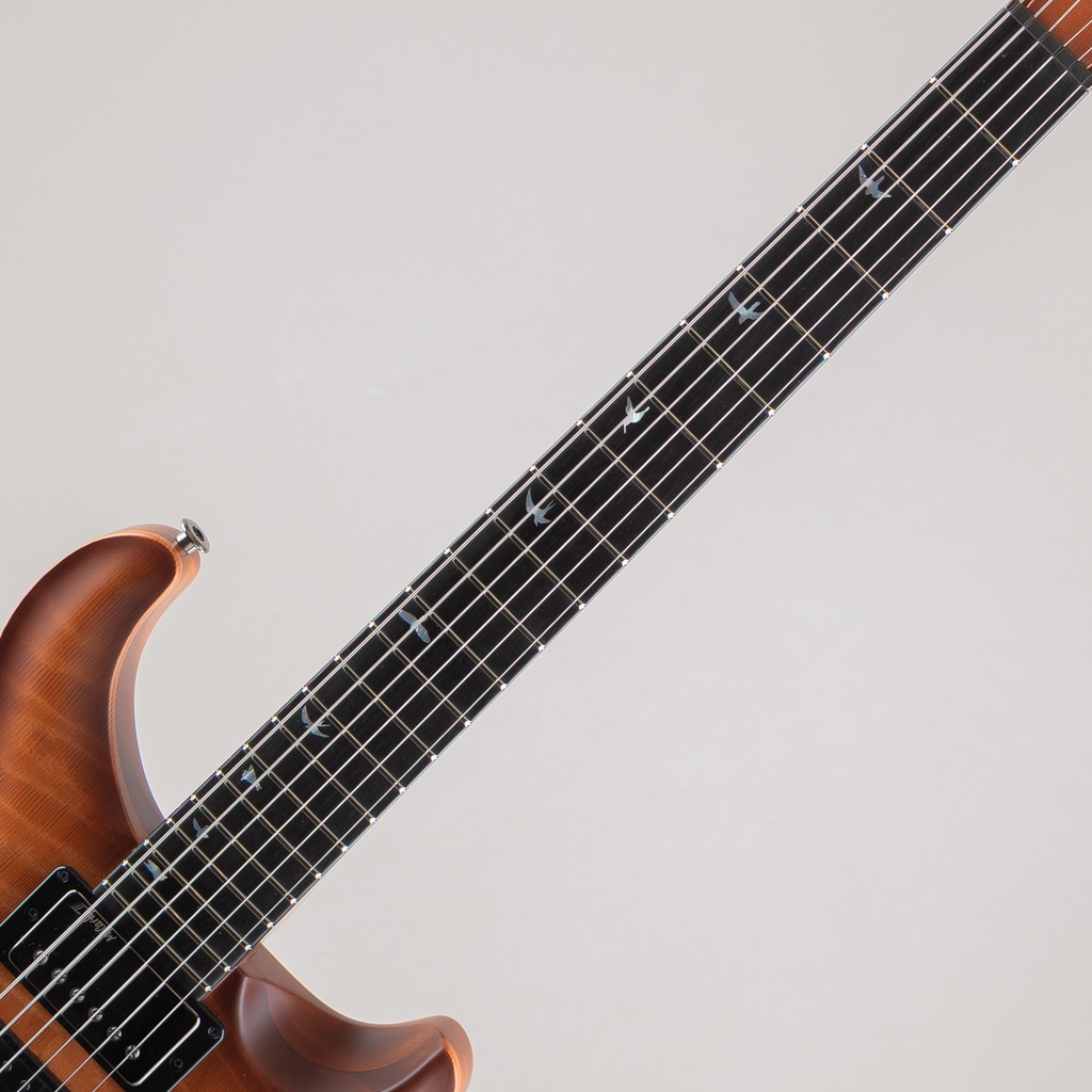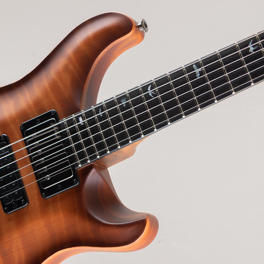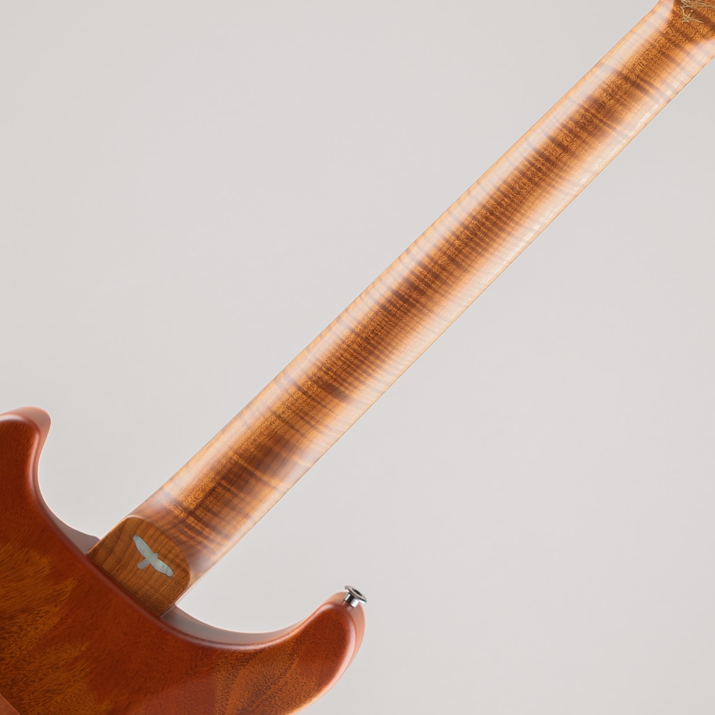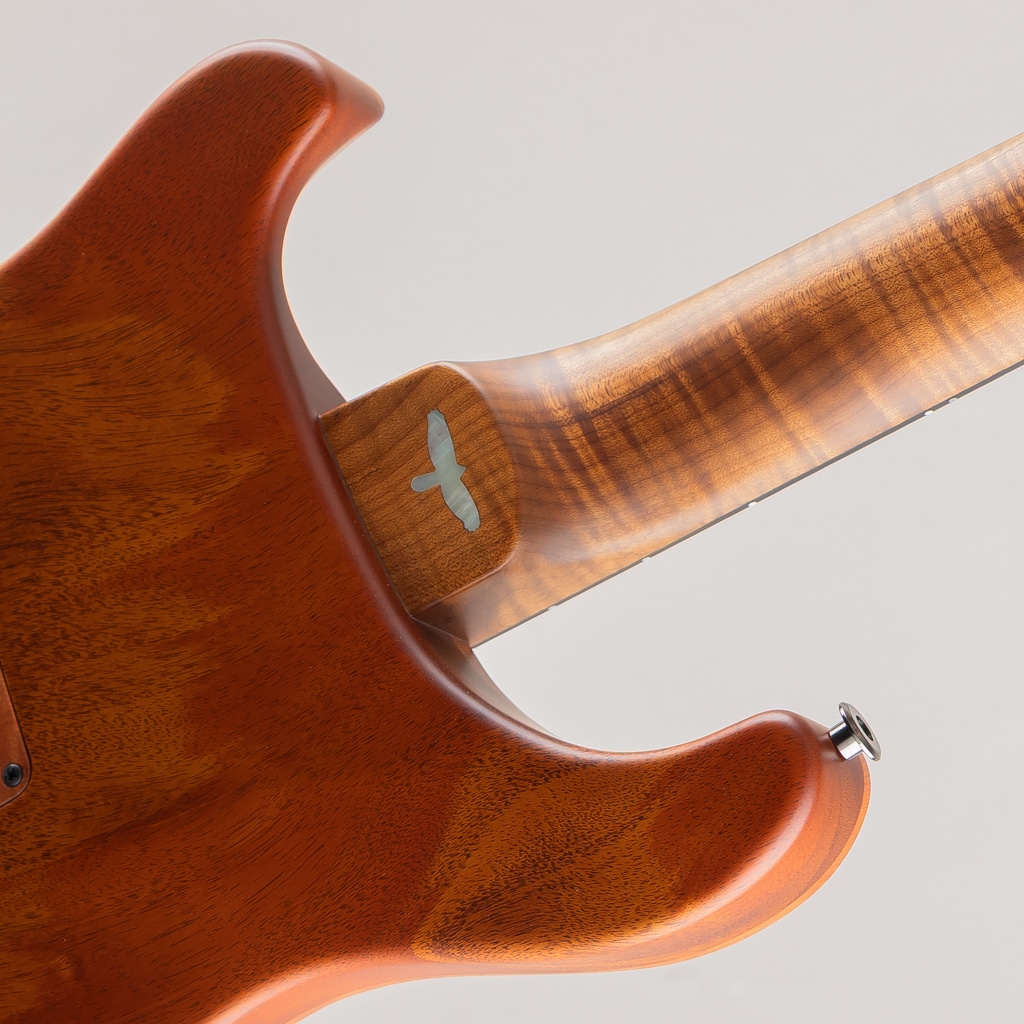 ネック材には光や見る角度によって様々な表情をお楽しみいただける "Roasted Curly Maple"、フィンガーボードには黒々とした "Ebony" を用いており、インレイは “White Mother of Pearl” にて設えた “Offset Birds” / “Privale Stock Eagle” が輝きフィンガーボード材やボディ材との対比によりシンプルながら存在感のある仕上がりでございます。