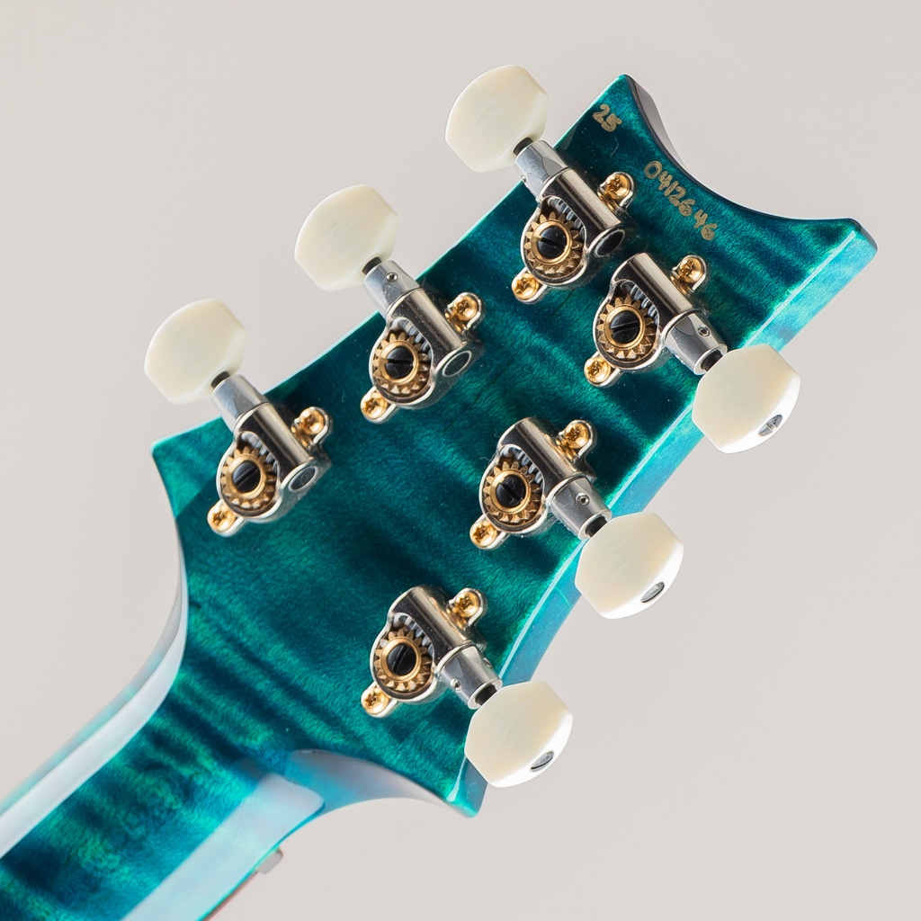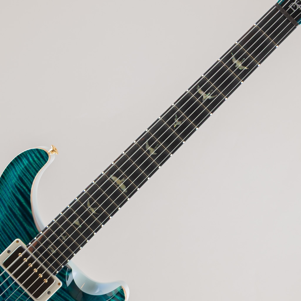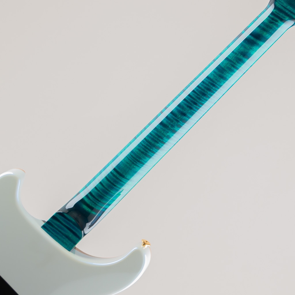 ネック部はボディトップ同様、鮮やかなカラーが目を惹くステインド仕様の "Figured Maple" ネック/ "Ebony" フレットボードのウッドマテリアル。